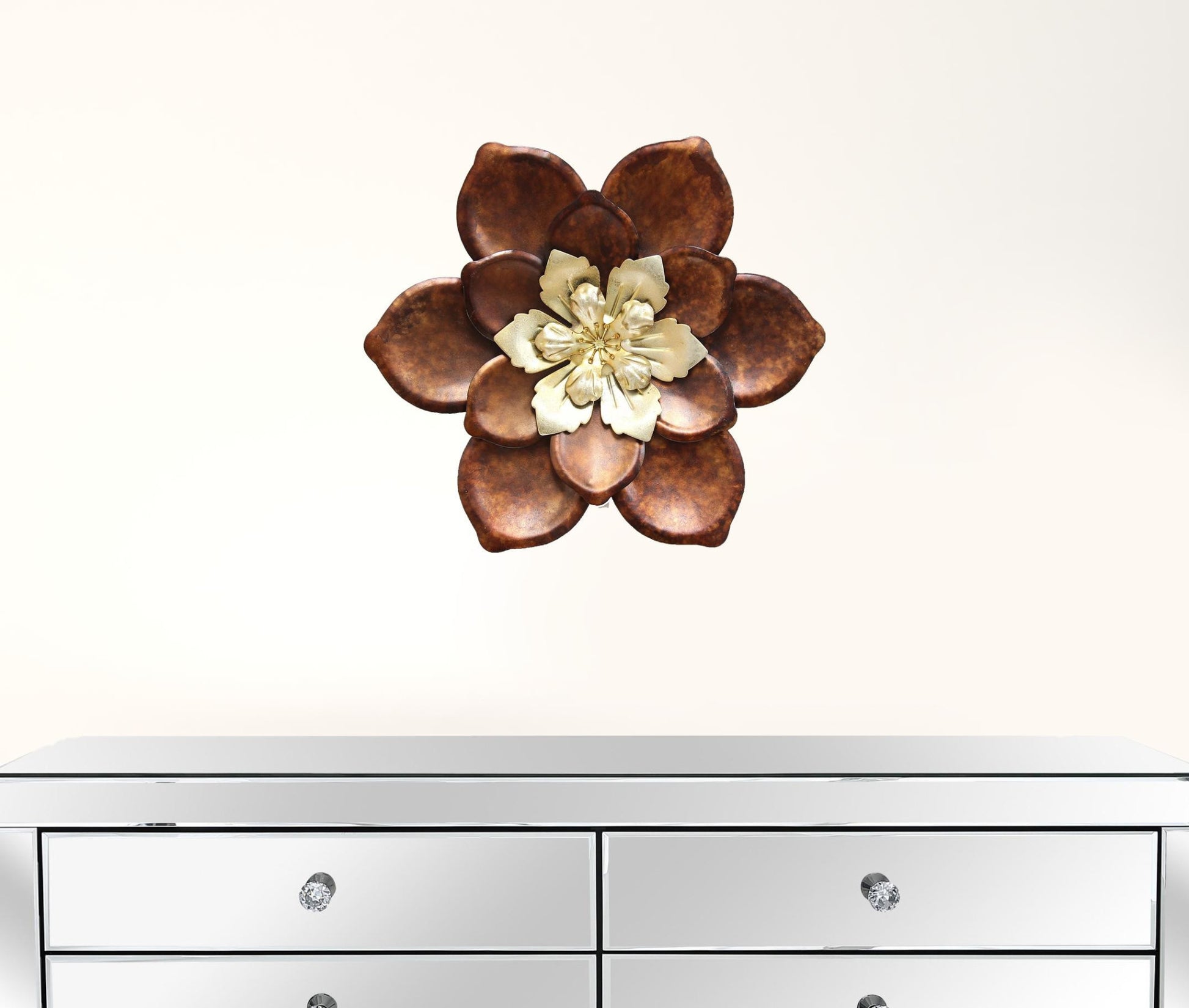 Create an impression that lasts long by making a grand statement in home decor with our whimsical flower wall decor. This beautiful piece features decorative floral design accented by a distressed bronze finish to elicit a chic visual vibes in any room. Whether you need a unique wall art in your study, dressing room or living room, this stunning art will perfectly accentuate any room decor. Rustic style Iron Attached keyhole hanging method Vertical hanging orientation Wipe clean with damp cloth. It is 12.4" X 1.57" X 12.4".