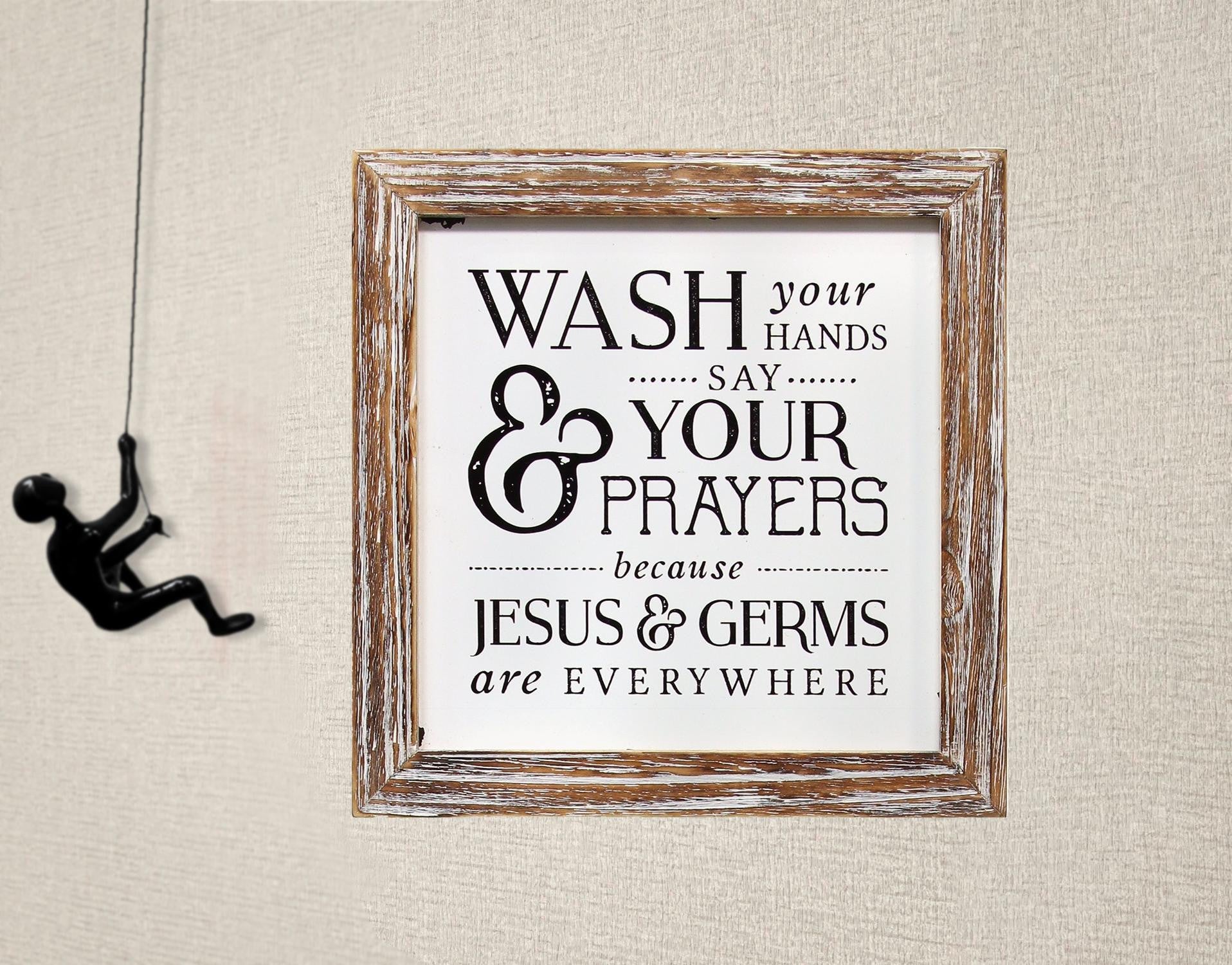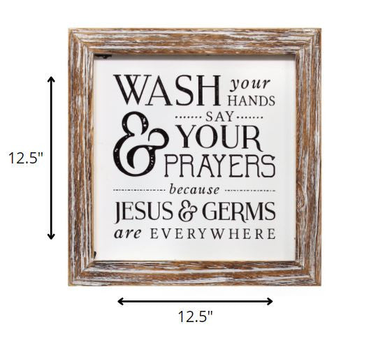 Add a fun and meaningful decoration to any room with this Distressed Brown Wash Your Hands Wall Art. This handcrafted natural wood framed metal plaque with a black imprinted saying serves as a charming reminder. Emblazoned with the phrase "Wash Your Hands and Say Your Prayers because Jesus and Germs are Everywhere", family and guests are sure to appreciate the thoughtful message and uplifting style this square wall art brings to your bathroom, mudroom, kitchen, or hallway. 12.5" H X 12" W X 1.97" D.