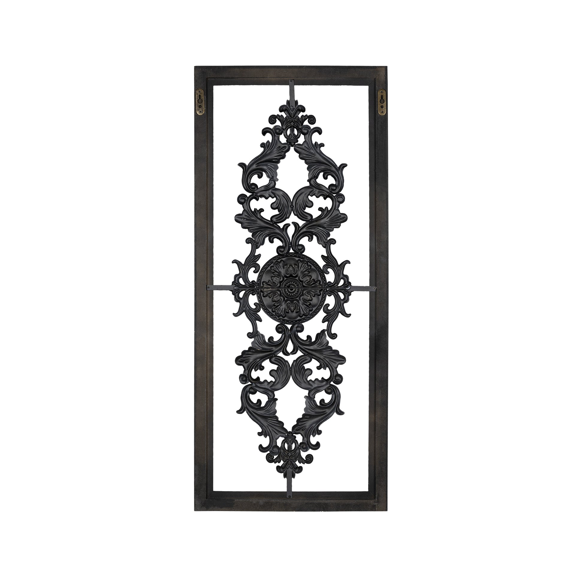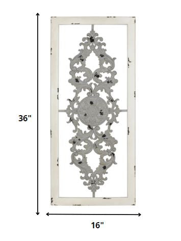 This scroll panel wall decor will look extremely cool on your wall. Handcrafted from metal and wood, the scroll wall art is designed to add warmth and classic style to your existing room decor, whether in the living room, bedroom or study. Featuring ornate scroll panel carved out of distressed gray metal that is complemented by a charming distressed white frame, this piece will readily blend with any home decor. Rustic style 70% Metal 30% wood Two keyholes hanging method Vertical or horizontal hanging orientation Wipe clean with damp cloth - Item is handmade and painted by skilled artisans - Product may have some variances in comparison to photo shown. It measures 36" X 0.63" X 16".