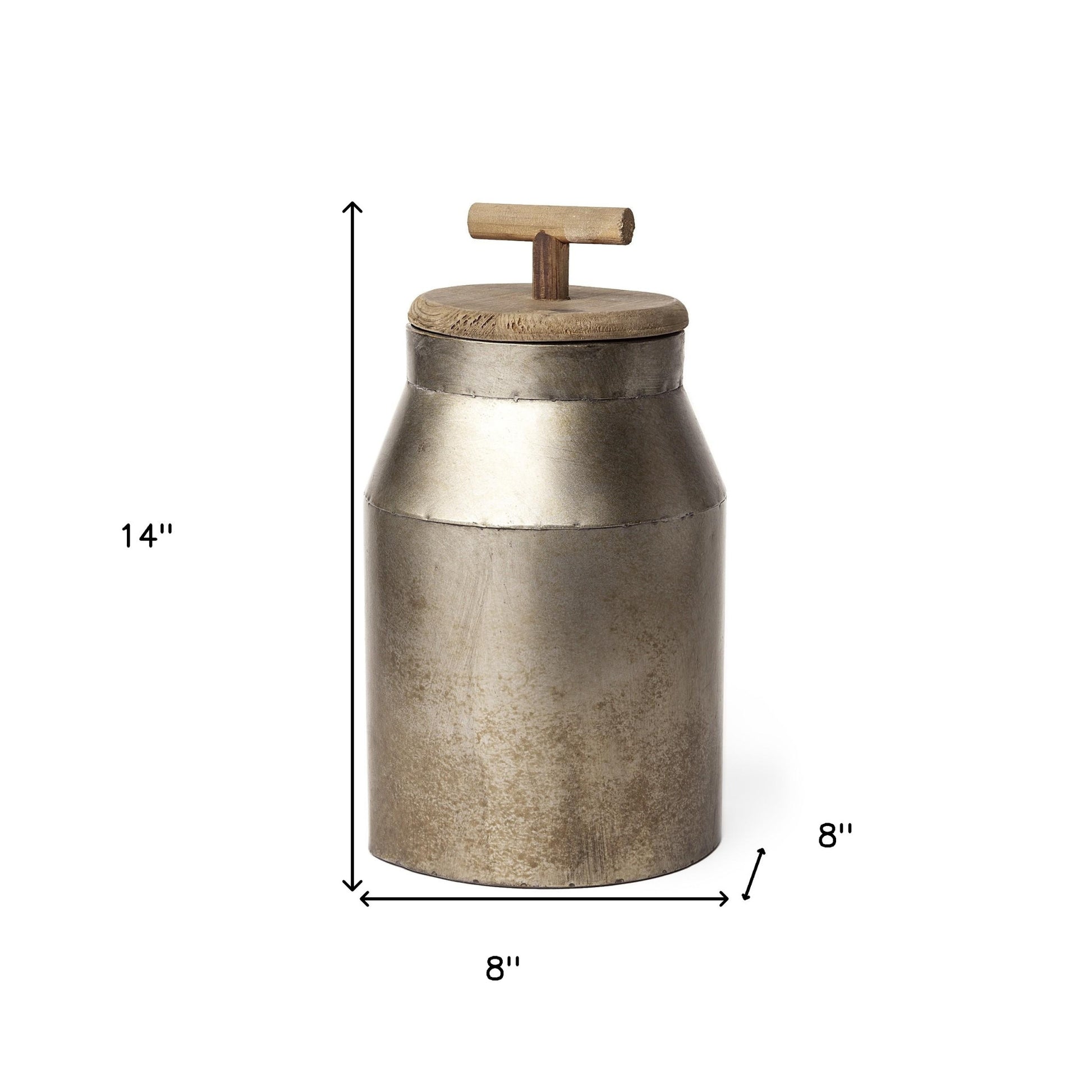 Bring in a touch of rustic design to your home with this Farmhouse Style Milk Container Decor Piece. The milk container is made from solid metal and has a burnished silver finish on top of it. The burnished finish gives it a distressed look which adds to the uniqueness of this piece. The milk container has a very traditional shape with a wooden lid on top. The wooden lid is in a light brown color and features a round base with a T-shaped handle. This decor piece will look great displayed in your kitchen or any other dining spaces. It will also make for great decor in the den or as a conversation piece at your next dinner party. 14" H x 8" W x 8" D