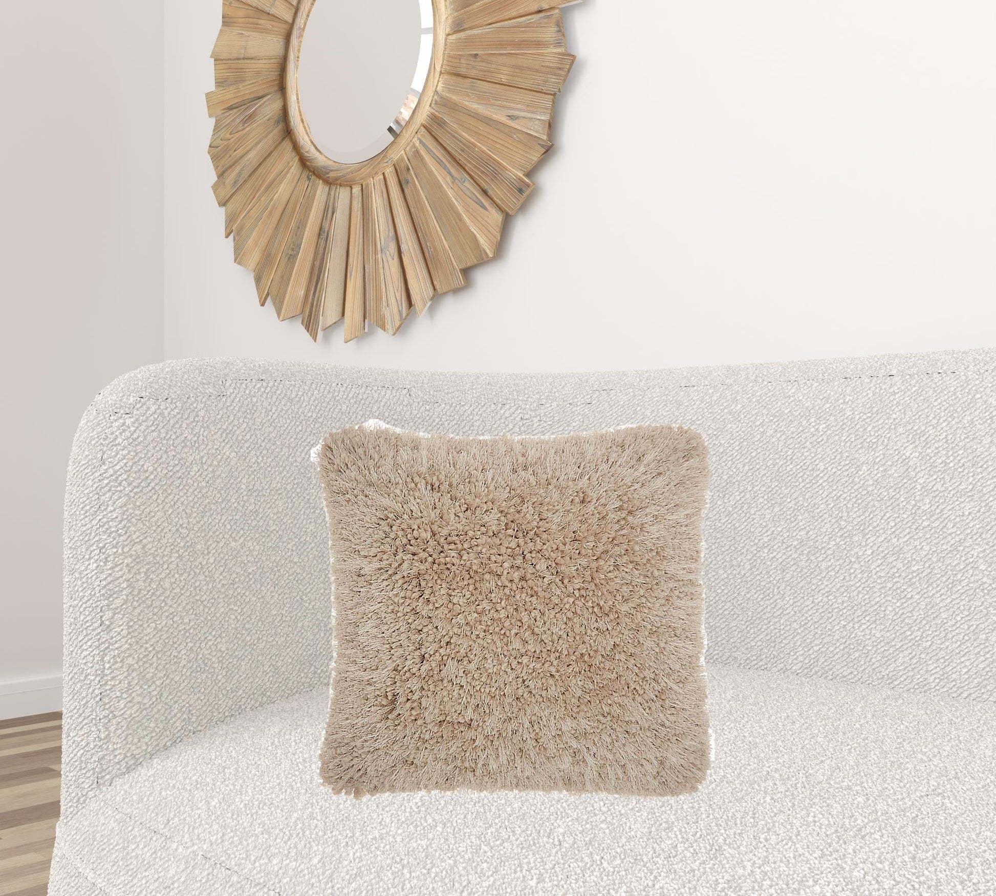 Enjoy all that comfort has to offer with this Fluffy Beige Accent Throw Pillow. The 100% Polyester fiber in non-woven casing makes for a great comfort piece. The shag fabrication gives a soft and calming exterior, adding texture to your home. The soft beige color is the perfect hue to easily style and mix and match with your other decor pieces and pillows. 4" x 20" x 20"
