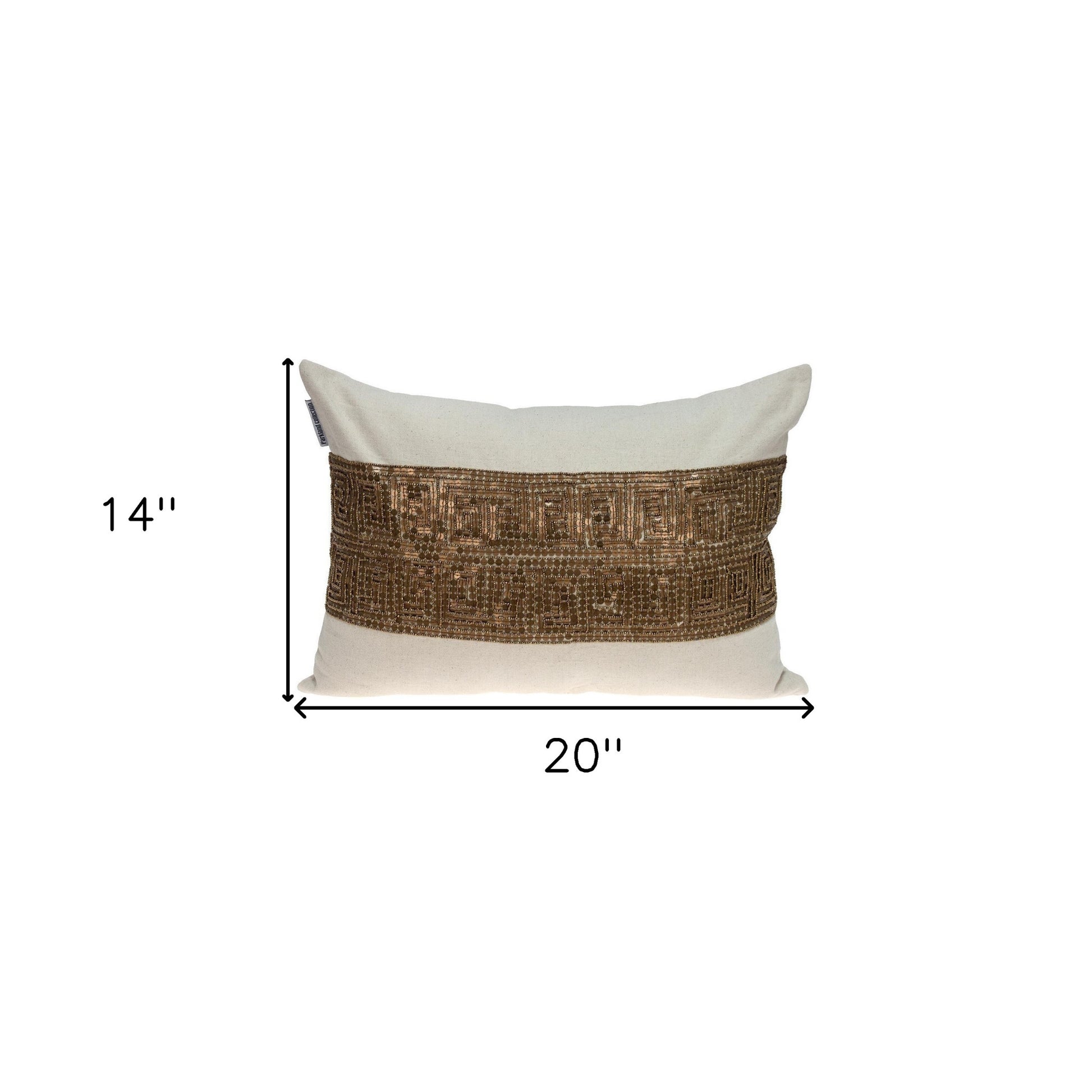 Add a Mediterranean touch to your home with the Beige and Golden Sequined Lumbar Throw Pillow. Beautifully crafted, the 100% pure cotton fabricated pillow almost instantaneously upgrades your home from subtle to glam with it's Golden toned sequins and beads. The glamourous and dazzling spangled meandros band enhances the chic quotient which rests on an all beige backdrop creating a delicate yet exquisite contrasting feature. The solid back of the pillow is unornamented and displays a hidden zipper under a concealed flap for easy insertion/removal of the cushion. Highlight your home with this embroidered throw pillow and refine your enchanting space. 14" x 20" x 4"