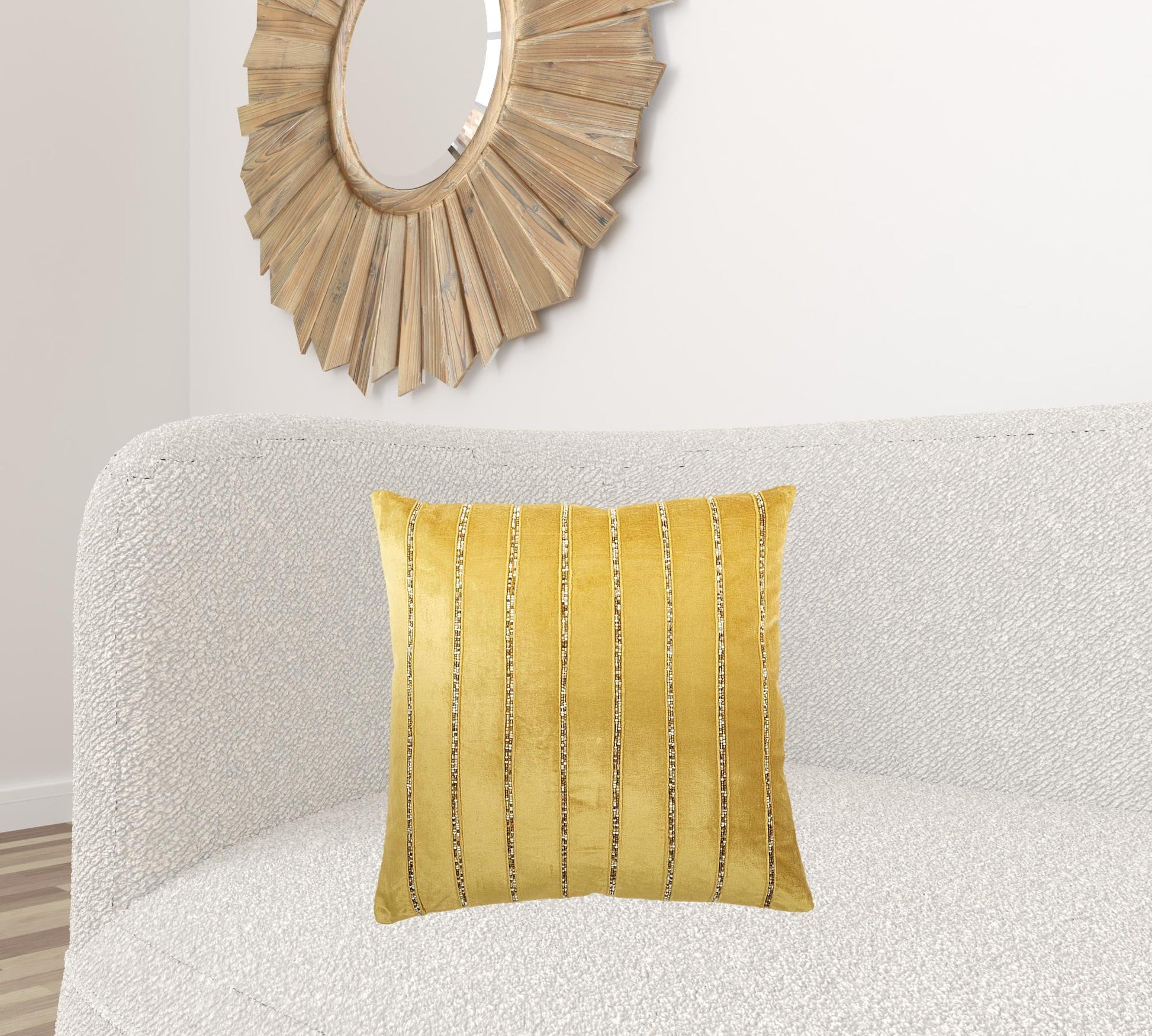 Achieve elegance and glamour in your interior with this Glam Gol and Gold Accent Throw Pillow with Beaded Details. This expertly handcrafted velvet pillow is the perfect piece to scatter on your sofa or bed with its added detail of beaded strands running along the front cover. The modern gold velvet cover provides an extra softness and luxurious aesthetic to the pillow. The zipper closure feature allows for easy inner interchangeabilty, making this pillow a practical and glamorous must-have! 5" x 20" x 20"