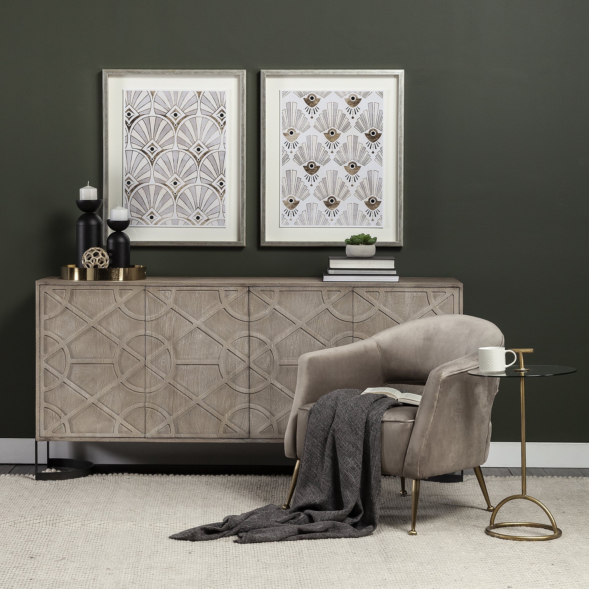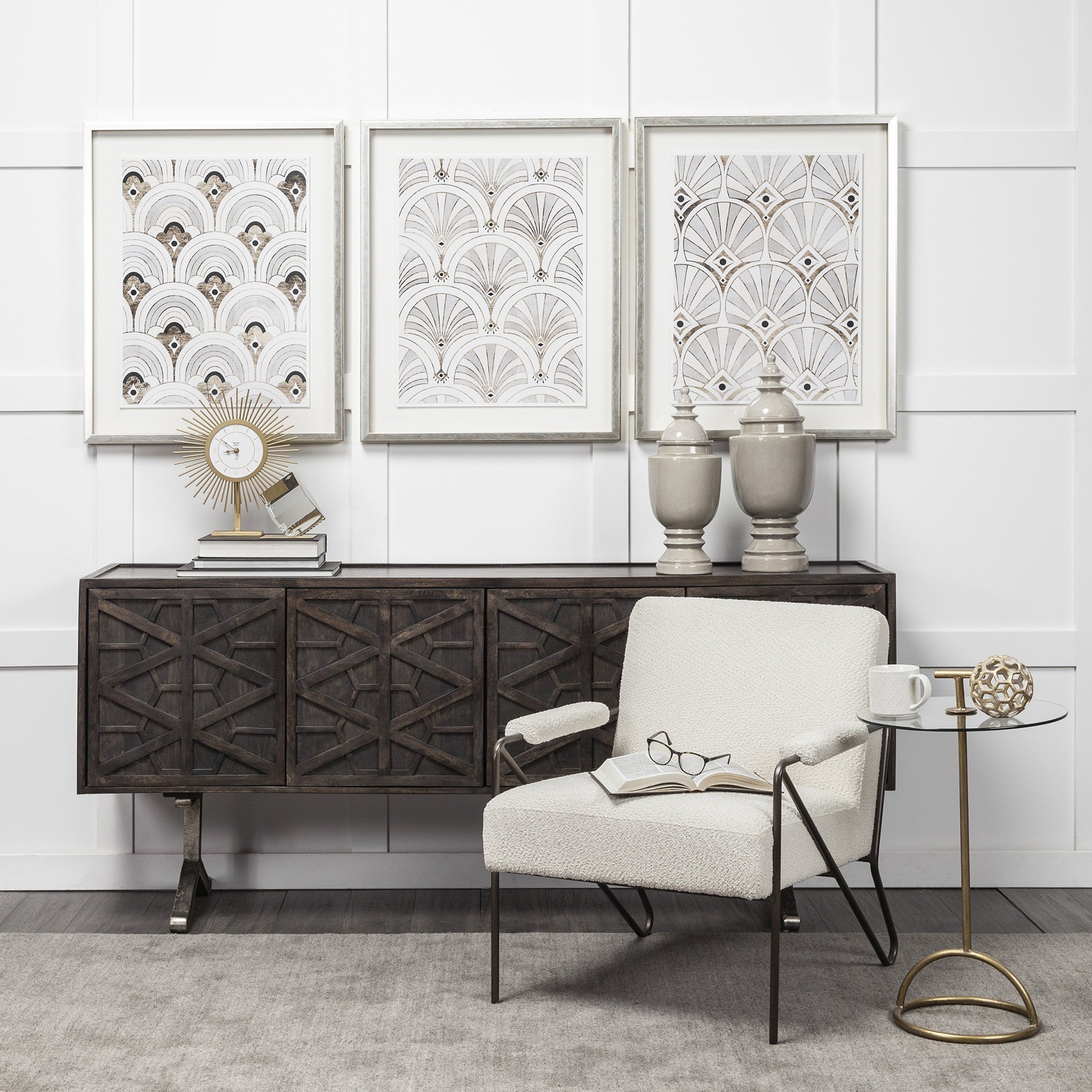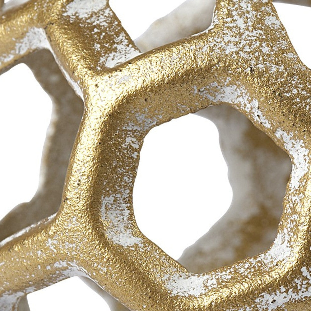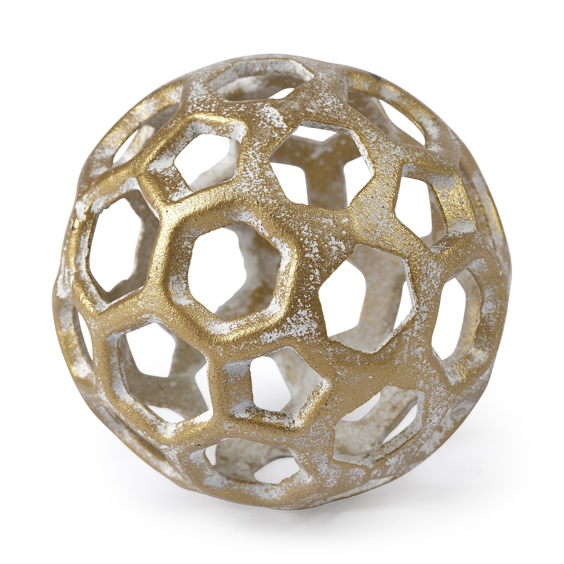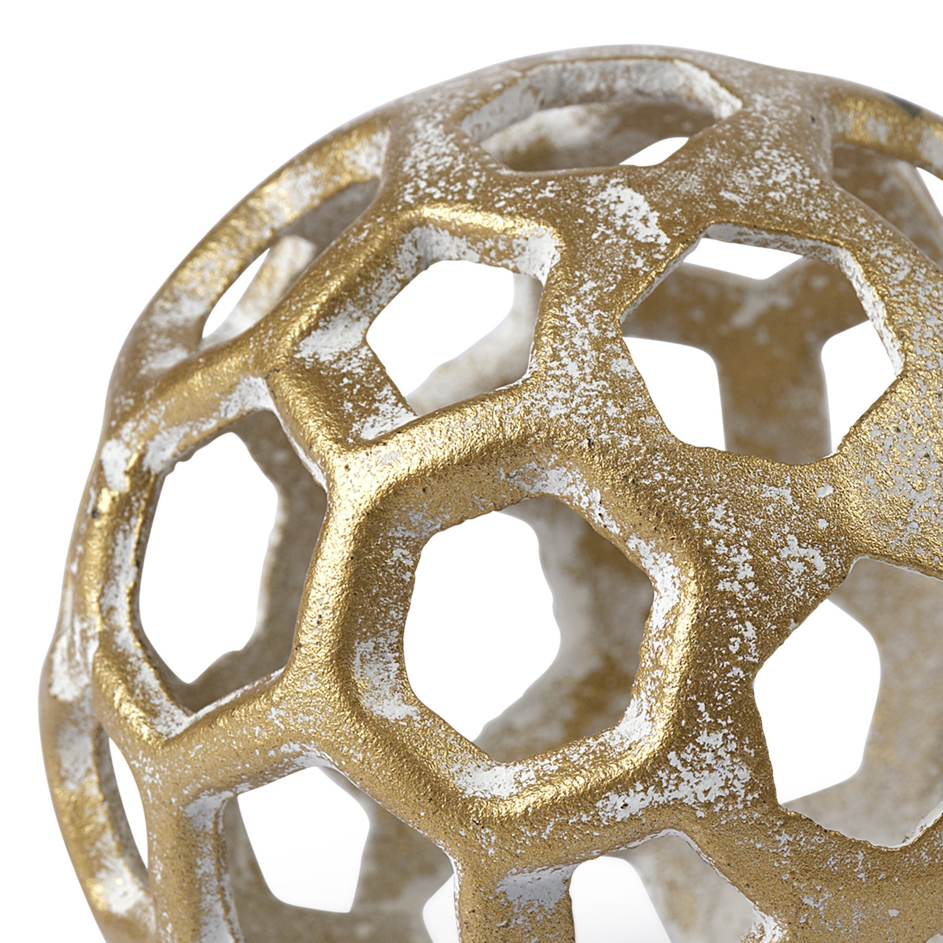 With this Gold Metal Hollow Orb Sculptureyou can add the perfect touch of art-inspired contemporary design to your home. This sculpture is made from solid metal and has a round orb shape. The orb shape has loose hexagonal cut out from them which follows the hollow theme of this decor piece. The distressed gold finish lets some white peak through in some parts and adds a note of depth and dimension to the whole piece. You can display this decor piece anywhere in your home without worrying about clashing colors or interior styles. Use it with similar decor pieces or as a stand-alone piece, it will look great nonetheless. 5" H x 5" W x 5" D