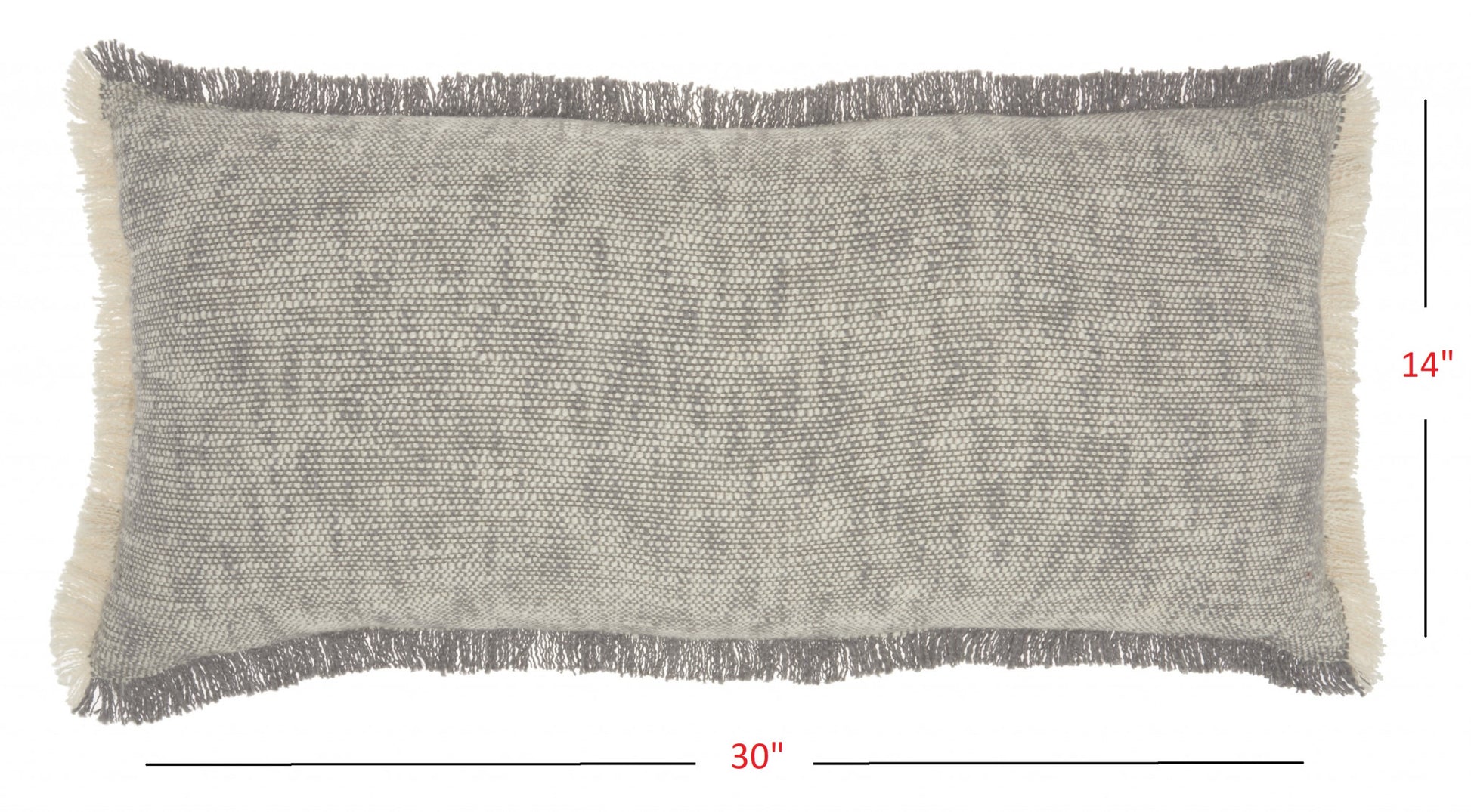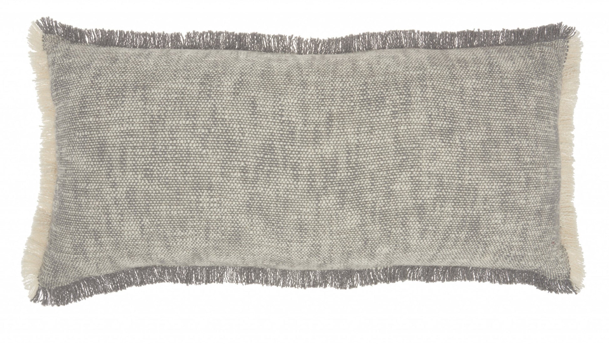 Add some beautiful color and style to your sofa, bed, or favorite chair with this dreamy Gray and White Woven Heathered Lumbar Throw Pillow. A gorgeous weave that blends color with a creamy ivory and is lightly textured. There is frayed fringe all around the edges that alternates between color and ivory giving this pillow a unique and designer look. Generous in size this pillow is a great option for stylish low back support. 14" x 30" x 5"