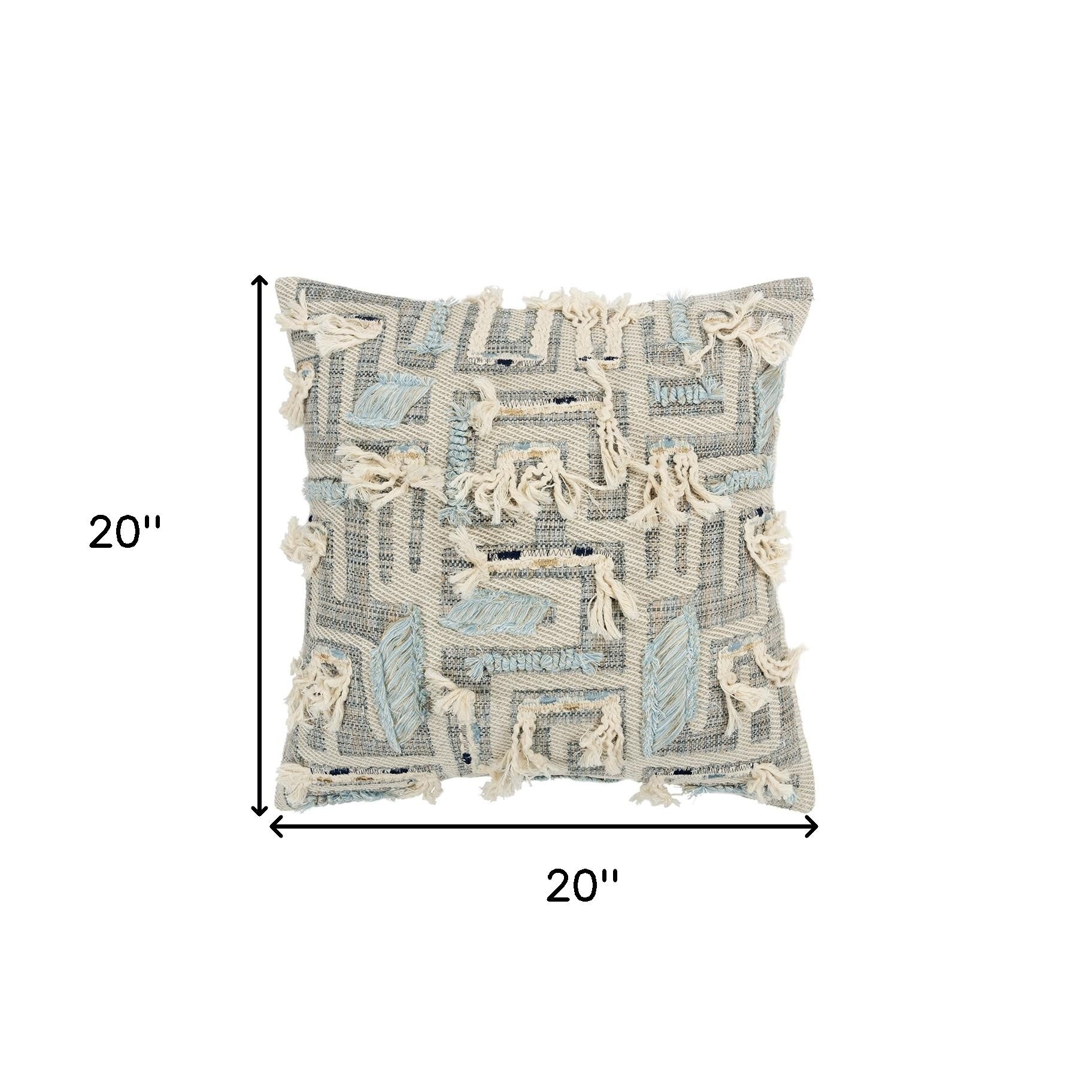 This timeless Gray Blue Appliqued Maze Modern Throw Pillow is sure to add dimension and texture layered into your modern interior. The pillow features a gray maze-like pattern woven with yarn chords in powder blue that are hand applied and joined together with a satin stitch while the frayed ends are kept to add volume and texture to the piece. The pillow is constructed with a top-notch cotton fabric that is soft to the touch with extended durability and comes with a plush polyfill insert that gives it a soft and fluffy nature. The same material is featured on the back in a solid color with a zipper for convenience. Knife edges give the pillow a crisp and polished look fit for a variety of interior styles. This throw pillow is the perfect combination of boho patterns against a modern design to add a touch of sophistication and class to your home. 20" x 20" x 6.25”