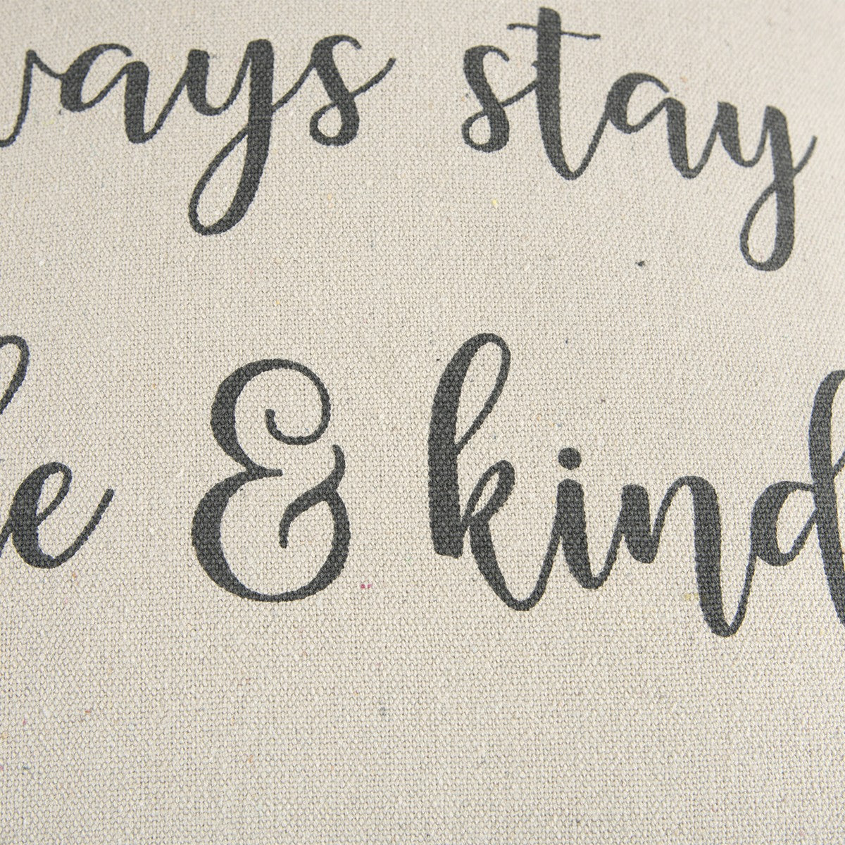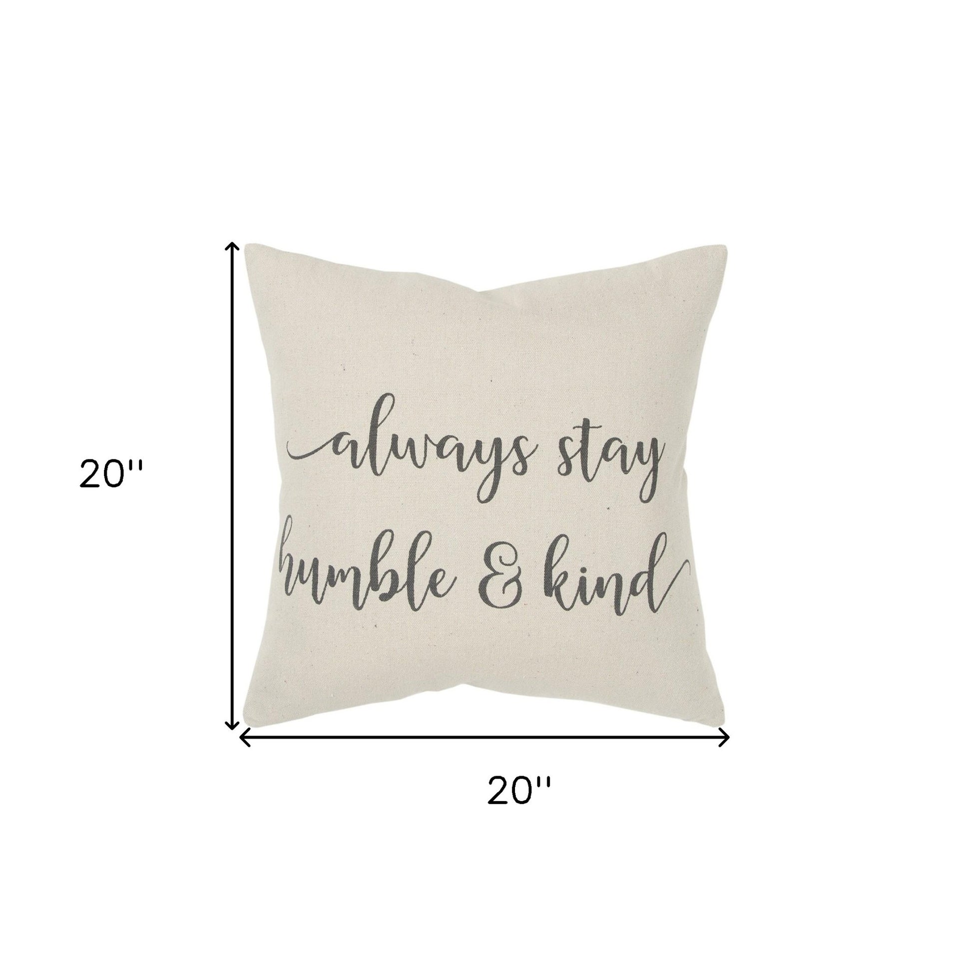 A subtle reminder of social good is perfectly represented in this Gray Cream Humble & Kind Throw Pillow that will add a modern edge to your living space. The beautifully written cursive font with a sentiment that says ‘always stay humble and kind’ promotes a sense of compassion in the surrounding. The gray fonts are perfectly balanced over the cream base for a simple yet stylish visual appeal while the knife edging makes the pillow suitable for all types of interior design styles and decors. The pillow features lightly textured cotton canvas for a luxurious feel on the touch. The hidden zipper closure on the cotton back ensures easy filling and cleaning. Embracing style and sophistication in a compact design, this decorative throw pillow will be a wonderful addition to your living room. 20” x 20” x 6.25”