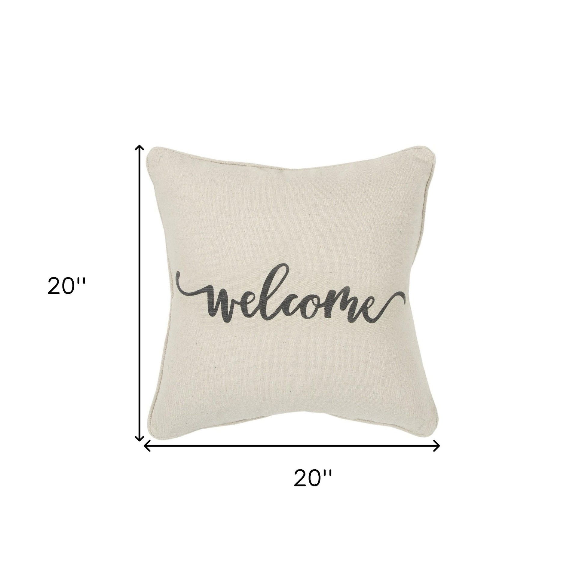 Make the guests feel invited into your living space with this Gray Cream Welcome Decorative Throw Pillow. The beautifully written cursive font flaunts the word ‘welcome’ in trout gray over a cream-toned base, giving the pillow a sophisticatedly modern look with a fun-loving attitude. Meant to work well amidst a range of interior themes and decors, the pillow is crafted from top-notch cotton canvas for long-lasting durability while the playful font adds light texture to the piece. The self-welting provides a clean and definitive outline and the solid coordinating back features a concealed zipper closure for convenience. Simple, sophisticated, and stylish in its design aesthetics, this decorative pillow will be a versatile accent piece to add class and comfort to your living room. 20” x 20” x 6.25”