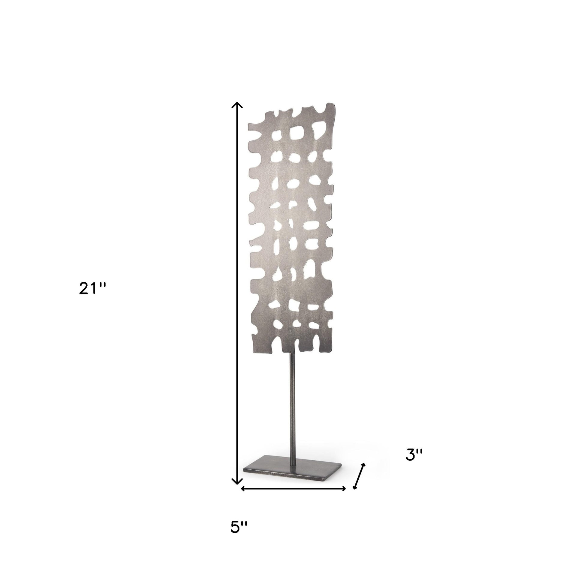 This contemporary design inspired Gray Metal sculpture is the perfect way to add a unique design touch to your home. This sculpture is made from solid metal and has a dull matte gray finish on top of it. There is a rectangular base that has a metal rod extending from it and attaching it to the main decor piece. The main body of this piece is essentially a thin metal rectangle that has asymmetrical holes poked through it which fits with the contemporary look of this piece. You can display this piece as part of the existing decor in your home or as a stand-alone piece anywhere in your home. 21" H x 3" W x 5" D