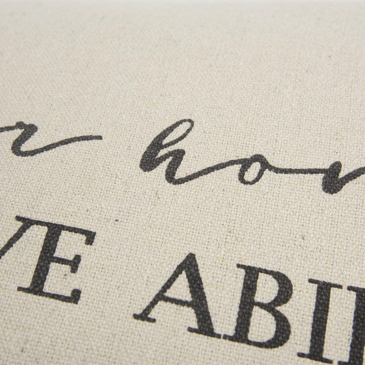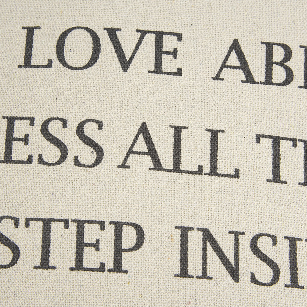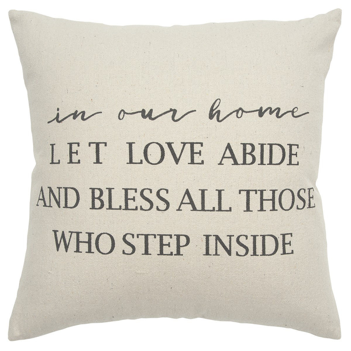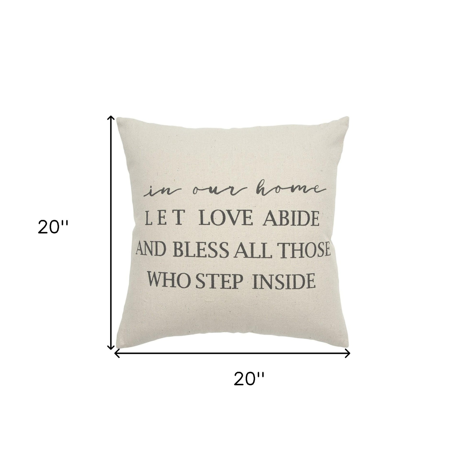 Express a sense of hospitality in your living space with the addition of this Gray Taupe Canvas Let Love Abide Throw Pillow on the sofa set or couch. The neutral color palette featuring a modern gray font that says ‘in our home Let Love Abide And Bless All Those Who Step Inside’, the pillow set an inviting tone with a sense of appreciation for the guests. The lightly textured cotton fabric gives a cozy feel on the touch while the self-flange edges prevent fraying, making the pillow a suitable accent for a range of interior themes. This poly-filled pillow features a removable cover for easy cleaning and comes with a solid cotton back for a complete look. The soft hues and delightful writing of the pillow make it a great decorative accent to add style and character to your living space. 20” x 20” x 6.25”