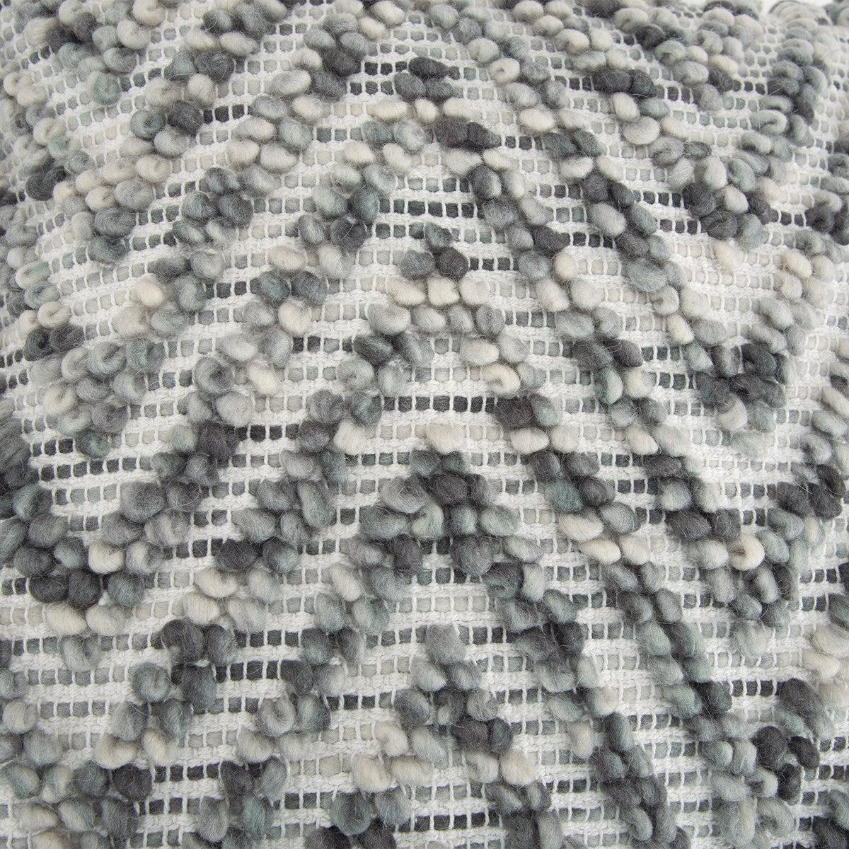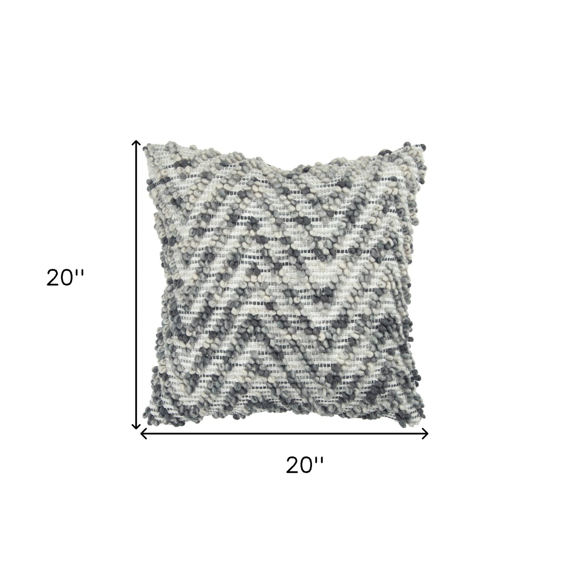 Embrace the artisanal warmth of this alluring Gray White Chevron Dimensional Throw Pillow that evokes a relaxed and carefree ambiance in any contemporary home. The chevron pattern featured on the pillow is handwoven with much care to ensure the nubby pattern and texture stay fresh for a long time. Crafted with dip-dyed yarn, yielding variegated shades of gray and white, making the pillow more personalized and original to flaunt in your home. This poly-filled pillow features knife edges that give it a simple and clean look, while the back is a coordinating solid of the same cotton material with a hidden zipper closure for ease of cleaning. The transitional style of this decorative throw pillow will convey a sense of style and coziness in your home. 20” x 20” x 6.25”