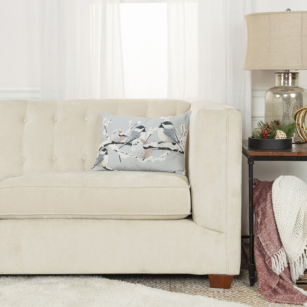 Decorate in a classy and elegant way to celebrate the holiday season with this Gray Winter Birds Decorative Lumbar Throw Pillow. The scene is set on a winter day where dimensional and textural snow hangs off the branches giving way to the beautiful embroidered birds. Beautiful and comforting on a gray background, this neutral and earthy pillow is winter without specifically saying holiday and could be used most of the year. This motif would also be ideal in lodge, lake or mountain home settings. Designed for low back lumbar comfort, this rectangular 14" x 26" decorative accent features a solid natural canvas colored back with a hidden zipper closure for convenience.