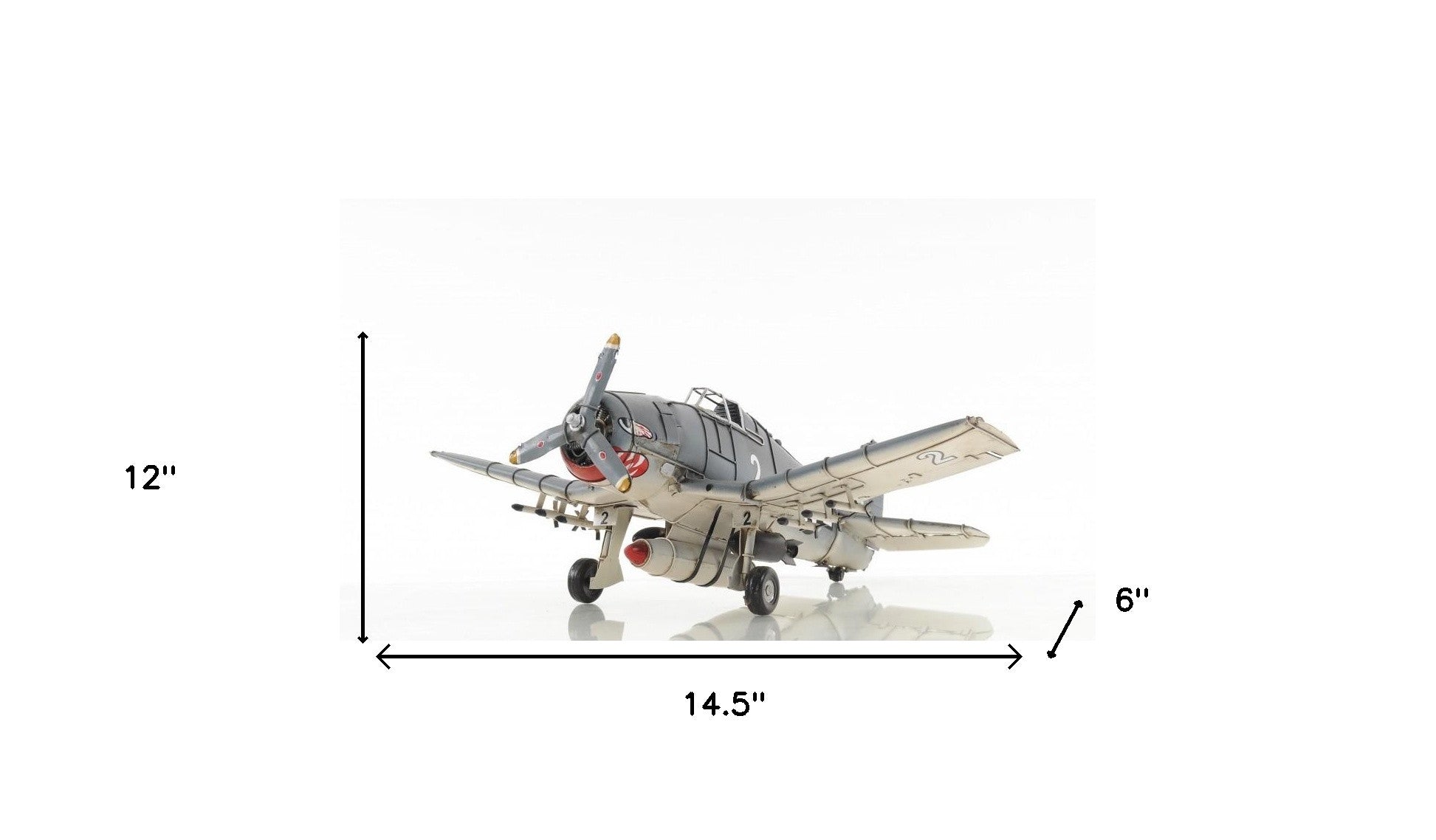 A beautiful replica of the iconic WWII American carrier-based airplane, Grumman F6F Hellcat Sculpture is handmade out of metal and authentically detailed. It comes with remarkable details such as landing wheels, a cockpit, a propeller, missiles, bombs, and is painted with authentic WWII blue paint and symbols. With a scale of 1:40, it is a sought-after piece for aviation and WWII enthusiasts. 6" x 14.5" x 12"