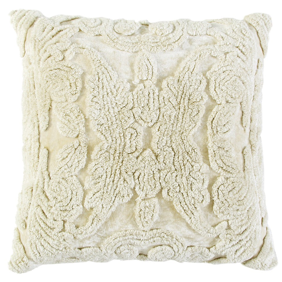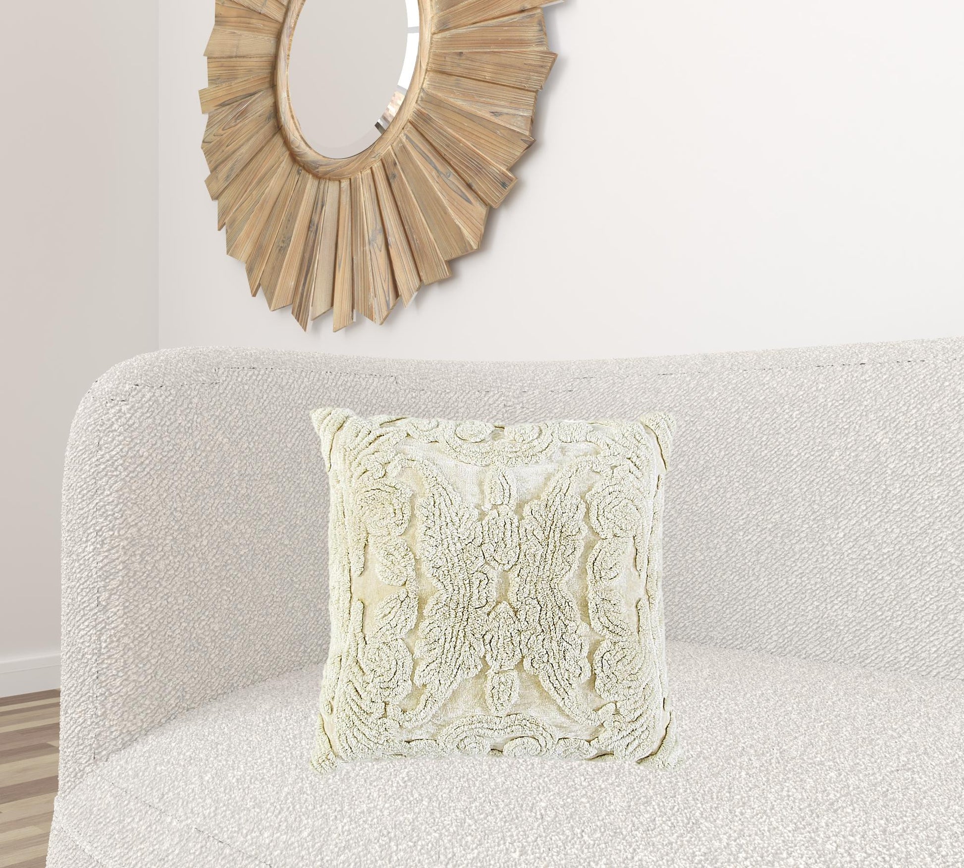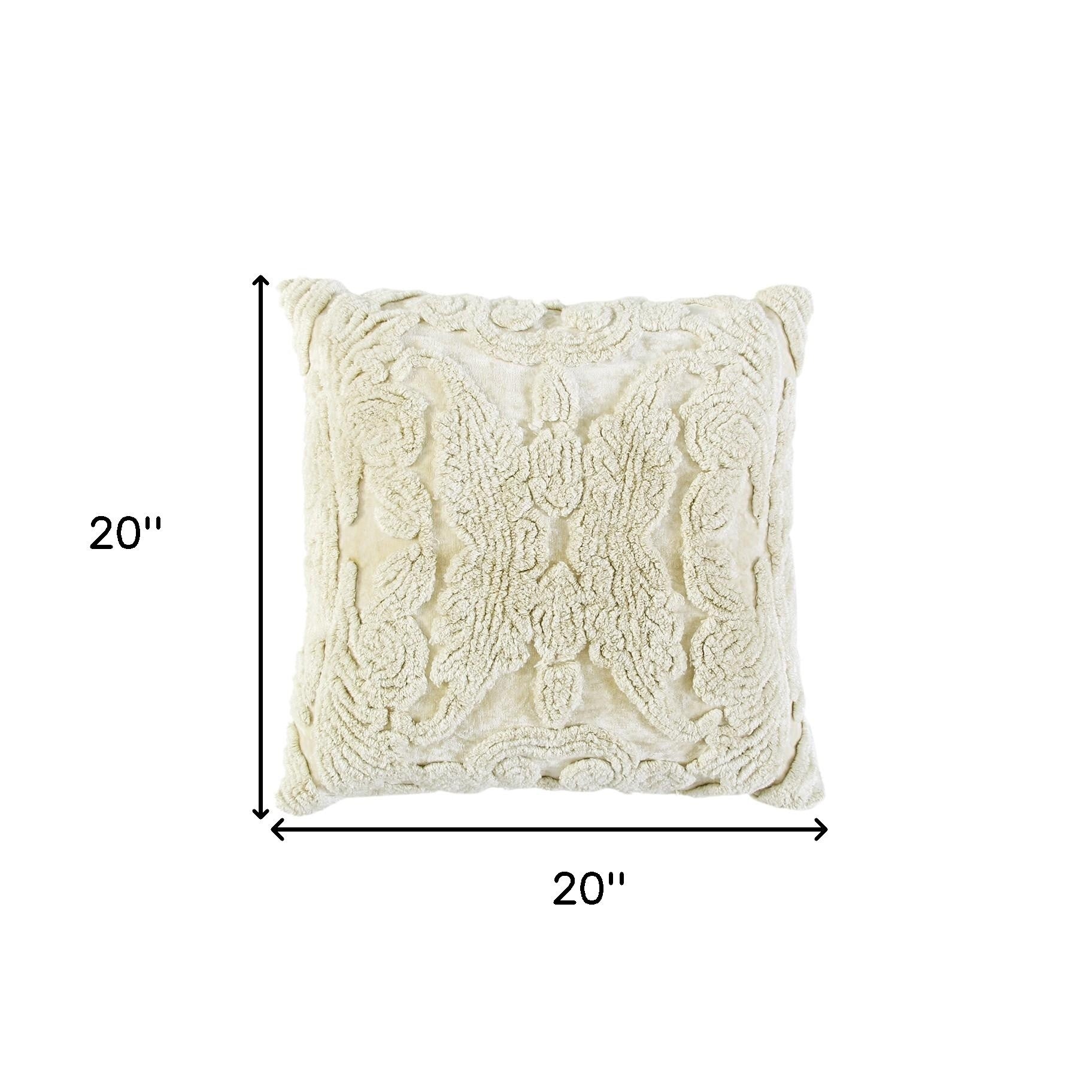 Showcasing luxury in a compact design, this Ivory Botanical Tufted Pattern Throw Pillow is meant to uplift the aesthetics of your living space in an instant. The lavishly tufted botanical patterns in soft shades of ivory exude a sense of traditional elegance while the solid color palette accentuates a modern appeal. The heavily textured patterns add dimension and texture to the soft cotton velvet base, making this pillow an accent of opulence in any modern or traditional setting. The pillow is super soft and cozy due to its poly-filled insert and the knife edging ensures a clean and polished look. The back of the pillow comes in a solid cotton fabric and bears a hidden zipper closure for convenience. Add a sense of character to your living space with this beautiful decorative throw pillow placed amid your interior decor. 20” x 20” x 6.25”