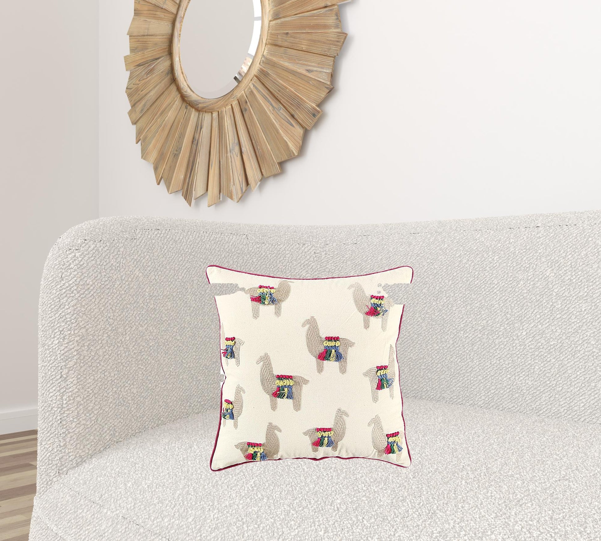 The bright colors and whimsical patterns of this Ivory Fiesta Fun Embroidered Llamas Throw Pillow will undoubtedly draw the attention of your guests. Machine embroidered llamas in beige with colorful hand-tied French knots for the saddle detailing add texture and visual allure to the ivory base. The pillow is contrast welted in magenta red to add a pop of dimension and complete the look with a seamless finish. Skillfully crafted with a sturdy cotton fabric, the pillow features a solid coordinating fabric on the back with a hidden zipper closure for convenience. The pillow comes with a plush polyfill insert that provides a soft and cuddly texture. The trendy pattern and accent colors of this decorative throw pillow will blend in with your modern home while maintaining a bohemian vibe. 18" x 18" x 6”