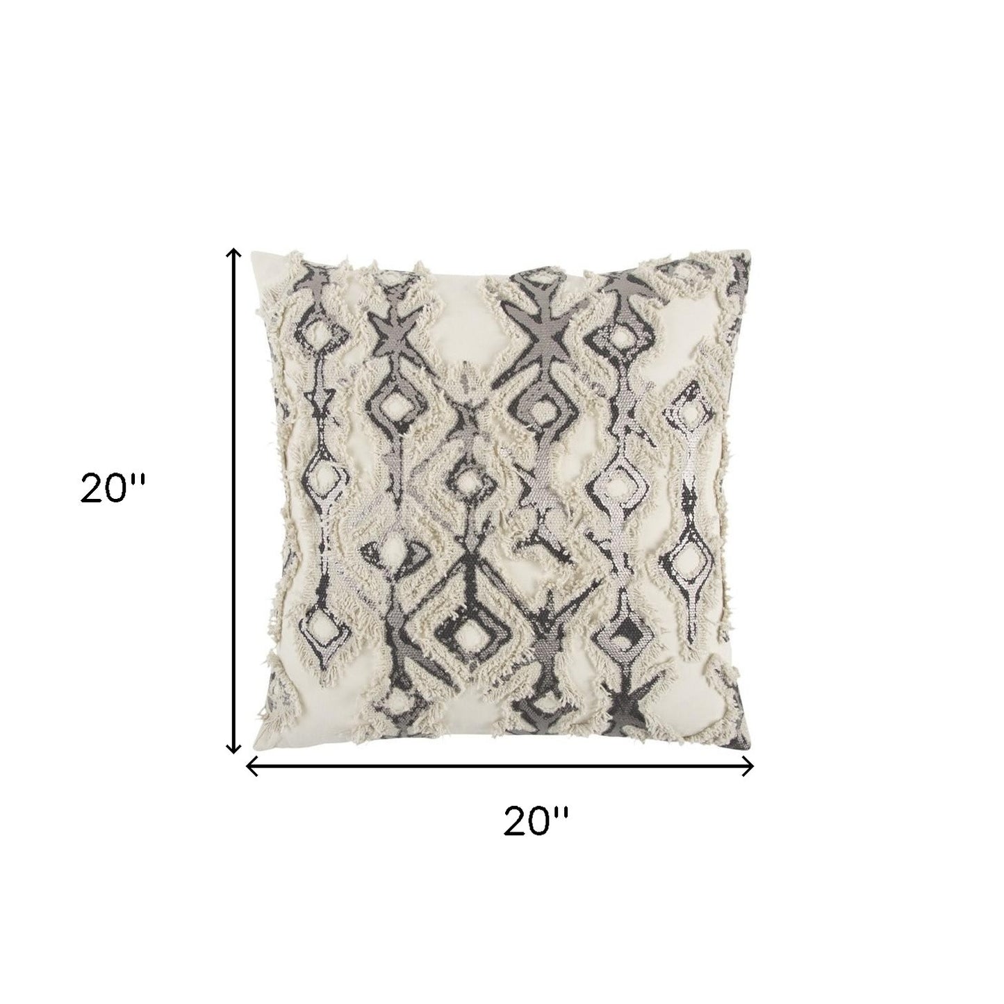 Boasting neutral hues and geometric design to draw the eyes, this Ivory Gray Snakeskin Pattern Throw Pillow is yet another unique accent to add to your bohemian decor. The strong and complex geometric striped pattern in gray and ivory with a silver foil frayed applique resembles a snakeskin pattern while giving texture to the pillow for a cozy appearance. Crafted from high-quality cotton fabric for strength and durability while the knife edges maintain the crisp and fine corners to make this pillow ideal for modern interiors. The pillow features the same cotton back with a hidden zipper closure for convenience. Pair it up with any bright or bold theme decor and this uniquely designed pillow will stand out in its beauty without compromising comfort and functionality. 20” x 20” x 6.25”