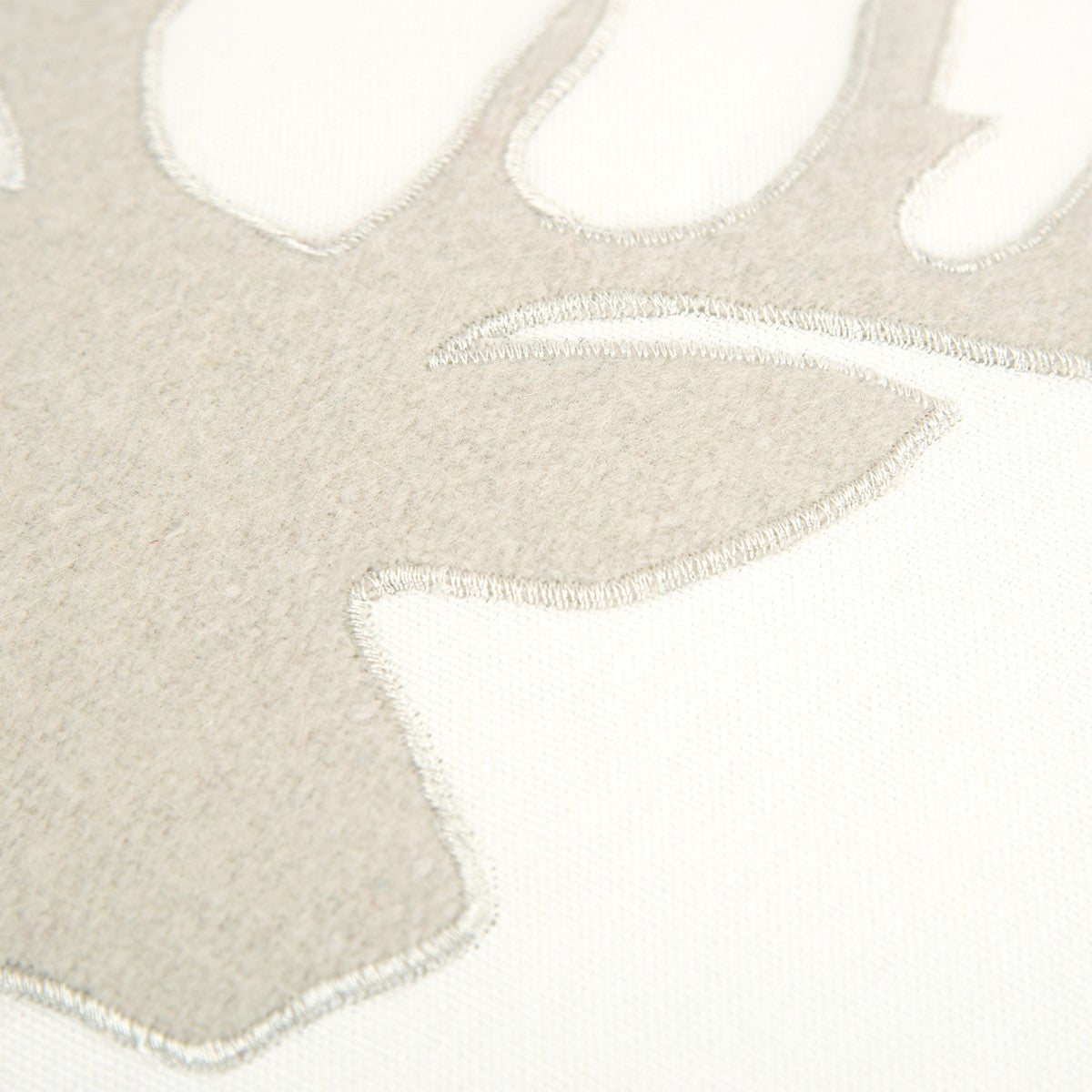 Bring a luxurious natural tone into your home with this Ivory Tan Reindeer Appliqué Throw Pillow that will accentuate an exquisite modern look into your living space. The tan colored wool felt applique reindeer is perfectly secured with a satin embroidery on the ivory base which gives off comforting and soothing visual effects, while the contrasting jute welt adds a seamless finish to it. This down-filled pillow is fluffy and airy-soft making it a plush accent piece to adorn any modern or contemporary home. Crafted from superior quality cotton that ensures durability and offers optimal support for a comfortable resting experience. The same solid cotton fabric is featured on the back with a hidden zipper closure for a unified look and easy cleaning. Grace your living space with this soft-toned throw pillow that will add to the style and simplicity of your interior décor. 20” x 20” x 6.25”