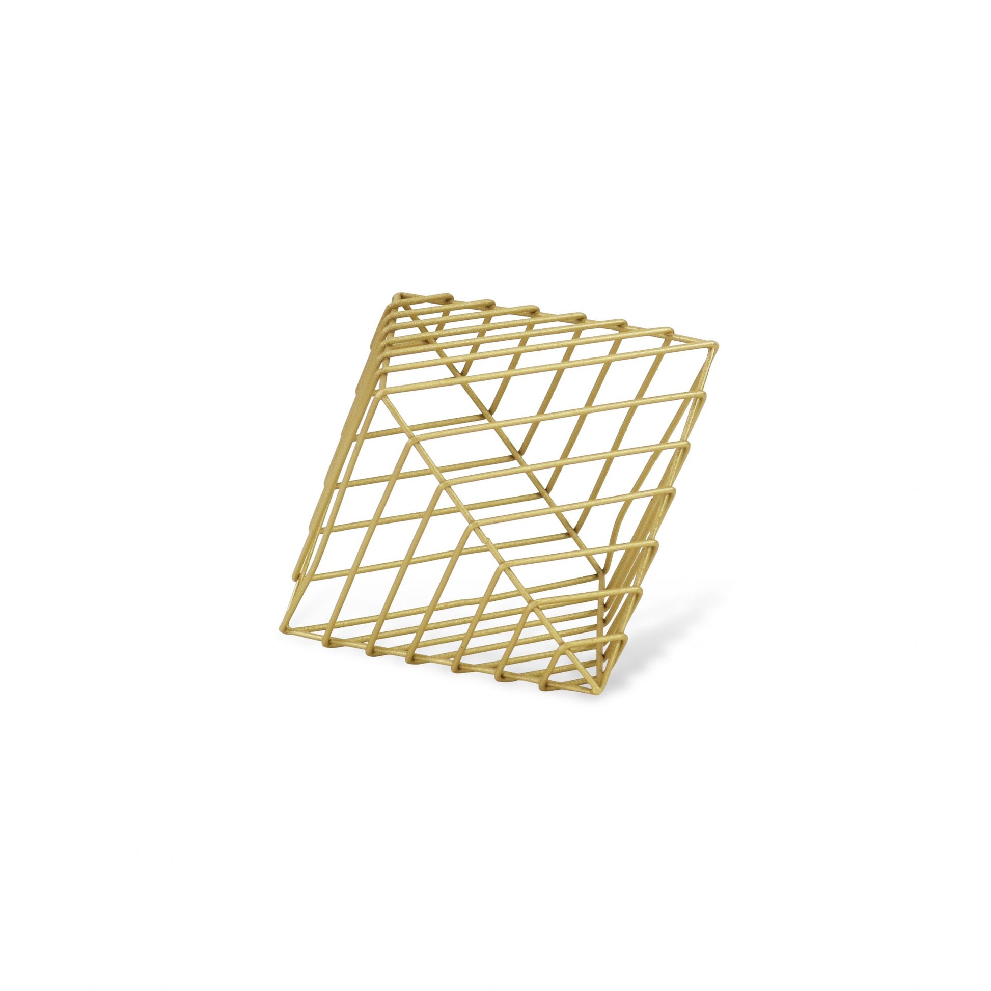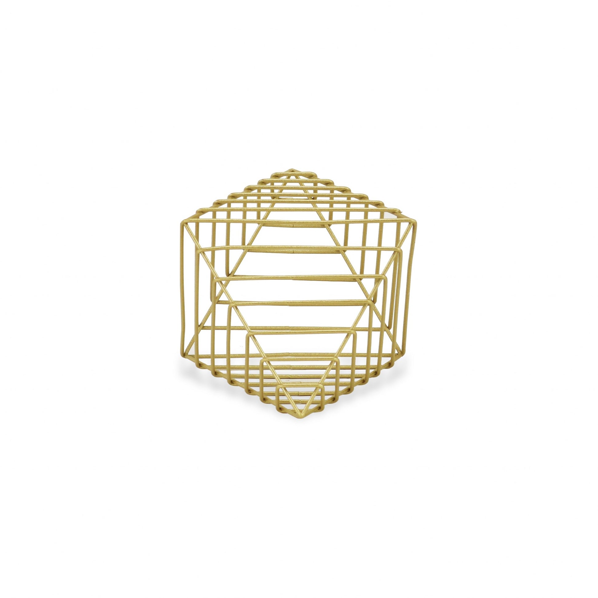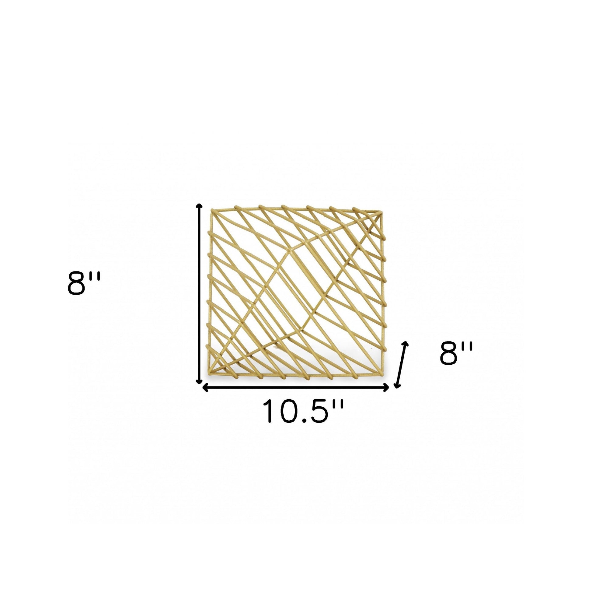 This Jumbo Gold Metal Decorative Sculpture is the perfect way to add a geometric accent piece to any space in your home. This piece is made of metal and is colored to a soft gold finish. The design features a base a square shape which has a long diamond in the middle of it. The base shape is covered in thin metal strips that run from the front to the back creating a solid piece. You can use this decor piece on your bookshelf, in your living room, in your entryway, or as a fancy paper weight as well. 8" H x 10.5" W x 8" D