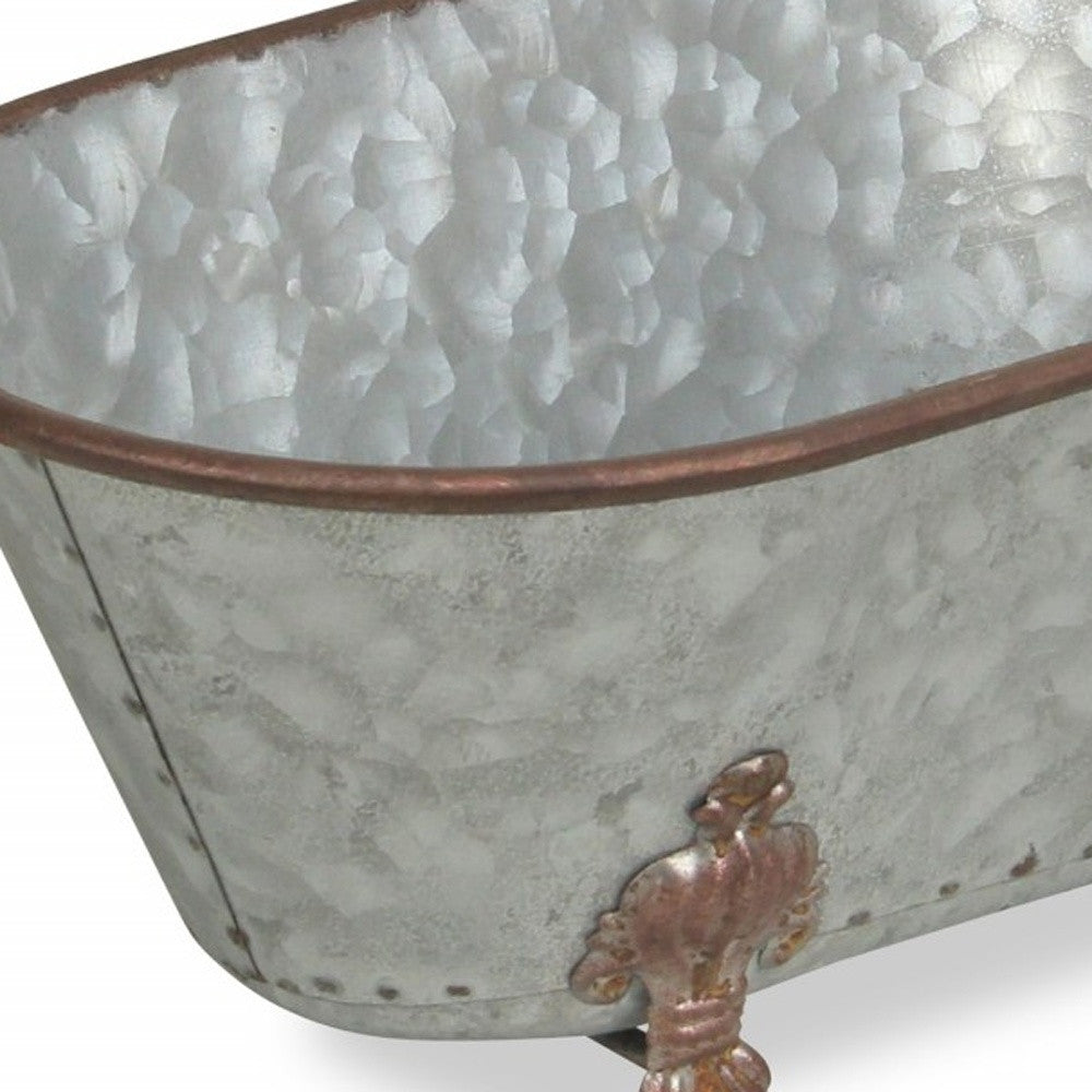 Add a whimsical touch to any space in your home with this Jumbo Hammered Metal Bathtub Decorative Sculpture. This piece is made from solid metal and features a hammered textured which has a silver finish on it. The claw foot bathtub shape has a bronze colored rim which matches the intricately designed four feet at the bottom. You can use this piece as decor around your home or you can line in with plastic and use it as a fun planter outdoors or indoors. 5" H x 12" W x 6.5" D