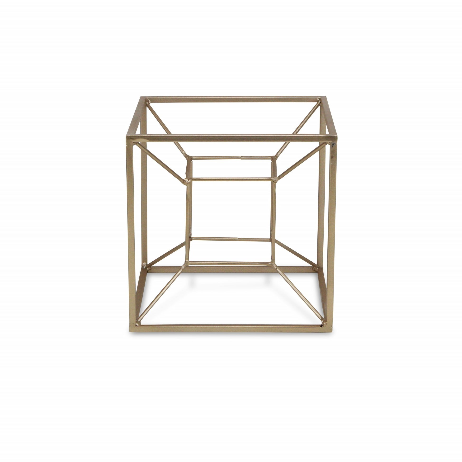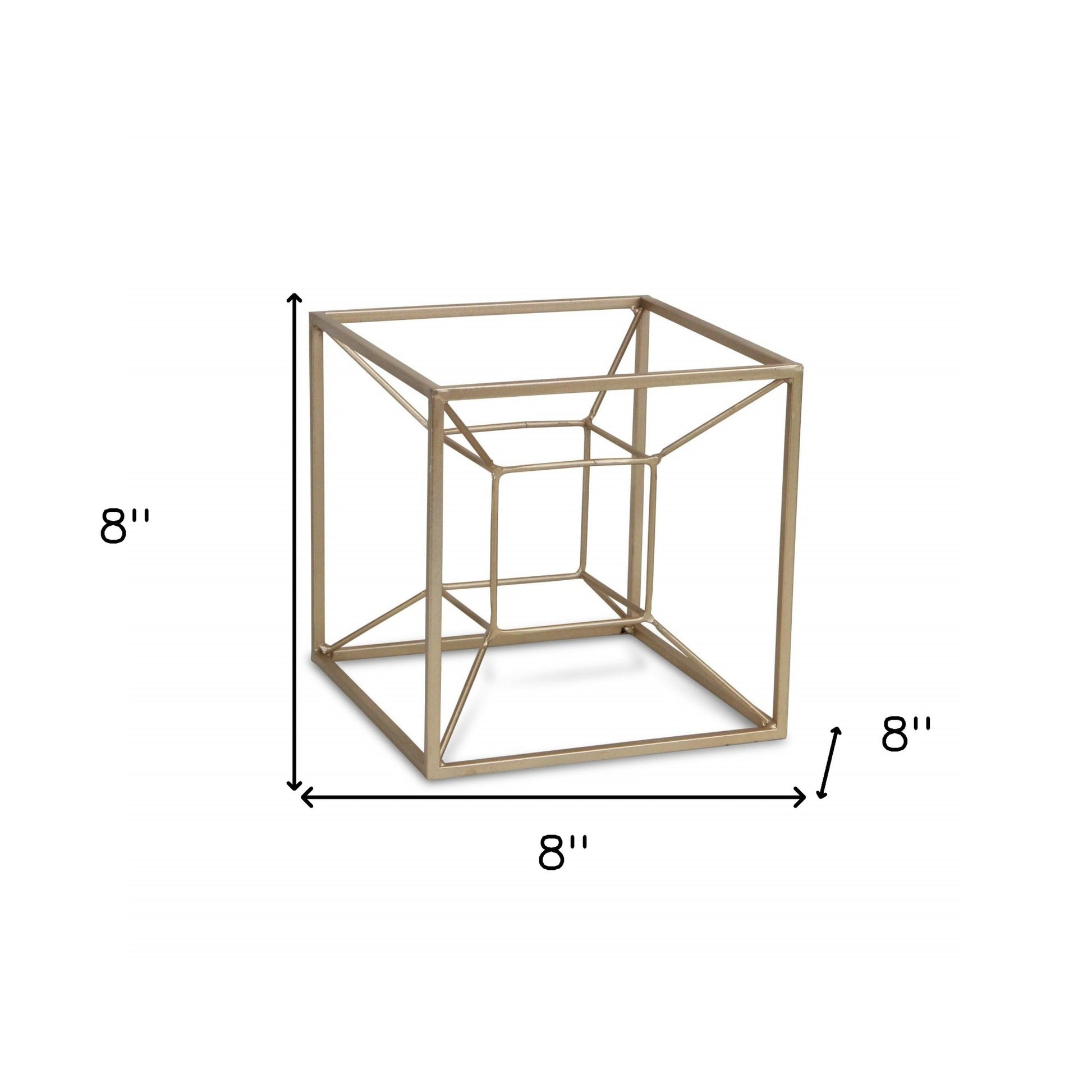 Featuring a cube within a cube, this Jumbo Metal 3D Cube Decorative Sculpture is sure add a nice touch of depth and design to any space in your home. This piece is made of solid metal and is colored to a stunning champagne finish. The outer cube shape has a thicker look to it white the inner cube shape is made of thinner metal rods. The two cube shapes are attached to each other by the corners using thin metal rods. This neutral color of this piece means you can use it with any existing decor or colors you already have and you can also use it a statement piece. 8" H x 8" W x 8" D