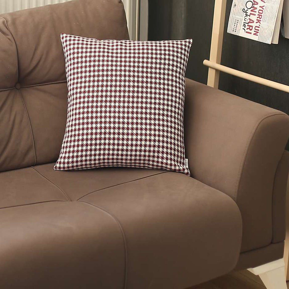 Decorate your living space with this Maroon Red Houndstooth Pattern Throw Pillow that adheres to a classic pattern with a subtle color palette. Beautifully designed with black and maroon red houndstooth patterns in jacquard weaving over a white base for a simple yet sophisticated look amidst any surrounding. Handmade in Turkey with 100% premium polyester fabric to ensure durability and color intensity while the OEKO-TEX Standard 100 certification speaks of its top-notch product quality and safety. The edges feel smooth and refined due to its hidden zipper closure while the soft poly filling contributes to its fluffy look and comfort. Aligning with the aesthetics of contemporary styling, this decorative throw pillow will add an understated elegance to your modern home. 18” x 18” x 1”