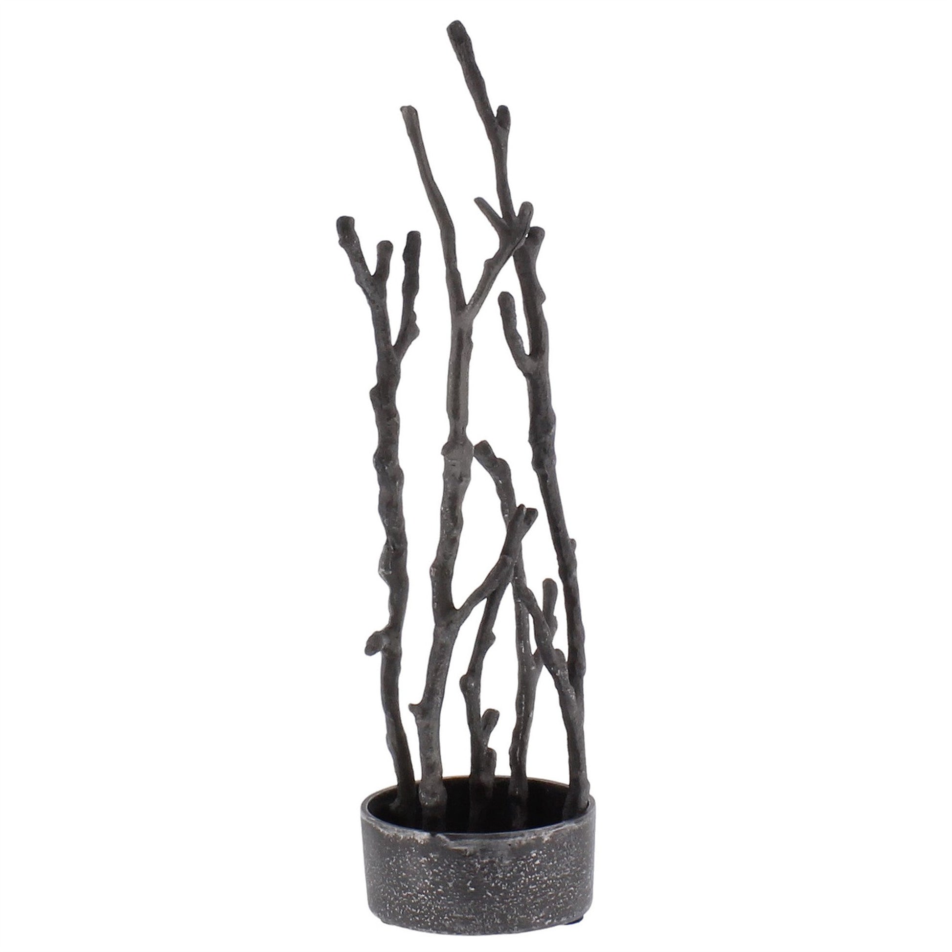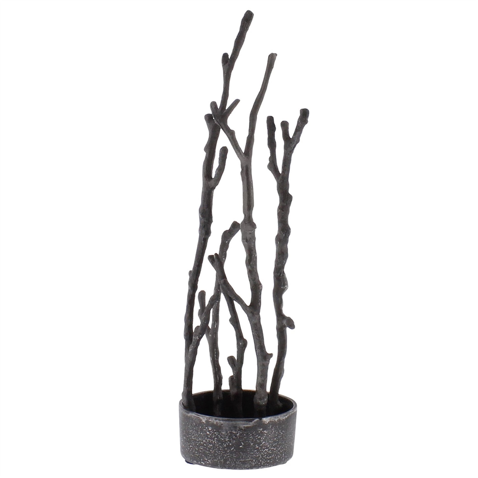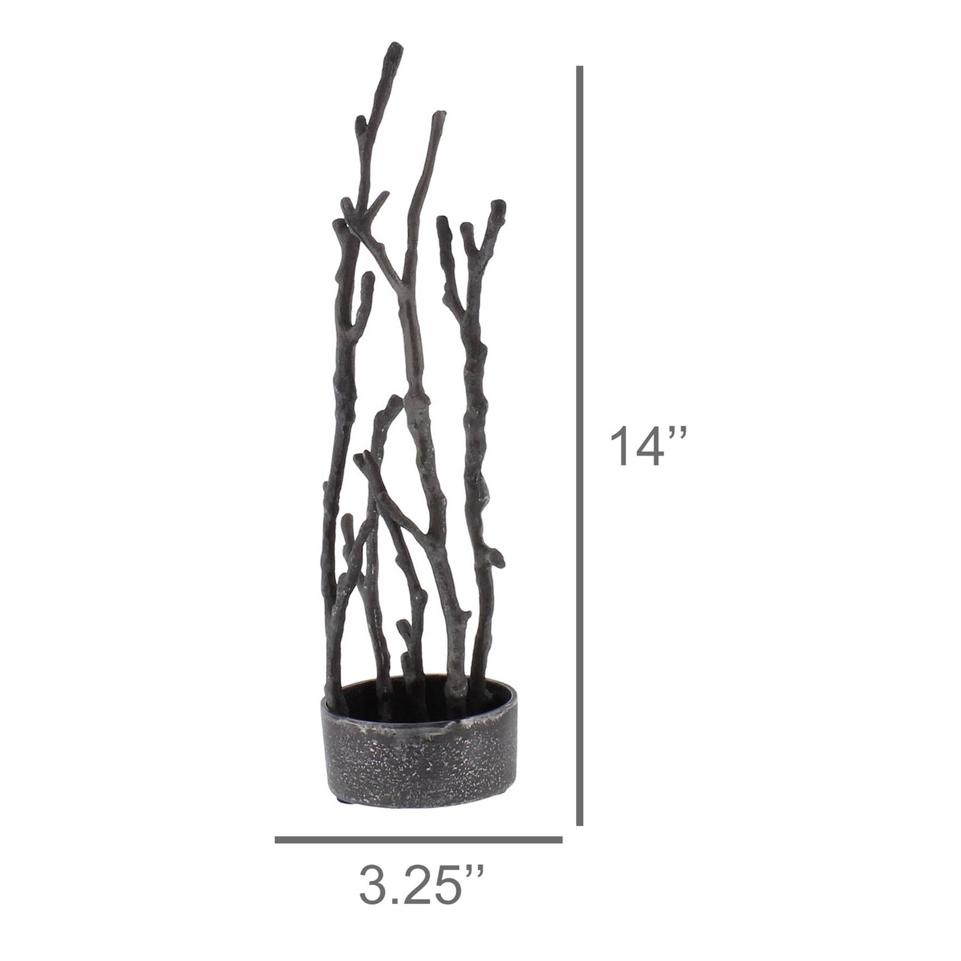 With this Metal Branches Sculpture you can bring in a nature-inspired design element to your home. The base of this base is made from metal and resembles the look of a shallow plant pot. From this plant pot shape there are five tree branch shapes that rise up. These branches are made from metal as well and have a black finish on them matching the finish of the base. The details on these branches add depth to the overall look. This piece will look great in your entryway or it can be used anywhere else in your house to add a fresh element of decor. 14" H x 3.25" W x 3.25" D