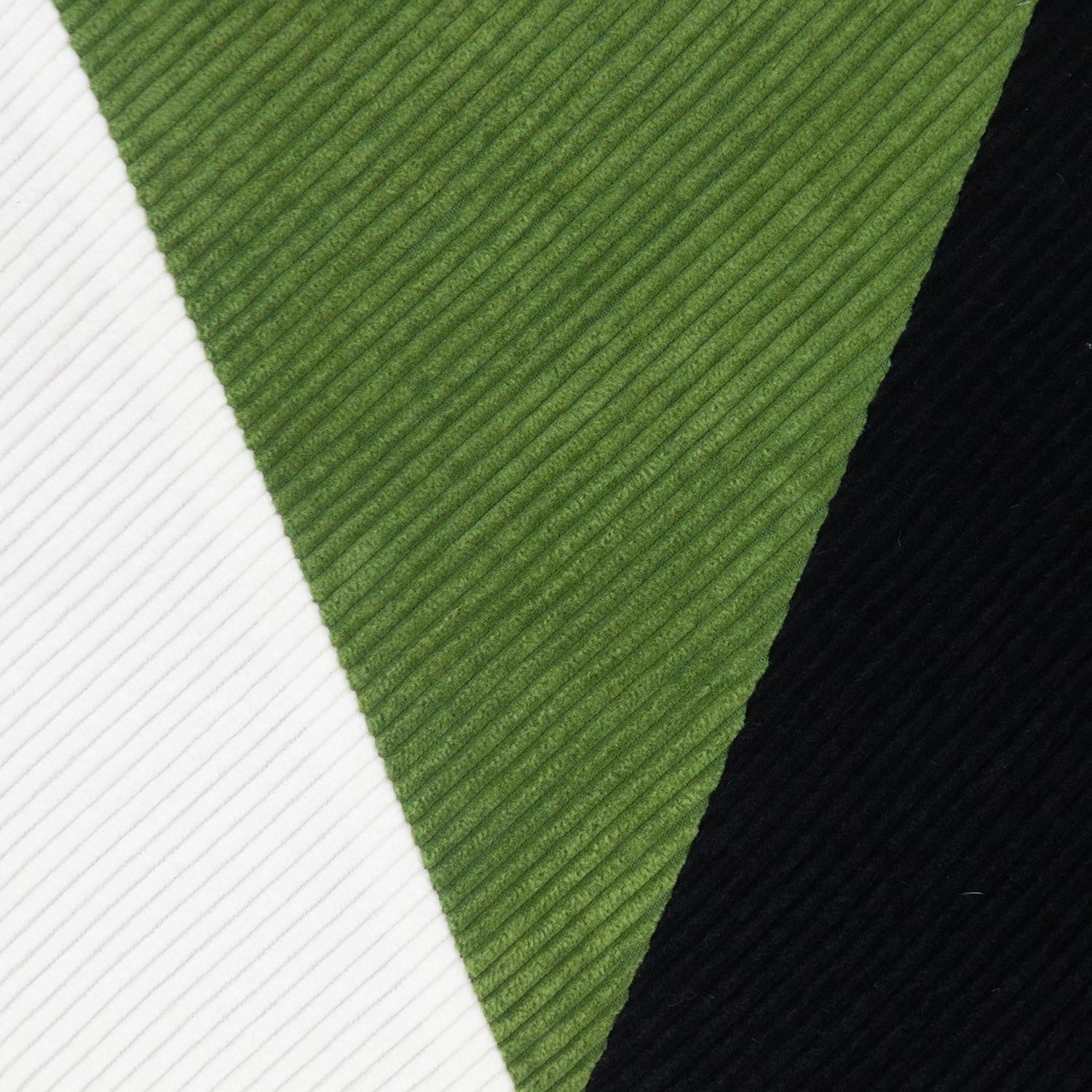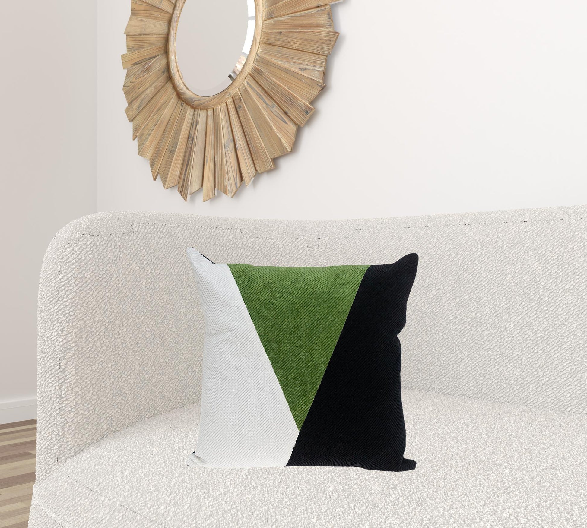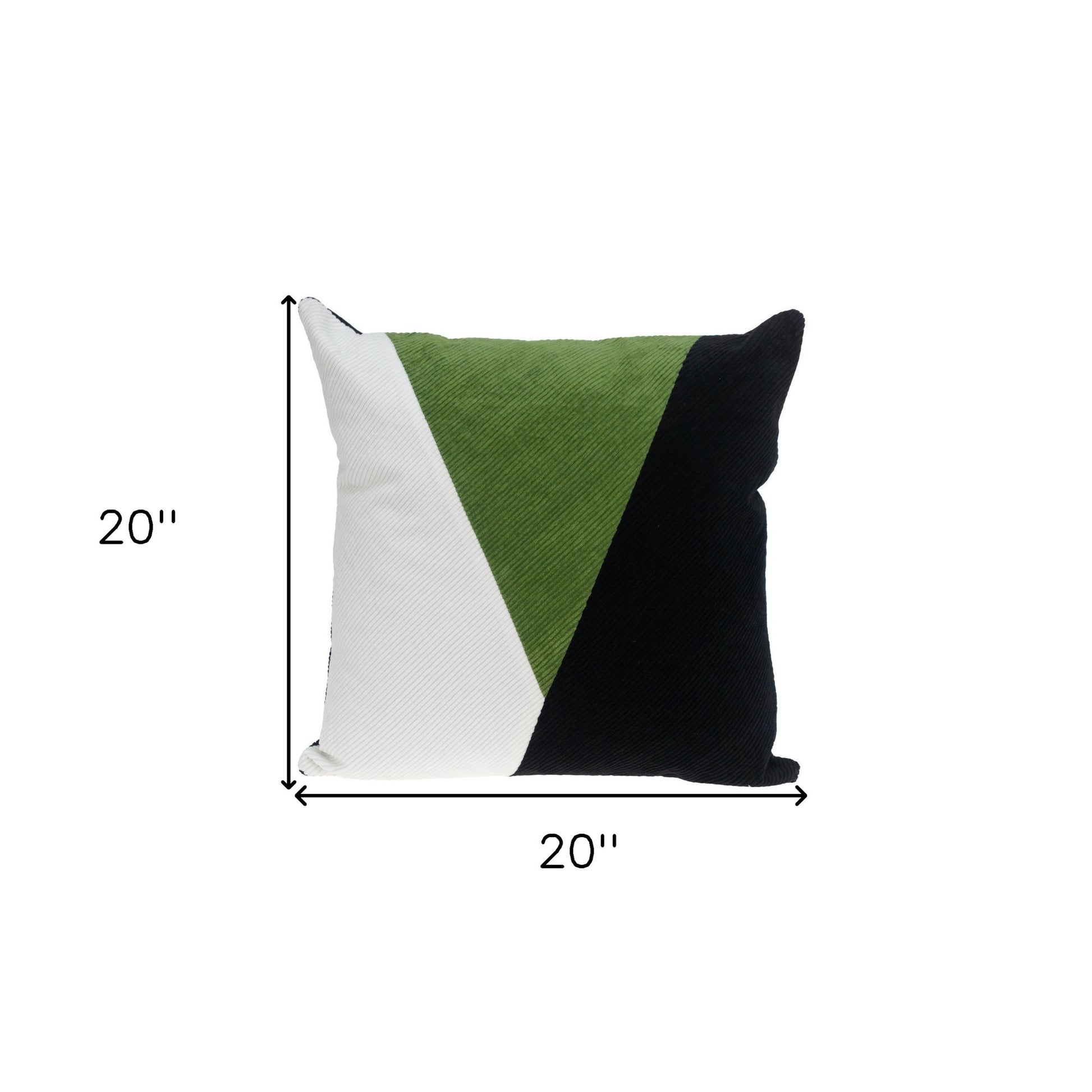 Strike a charm in your home with the Multicolor Green Highlight Soft Touch Throw Pillow. Uniquely designed with corduroy styled lines, this all cotton multicolored pillow shines throughout your home. The three tone geometric hue design makes a bold statement with it's center green triangle highlight. Meticulously crafted to perfection the throw pillow adds a splash of color to your existing material lifestyle. Cozy and captivating this throw pillow makes for an excellent decorative element with it's solid backside that also includes a flap concealing a zipper for easy insertion/removal. Add this throw pillow to your bed, sofa or armchair for a splash of color! 20" x 20" x 4"