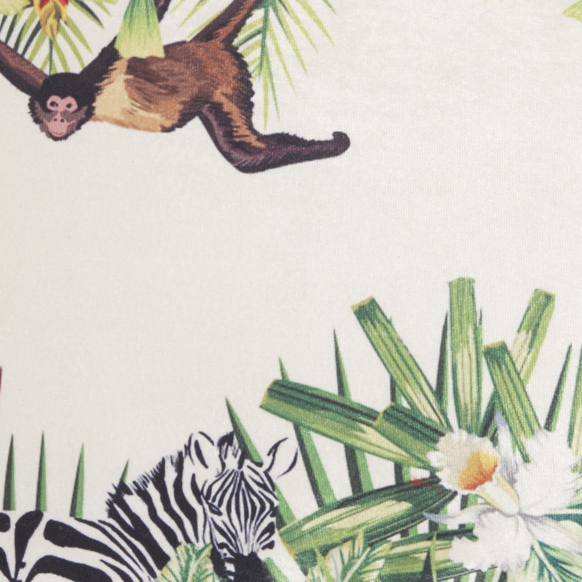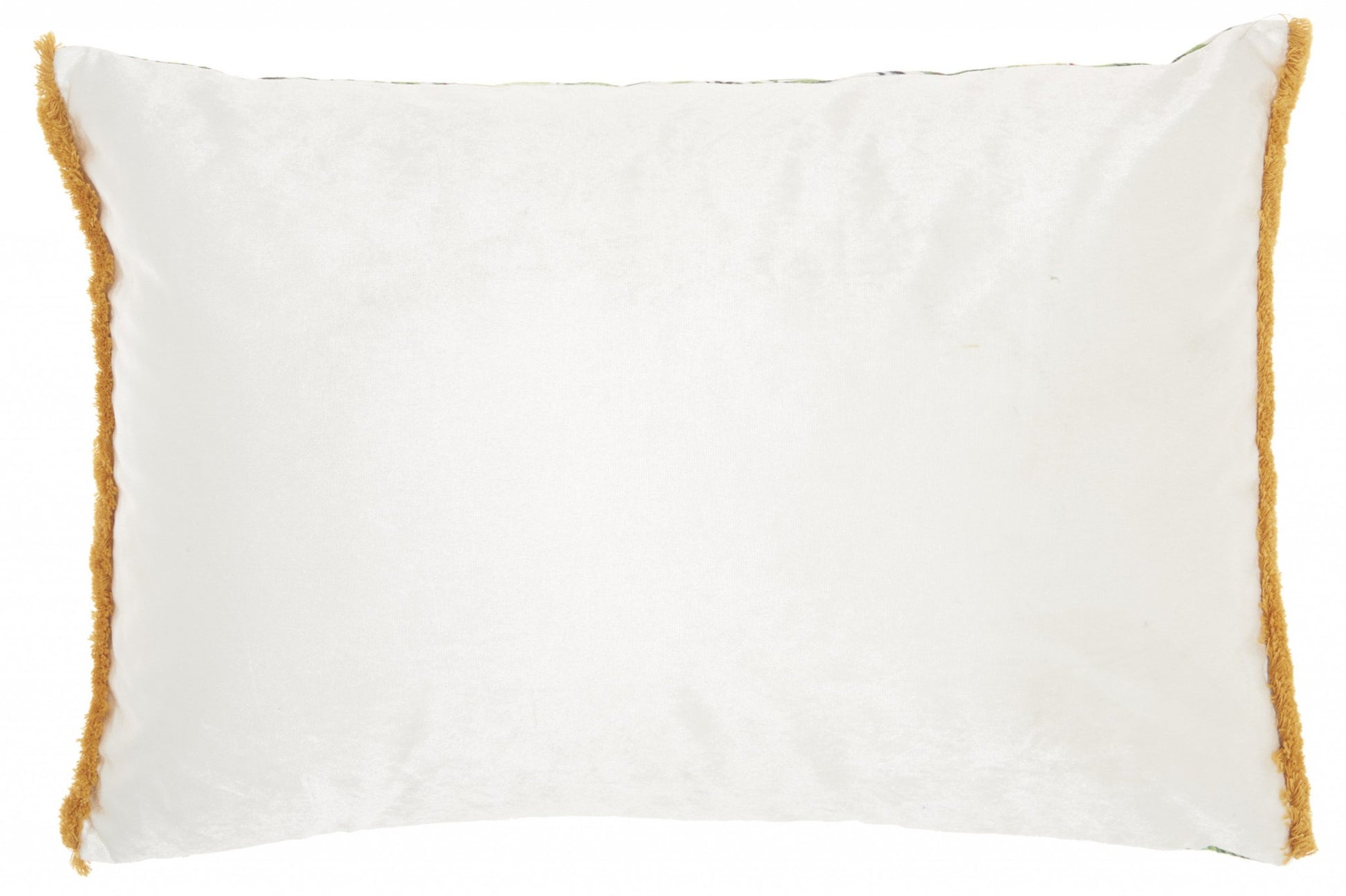 With this Multicolor Jungle Art Lumbar Pillow you can add the perfect pop of color to any seating space in your home. This rectangular shaped pillow is covered in a white colored fabric that serves as the background for the jungle art. The bottom half of the cushion features plants and flowers with a black and white zebra peeking through it while the top half features two monkeys hanging from vines and trees. Two sides have small mustard fringing on them which compliment junglescape perfectly. You can use this lumbar pillow anywhere in your home and add a pop of color to your bed, your couch, or any chair. 5" H x 14" W x 20" D
