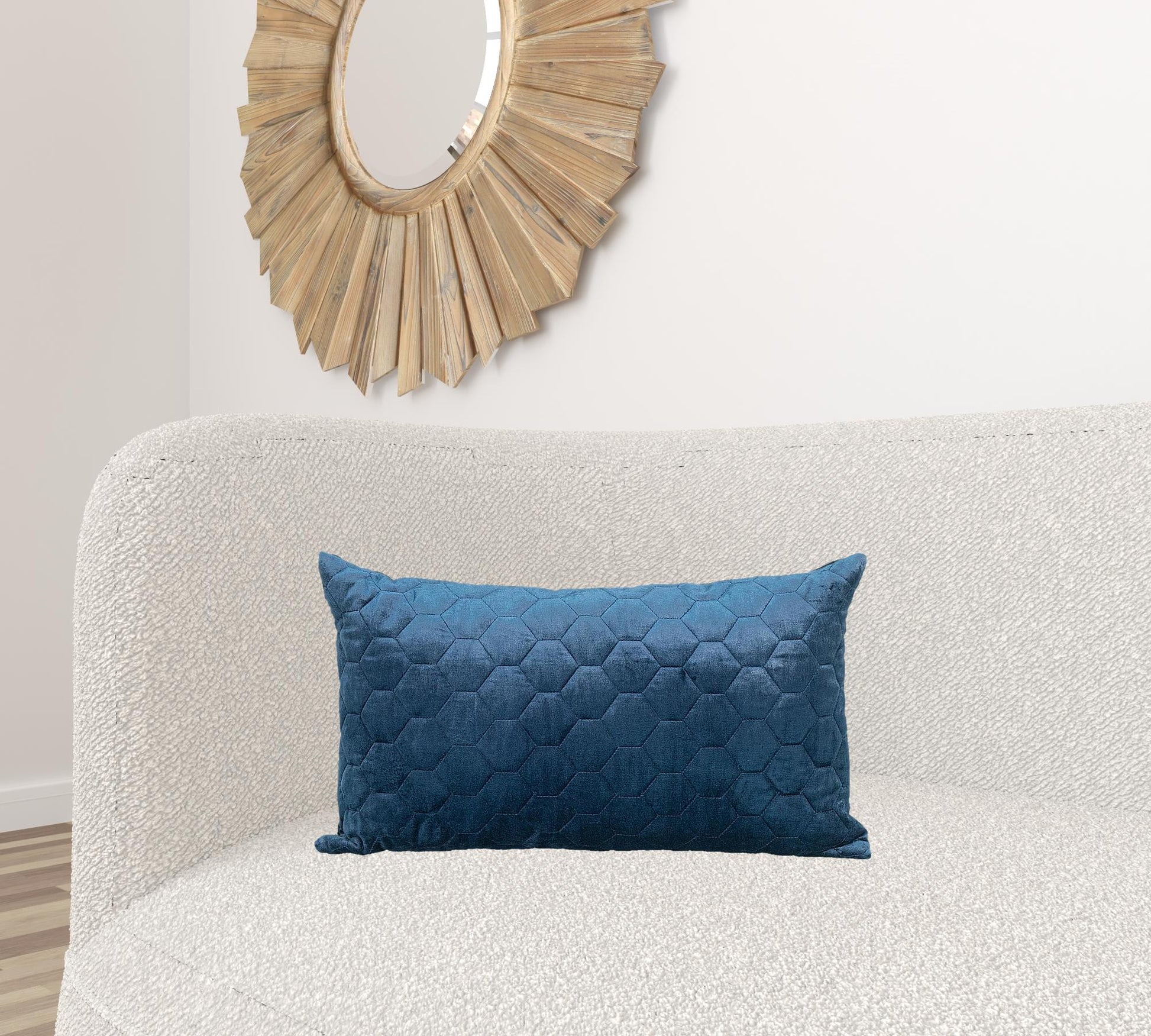 Add some artistry to your existing décor with the Navy Blue Tufted Velvet Quilted Lumbar Throw Pillow. Crafted from a combination of soft cotton and velvet, the cushion has a rather cozy and lush exterior with a quilted geometric pattern that’s surrounds the frontal part of the pillow. It's lightweight nature makes it ideal to toss around from your favorite sofa to your extravagant bed. A hidden flap creatively conceals a zipper provided for easy removal and insertion. Enhance your interior by binging a little character to your home with this functional and luxuriously styled throw pillow. 14" x 24" x 4"