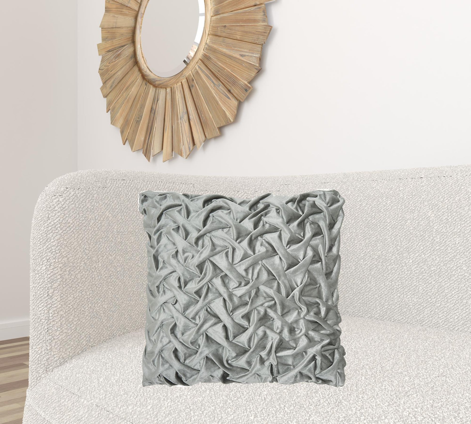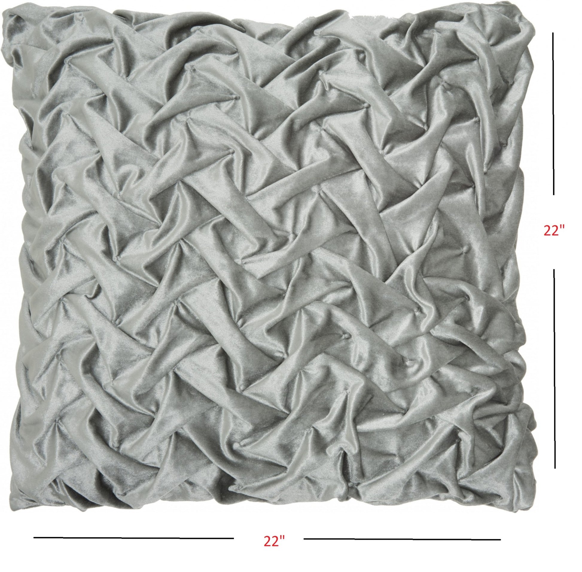Bring a glamourous glow into your home with this stunning Light Gray Pleated Velvet Throw Pillow that exhibits a gorgeous design pattern to be a centerpiece of your living space. The gray-toned luxurious throw pillow is handmade of 100% premium Velvet polyester material to offer the utmost comforting experience while the decorative pleated details add to its surface texture creating visual interest. Enhance the value of your interior with this richly defined throw pillow that adds character to your home. 22” x 22”x 5"
