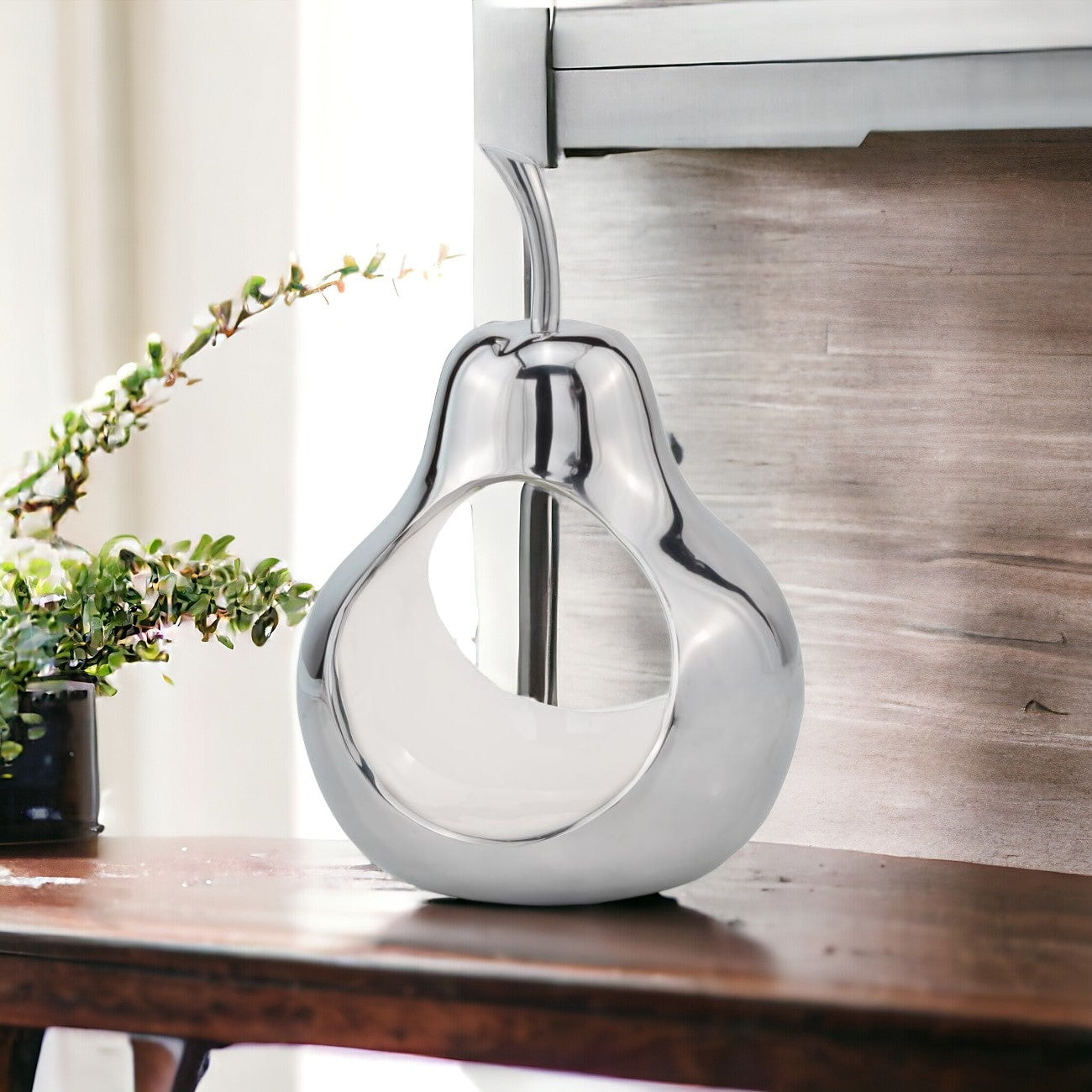 A perfect accent piece on the desk in your office or on the console table in the living room, the Open Pear Bowl makes a modern statement in your home. Sleek and stylish, this cast Aluminum decorative accent is in the shape of an pear and cutout to accommodate small fillers. Finished with a beautiful white enamel interior and shiny buffed exterior, it's complete with a realistic shape stem.