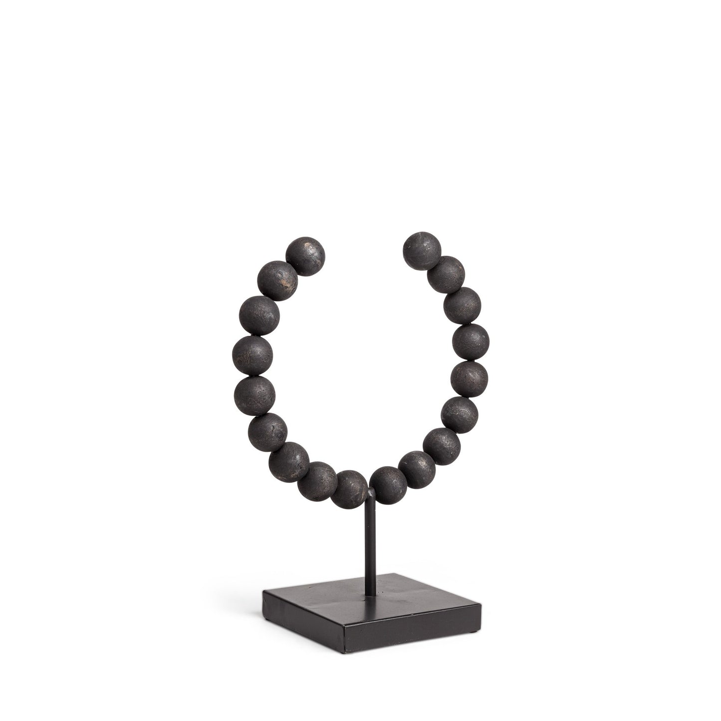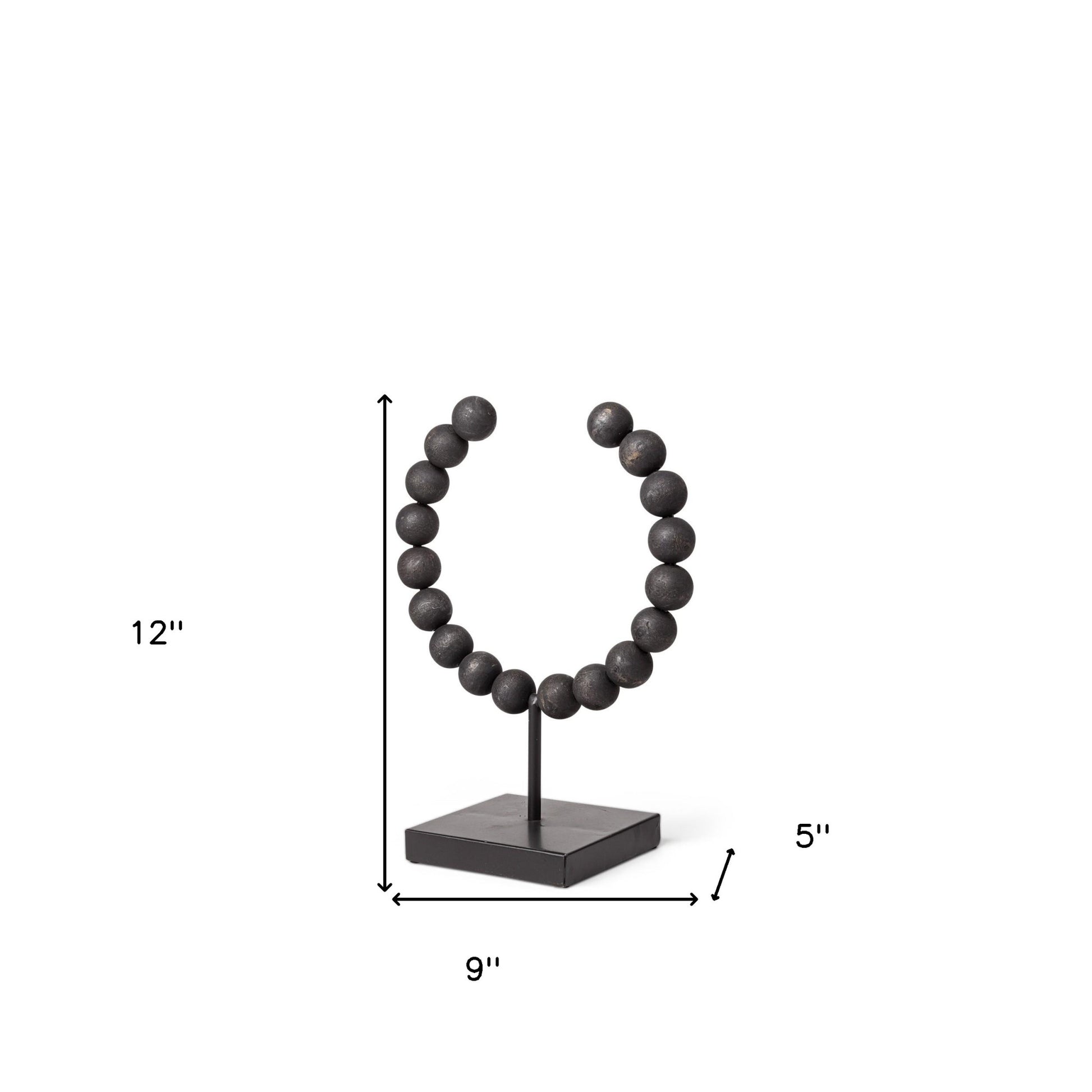 With this contemporary inspired Petite Black Beaded Decor Piece, you can elevate any space in your home. This piece features a square base that is made from solid metal and has a matte black finish on it. From this base there is a metal rod in the same color that rises up and hold the black beaded piece in place. This beaded piece is made has a metal frame in the shape of a C and has black beads threaded on either side. This small unique piece will look great as part of your existing decor or you can also use it as a stand-alone piece anywhere in your home. 12" H x 5" W x 9" D