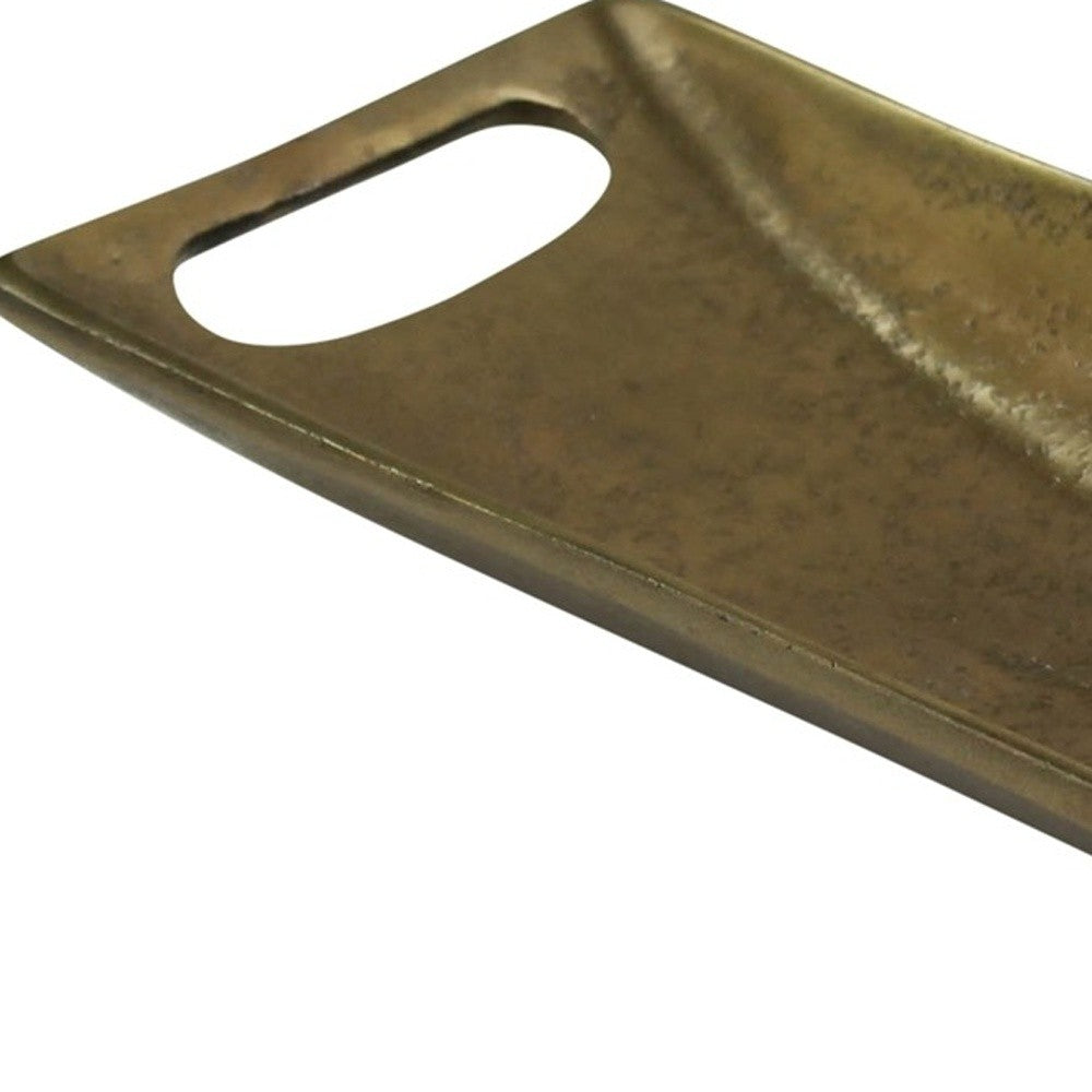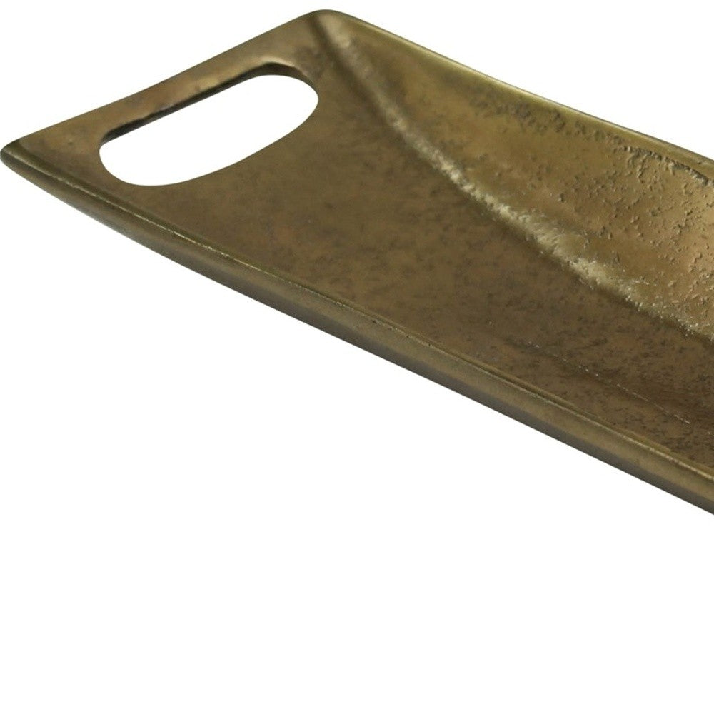 With this Petite Gold Metal Boat Shaped Tray you can add a touch of contemporary design to your dinner table. This tray is made from solid metal and has a shiny gold finish on top. The low boat shape has higher sides with two holes cut out on either side to serve as handles. This tray can be used to display decor pieces around your home, store fruit in your kitchen, or to serve snacks at your next dinner party. 0.75" H x 4" W x 11.5" D
