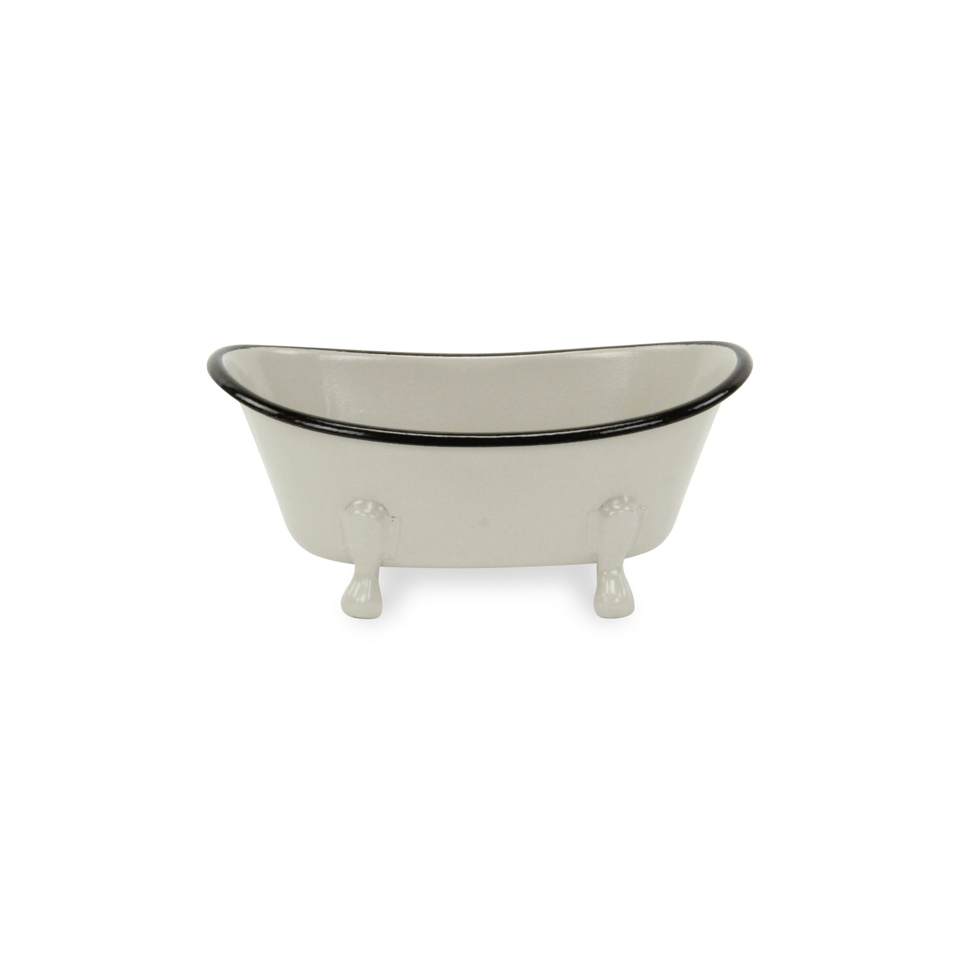 Add a whimsical touch to any space in your home with this Petite Light Gray Bathtub Decorative Sculpture. This piece is made from solid metal and is colored to a light gray finish. The claw foot bathtub shape has a black colored rim and four feet underneath which add a nice depth to the overall look. You can use this piece as decor around your home or you can line in with plastic and use it as a fun planter outdoors or indoors. 3.25" H x 7" W x 4" D
