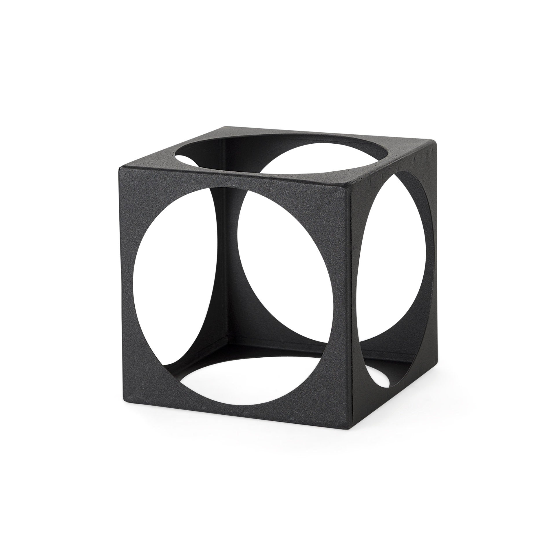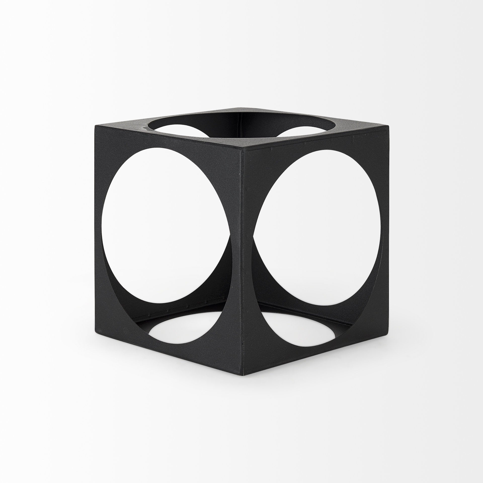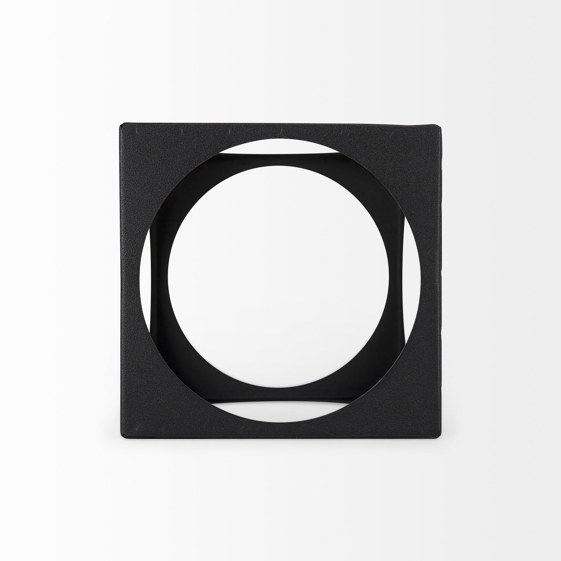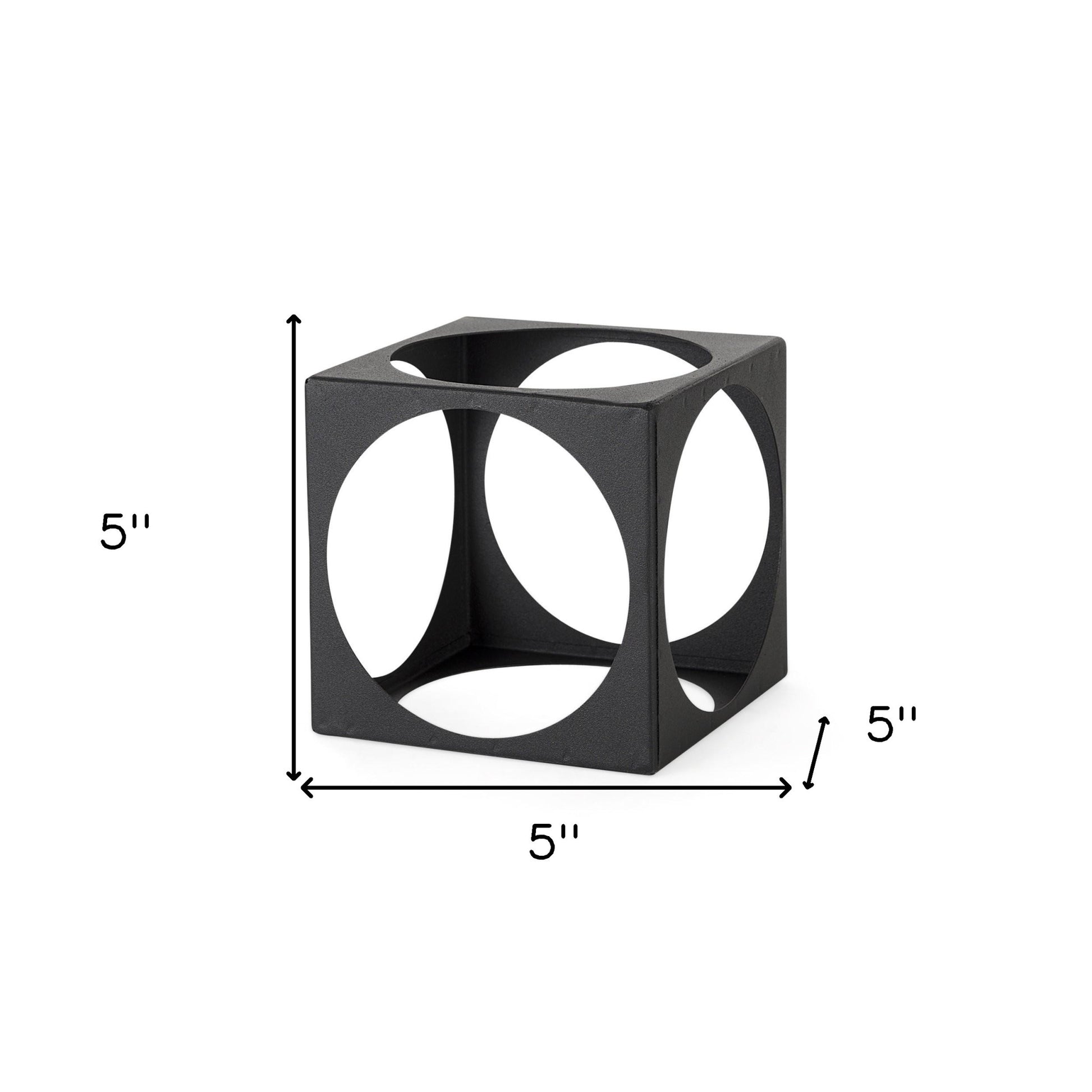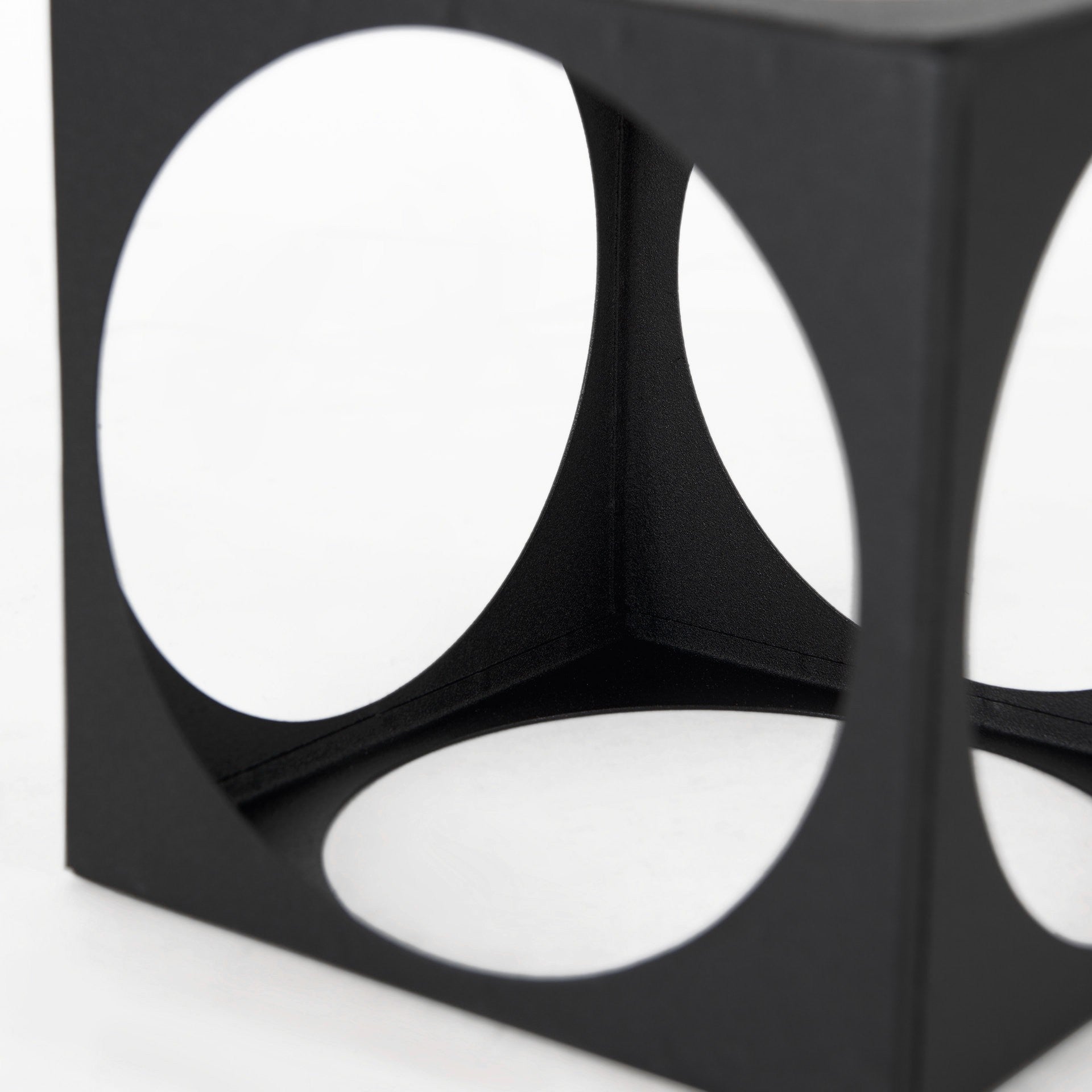 This Petite Black Metal Sculpture will make the perfect addition to the decor in your home. This small piece is made from solid metal and has a matte black finish on it. The square shape is made up of four different metal plates attached at each corner. These metal plates have big circles cut out from them which gives this piece a minimal and contemporary look. This decor piece has a very art-inspired look and will elevate any space you use it in. It will be great as part of your existing decor or as a stand-alone piece on a bookshelf or an end table. 5" H x 5" W x 5" D