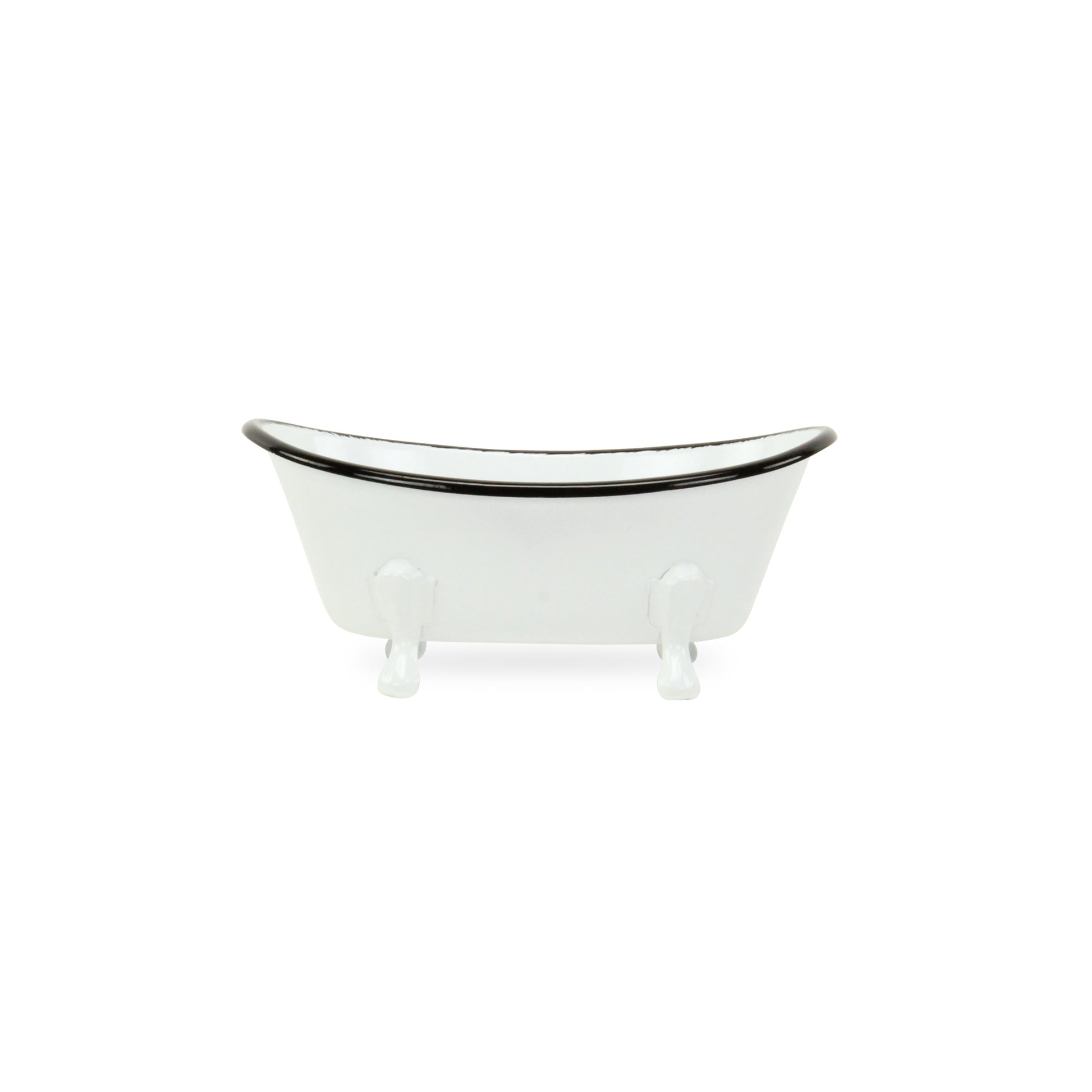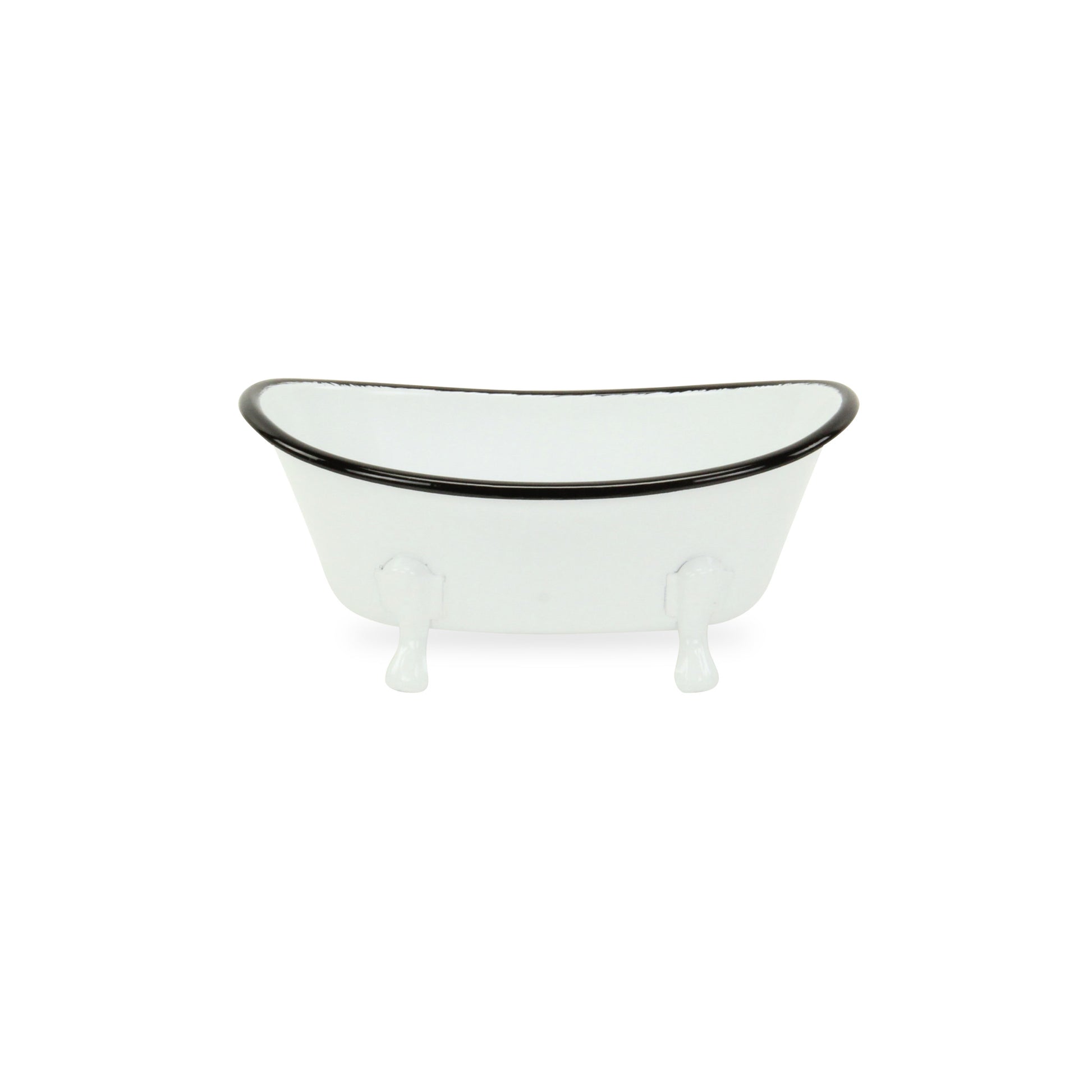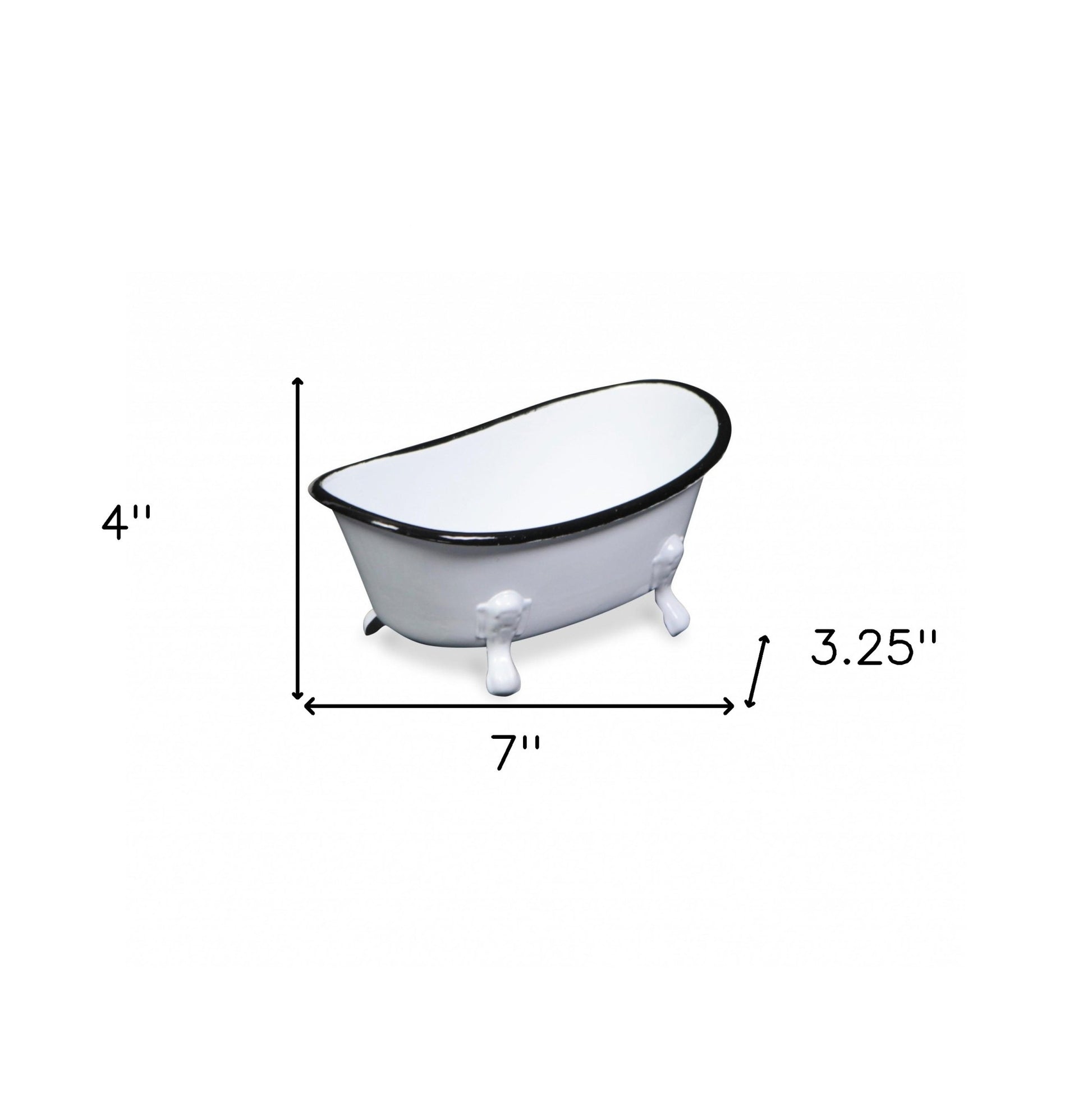Add a whimsical touch to any space in your home with this Petite White Bathtub Decorative Sculpture. This piece is made from solid metal and is colored to a white finish. The claw foot bathtub shape has a black colored rim and four feet underneath which add a nice depth to the overall look. You can use this piece as decor around your home or you can line in with plastic and use it as a fun planter outdoors or indoors. 3.25" H x 7" W x 4" D