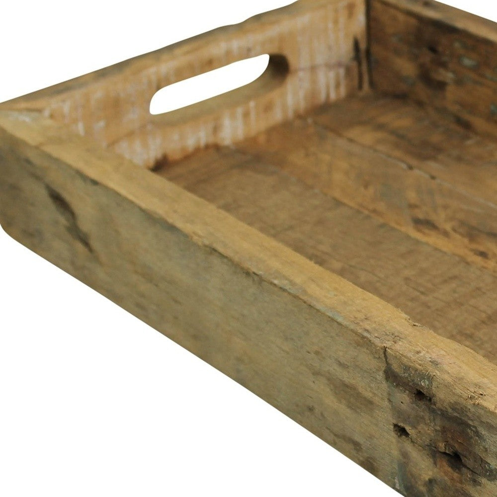 With this Petite Wooden Block Serving Tray you can bring in a touch of rustic design to your home. This tray is made from solid wood and features a block design with raised sides. The light brown varnish on top looks very natural and allows the wooden grain and details to show through. The handles on either side are cut into the wooden tray and make it easy for you to move it around. This tray can be used as a decorative tray, or as a centerpiece to display smaller decor items. You can also use it serve drinks and snacks at your next dinner party. 3" H x 10" W x 16" D