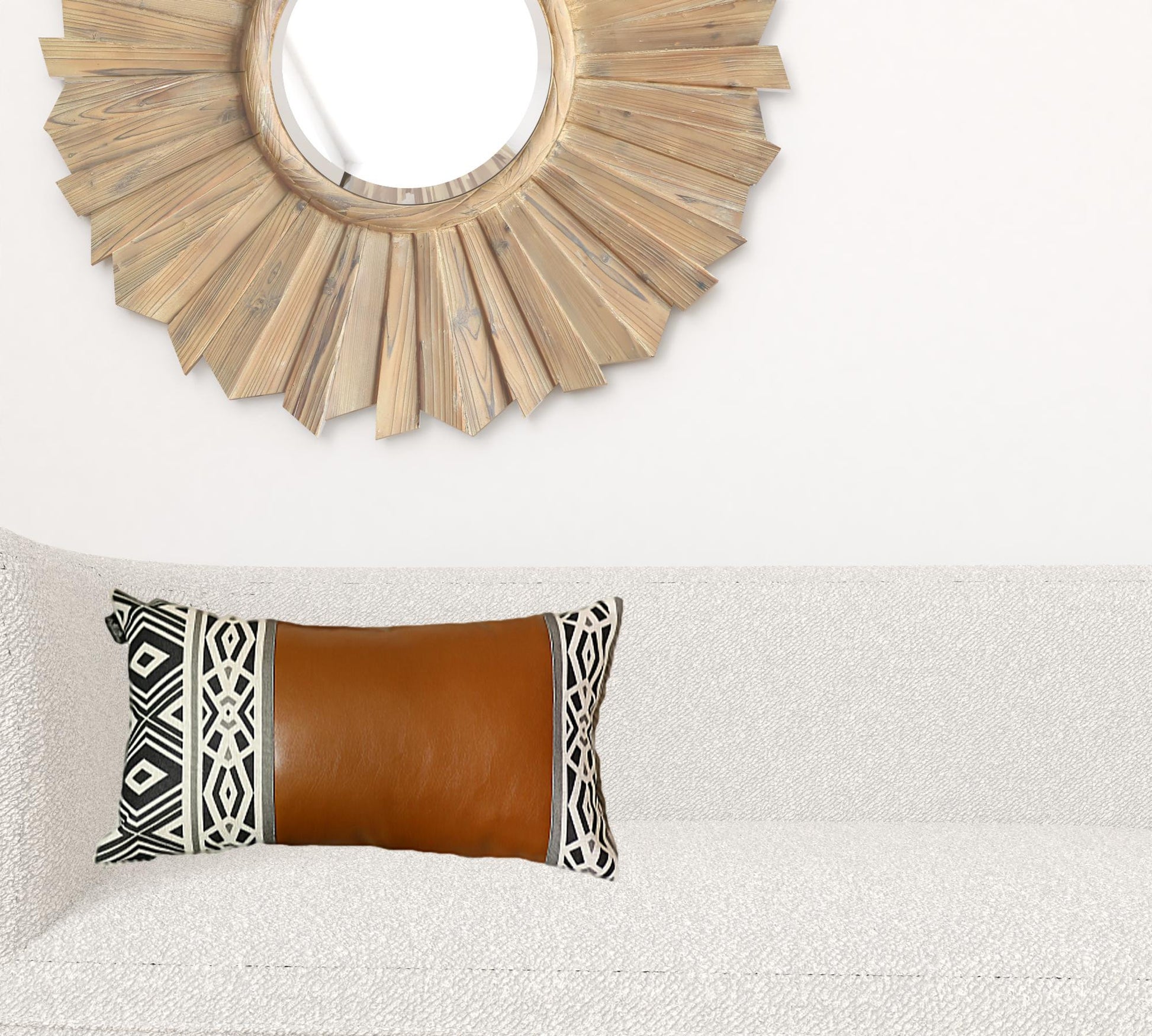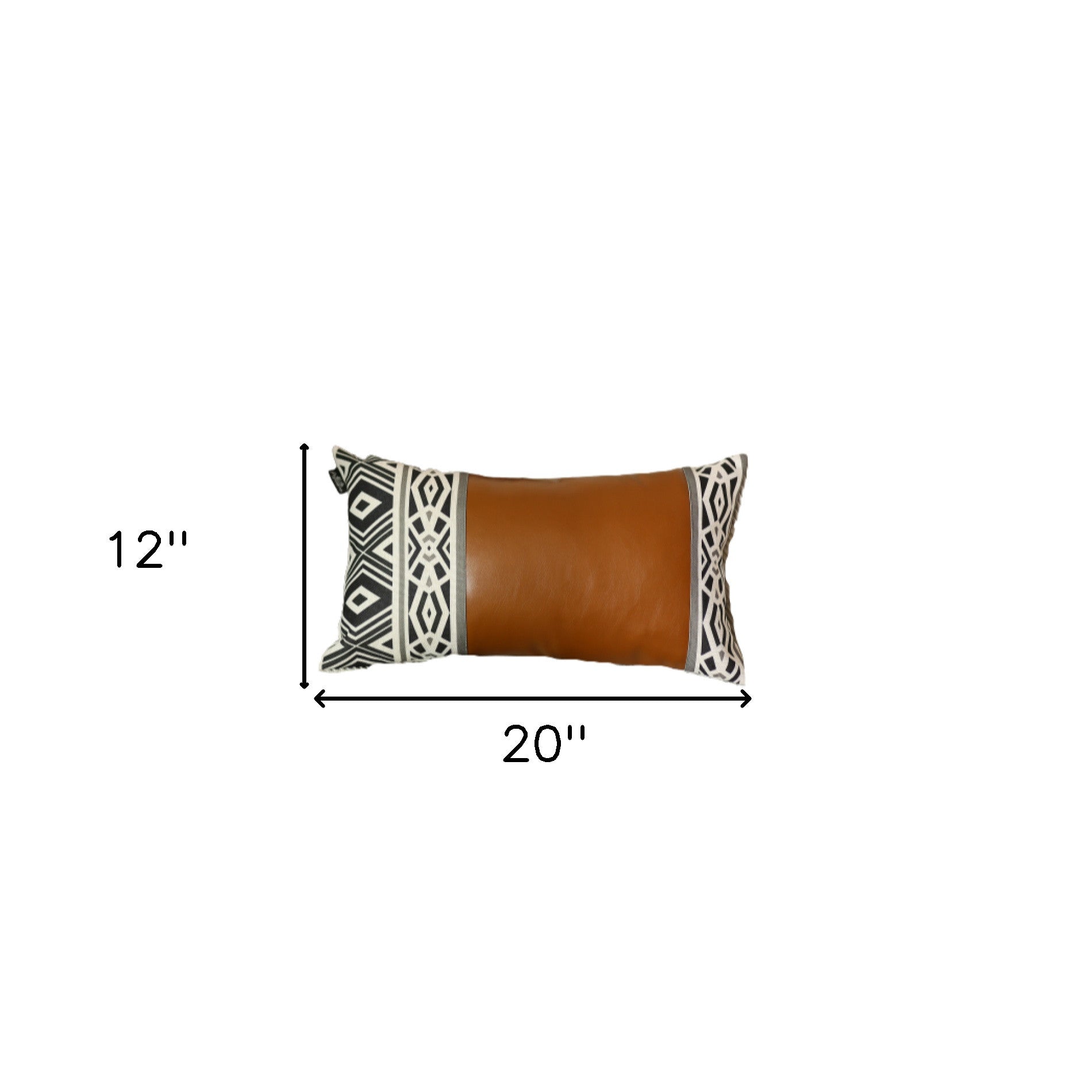 Induce a countryside feel to your living space with this uniquely designed Rectangular Rustic Brown Faux Leather and Geometric Patterns Lumbar Pillow Cover. With a base of Charcoal Black and Daisy White geometric patterns, the bright brown faux leather section in the middle just intensifies the Bohemian essence. The fabric is OEKO-TEX standard 100 certified, which speaks for its quality and product safety. This soft lumbar pillow cover feels more like a single seamless piece with its hidden zipper closure all-around. Place this comfortable lumbar pillow anywhere in your home and it will blend in the aesthetics of your decor, adding more depth to your room. 12" x 20" x 0.08”