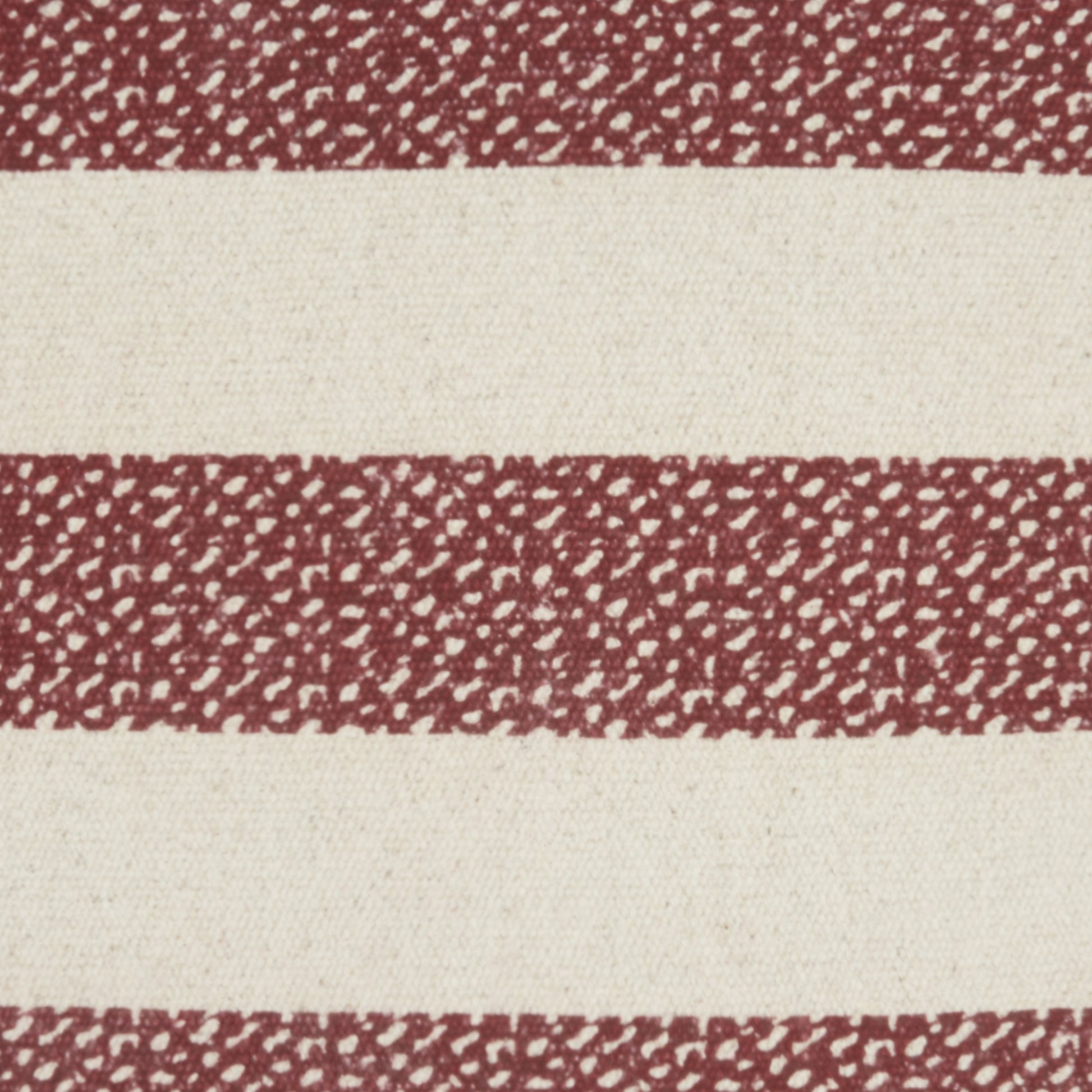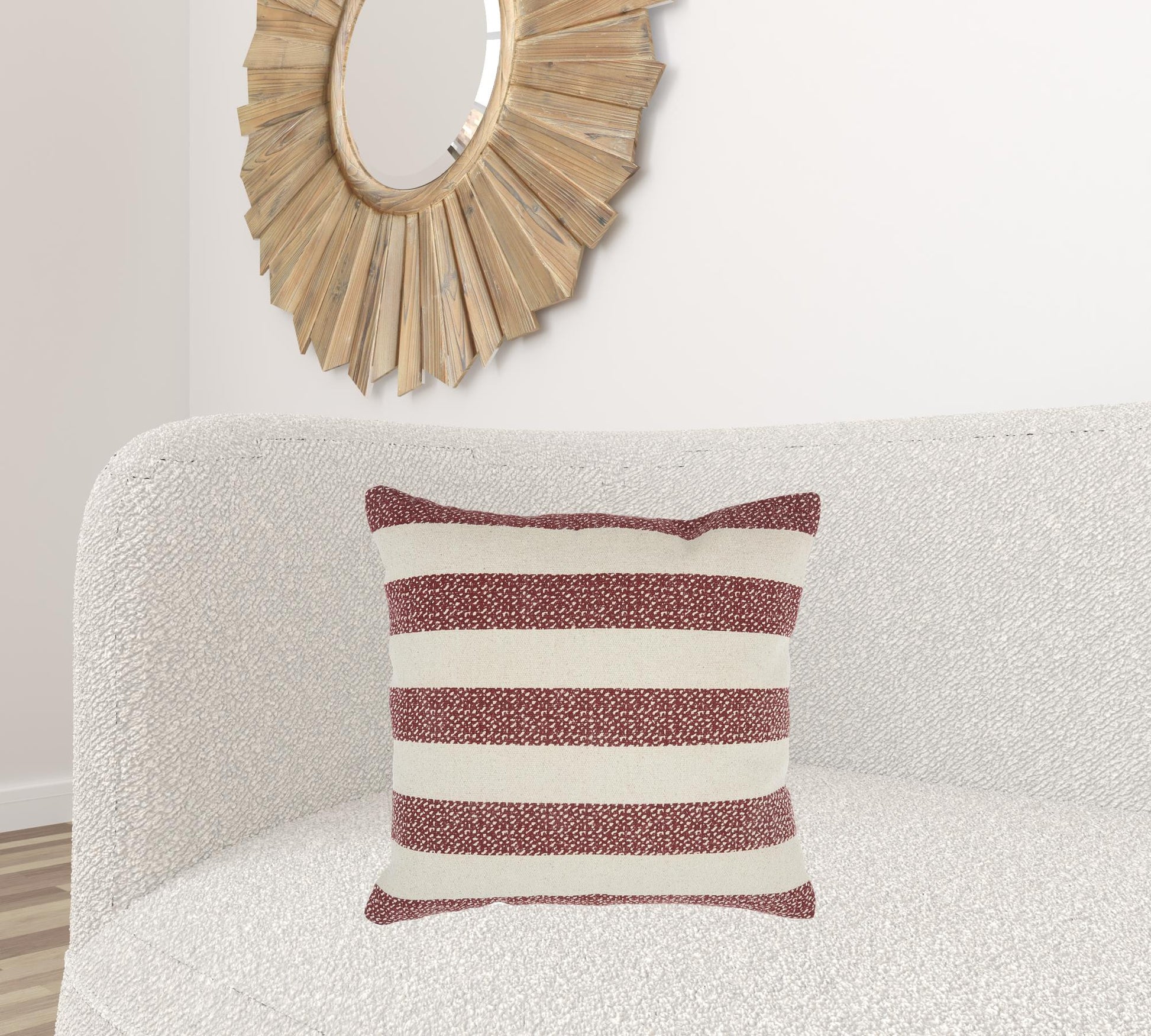 This Red and Ivory Stripes Throw Pillow is made to give your casual living space a soft and cozy outlook while helping the other aspects of your decor stand out. The soft-touch texture and rustic red stripes together give a deep sense of relaxation for anyone who holds it. The experience is further heightened with the use of 100% cotton throughout the body of the pillow making sure your living room stays sleek for years on end. Make your home the center for comfort in your life using your creativity and this simple yet rustic functional decorative piece. 20” x 20” x 5"