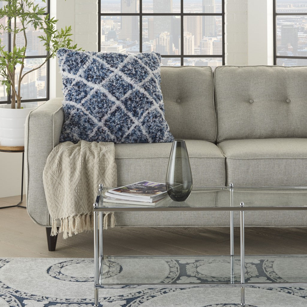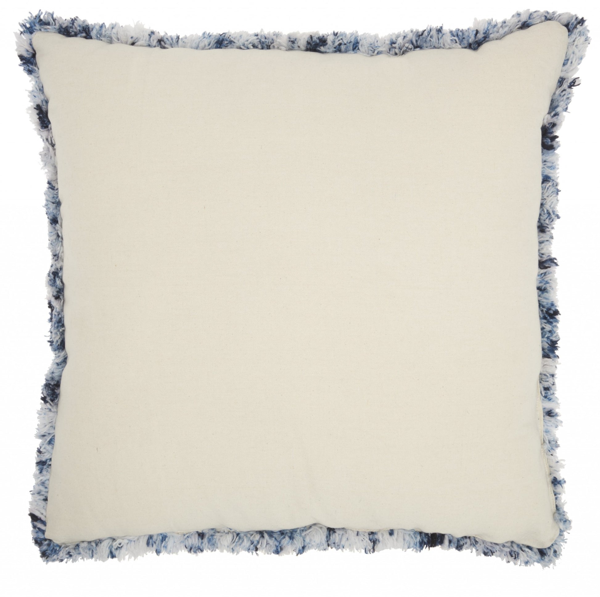 Bring in a touch of shabby chic design to your seating spaces with this Royal Blue and White Shaggy Chevron Throw Pillow which combined comfort and style beautifully. The pillow is covered in a shaggy fabric that has a royal blue and white colorway. On top of this background there is a white colored chevron pattern. The comfortable fabric covered a polyester filling which completes the feeling of luxurious coziness no matter where this pillow is placed. Use it in your bedroom, on your couch, or your favorite chair. 5" H x 24" W x 24" D
