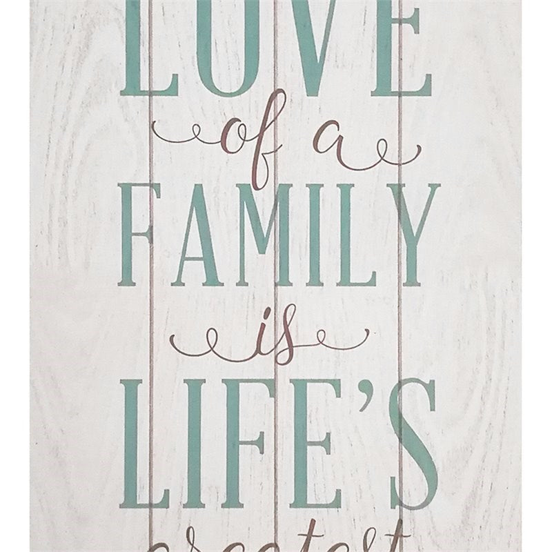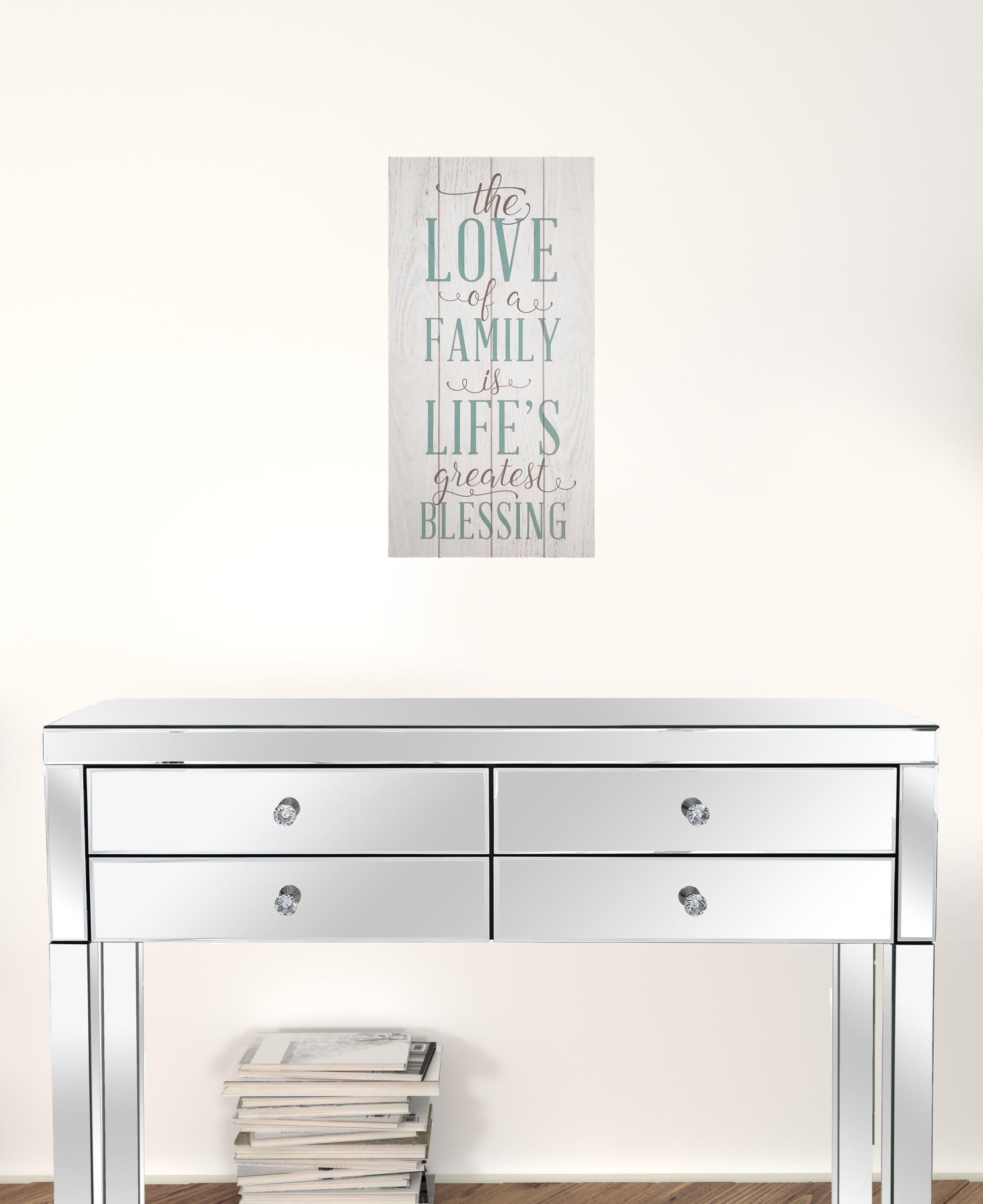 Practicing gratitude is being in the habit of showing thanks for all of the blessings in your life. This typography art is artistically printed on a natural whitewash wood panel bearing the inscription "The Love of a Family Is a Life's Greatest Blessing". Pops of aqua/turquoise mix with grey to give this handcrafted and hand painted work of art a true loving and homey feeling. Add this piece to your gallery wall to complement your bedroom or living room decor. 100% wood. Comes ready to hang in a vertical oientation. Wipe clean with damp cloth. It is 10" X 1.5" X 20" ".