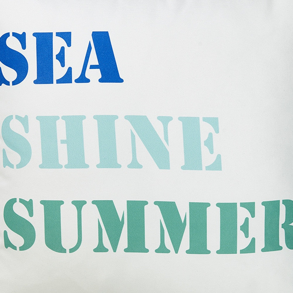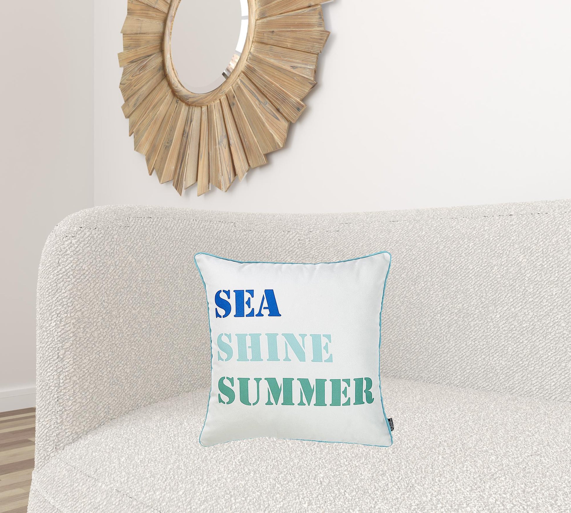 Distinct and colorful, this square White, Blue and Green "Sea Shine Summer" Decorative Pillow Cover will help to instantly light up and upgrade your room. This unique piece will be brighten up the room and showcase your high sense of style. Perfect for beach house or anywhere you want to invoke a little bit of that sunshine summer feel. The hidden zipper closure provides a clean and seamless look all the way around, while the 100% brushed polyester provides a soft hand. 18" X 18" High-quality digital printing in the front, back side is solid white color with aqua piping all around. Inserts are not included. Machine Wash Cold Separately, Gently Cycle Only, No Bleach, Tumble Dry Low, Do Not Iron.