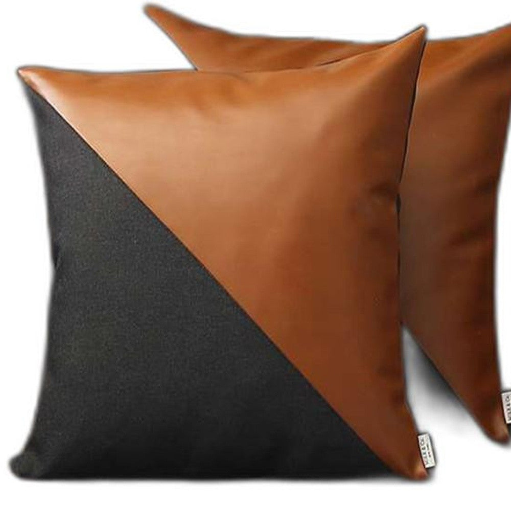 Set Of 2 Black And Faux Leather Lumbar Pillow Covers