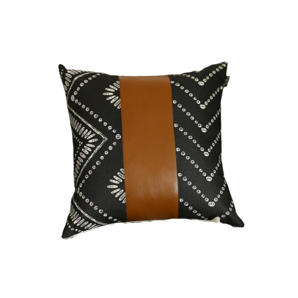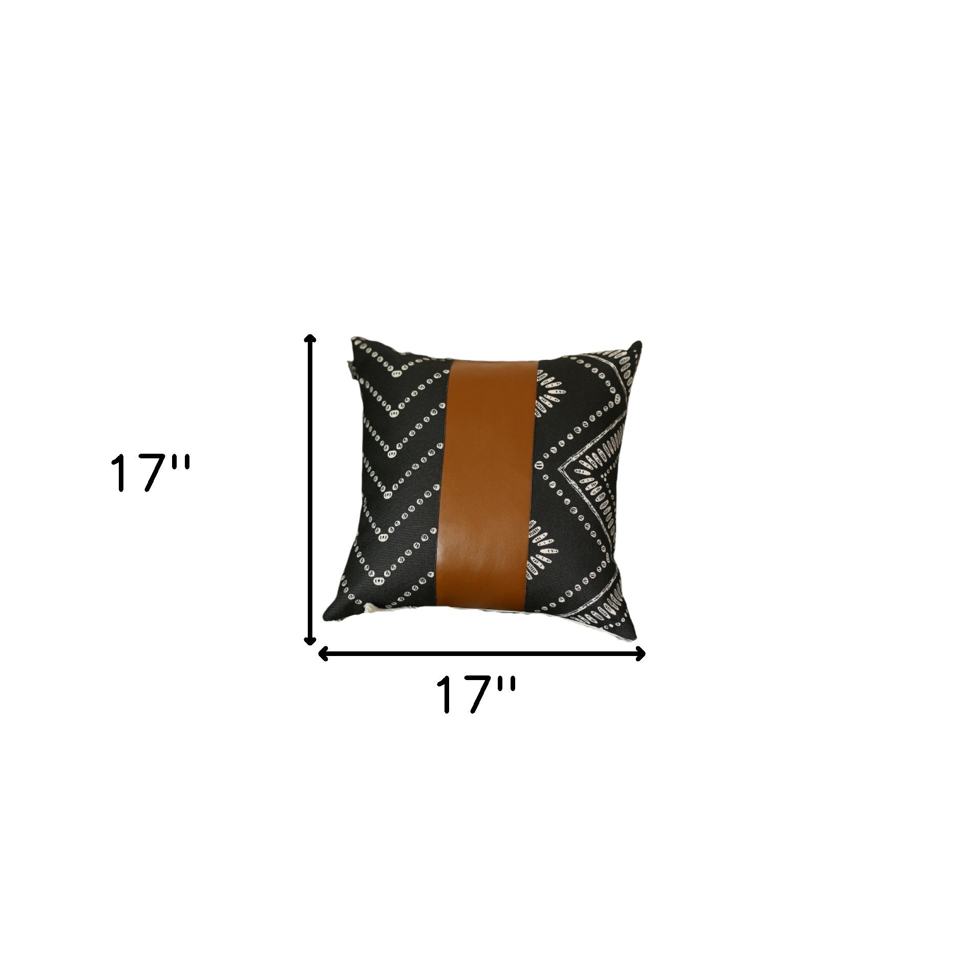 The Set of 2 Ikat Styled Patterns and Bright Brown Faux Leather Pillow Covers will emphasize a visually calm yet exquisite essence in your living room. The white zigzag pattern on an ebony black background of pure polyester is ornated with a caramel brown faux leather finish in the center. For a prominent finished look, this unique pillow cover sports a hidden zipper on all sides. The fabric is OEKO-TEX Standard 100 certified, proclaiming the quality and safety of these pillow covers. This square-shaped set of 2 vegan faux leather pillow covers will definitely earn compliments from your guests. 17” x 17” x 0.08”