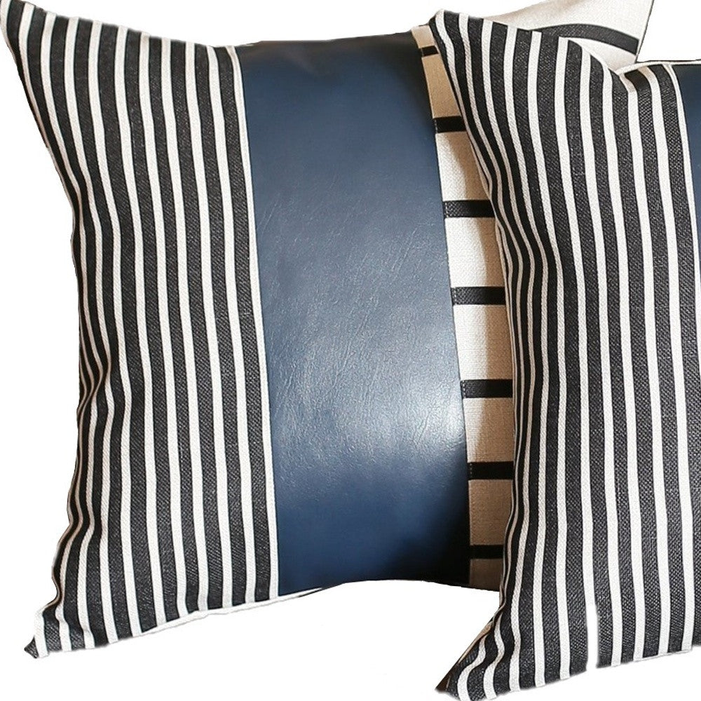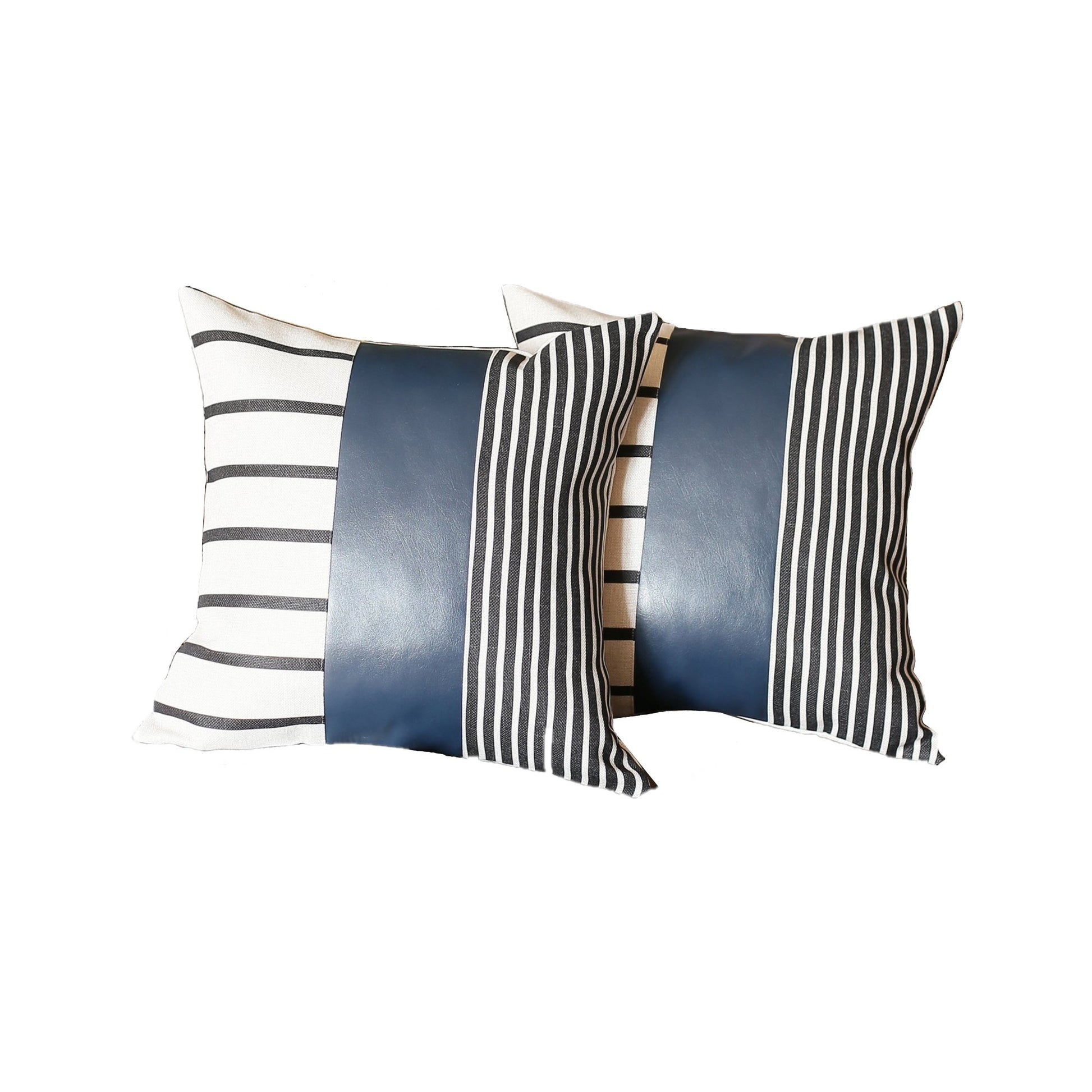 The classic styling of this Set of 2 Monochromic Stripe Ends and Spruce Blue Faux Leather Lumbar Pillow Covers accentuates a timeless design to fit in with any interior style from Traditional to Contemporary. The clean horizontal and vertical reverse stripes in polyester fabric on two ends with a deep blue vegan faux leather sliding down the middle creates a defined visual effect. The hidden zipper closure provides a smooth and continuous texture to the overall look. Pair this set of 2 square-shaped pillow covers with accents of neutral or vibrant schemes to enhance the aesthetics of your home. 17” x 17” x 0.08”