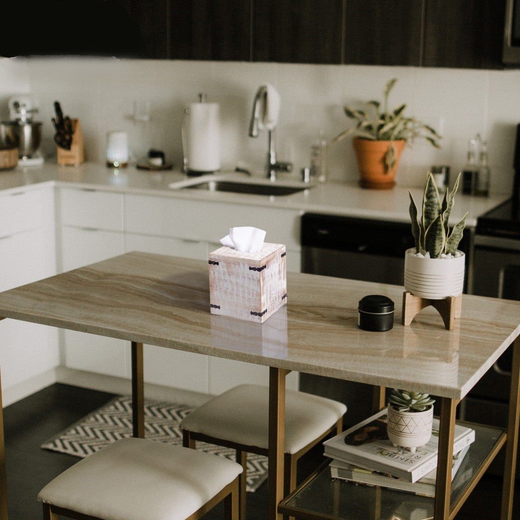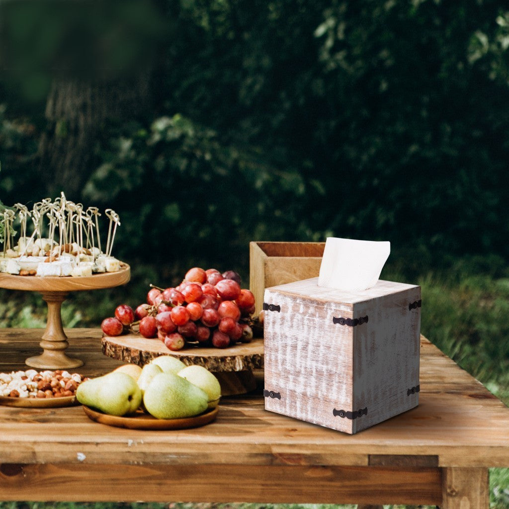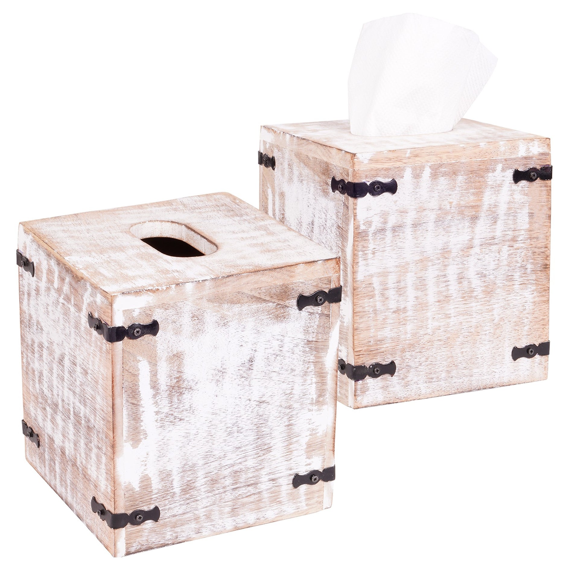 Literally change the way you see tissue boxes with this updated farmhouse chic Rustic White Mango Wood Square Tissue Holder. Say no more to those unsightly cardboard tissue boxes on your counters, tables and desks. Upgrade to this great looking handmade decorative wood tissue box cover that will elevate your space. Fits most rectangular tissue boxes - even the smaller ones. When the box is empty, you can easily slide out the bottom panel to restock it. This set of 2 Tissue Box Holders create an ideal gift for your friends and family who love to keep everything in order. 6.5" x 5.7" x 5.7".