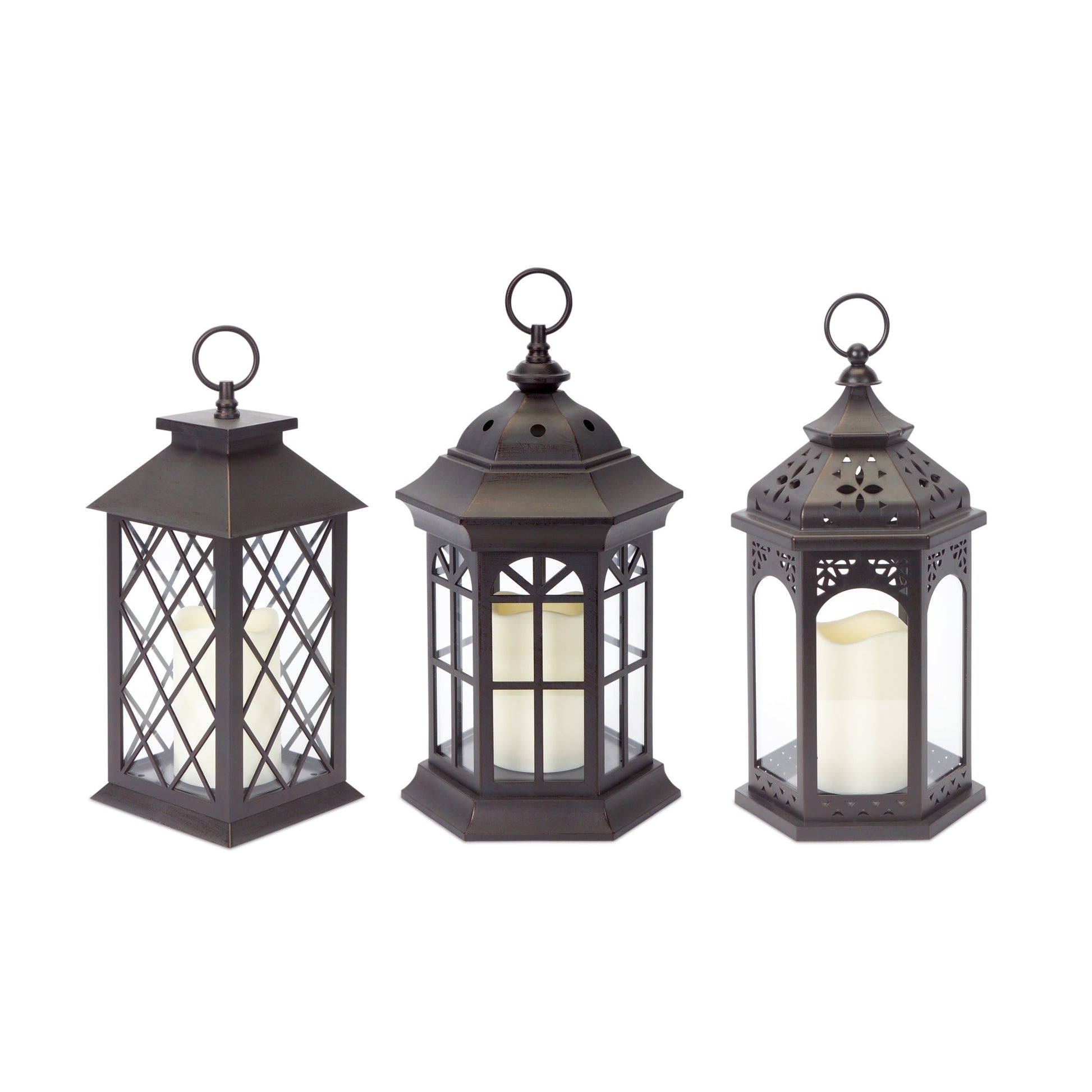 This set of three brown flameless floor lantern candle holder is perfect whether you’re creating a beautiful tablescape centerpiece or looking to illuminate a space. Pair with one size flameless candles for a good looking and hassle-free way to illuminate your entire space. Ships with candles included for added value and ease of use. Sold as a set of 3, this candleholder makes both the perfect gift and functional, decorative accent. Add an extra pop of personality to every corner of your home with this gorgeous candleholder Candleholders are a decorative accent on their own. They are also an attractive way to turn a simple candle into a piece of décor on its own. 13.25" H x 7" W x 7.75" D