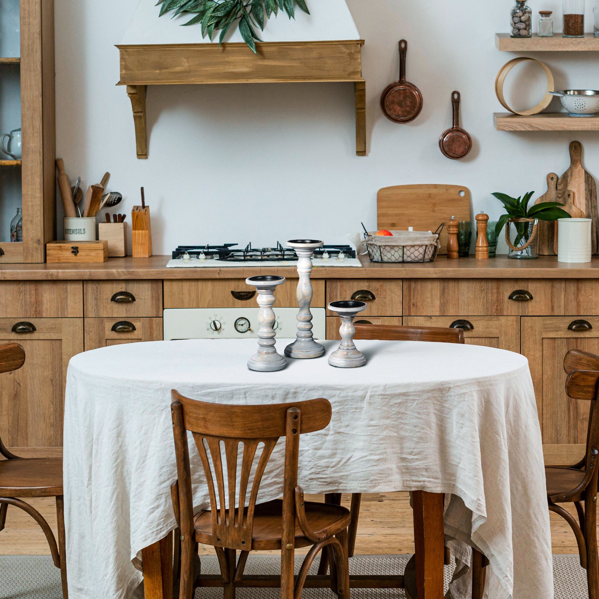 Add a positive accent to your room with this Set of Three fabulous Genuine Wood Hand Carved Pillar Candle Holders. This set of three includes a 6", 9", and 12" pillar holder, each of which has been passionately hand carved and detailed by skilled artisans. Using eco-friendly real wood, these pieces will show true knots and grains that are the hallmark of genuine mango wood, making it so that no two will be exactly alike. The rustic pale gray finish gives this pillar holders an aged vintage look that will blend in with many decors. Place them together or separately to upgrade your space today. Set of 3.