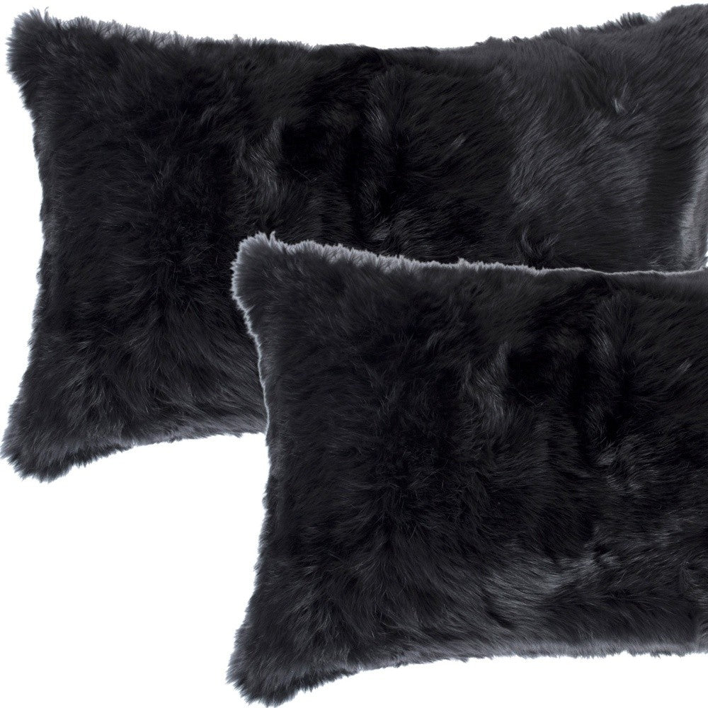 Set Of Two 12" X 20" Black Rabbit Natural Fur Throw Pillows