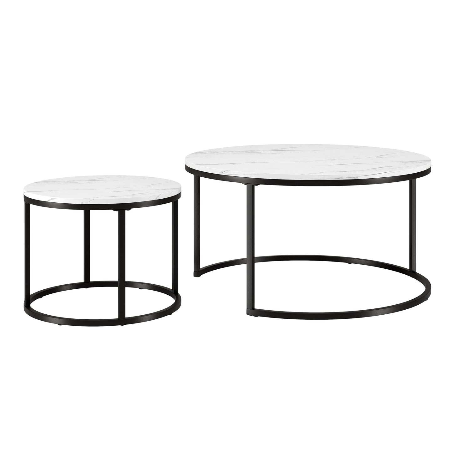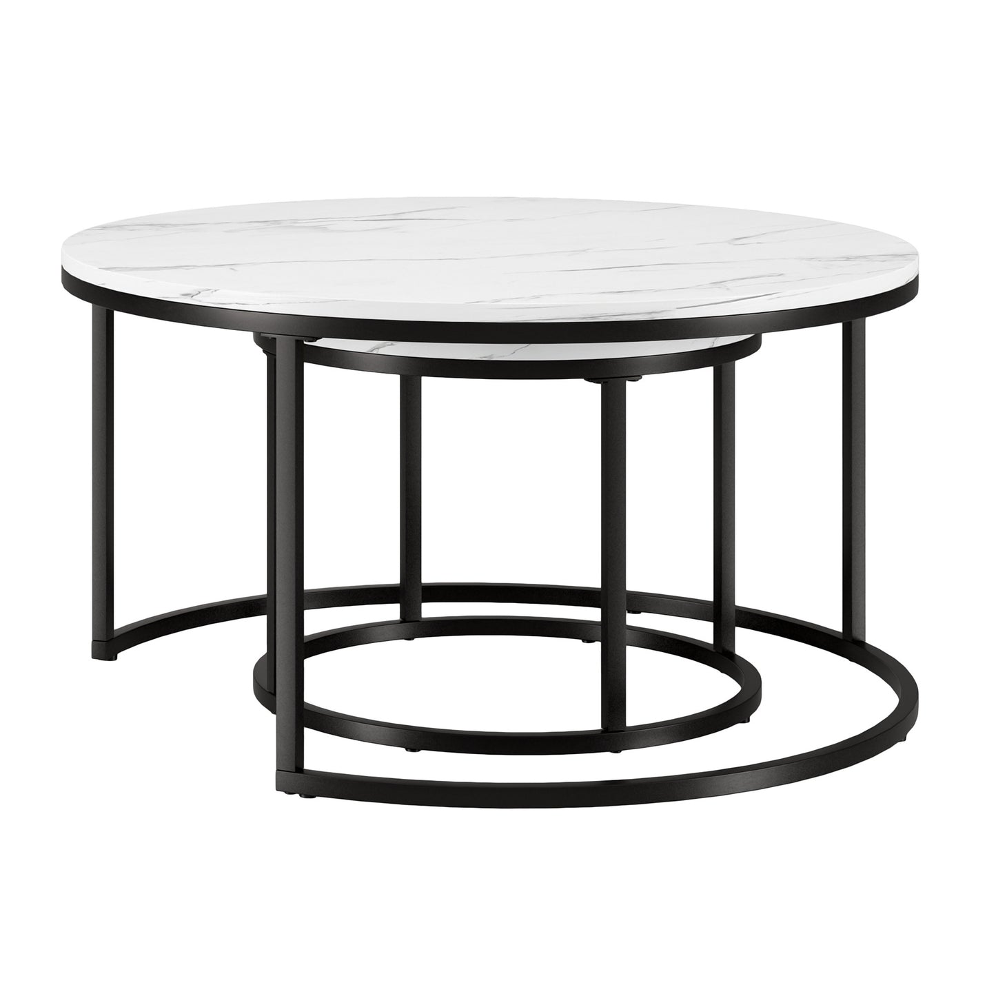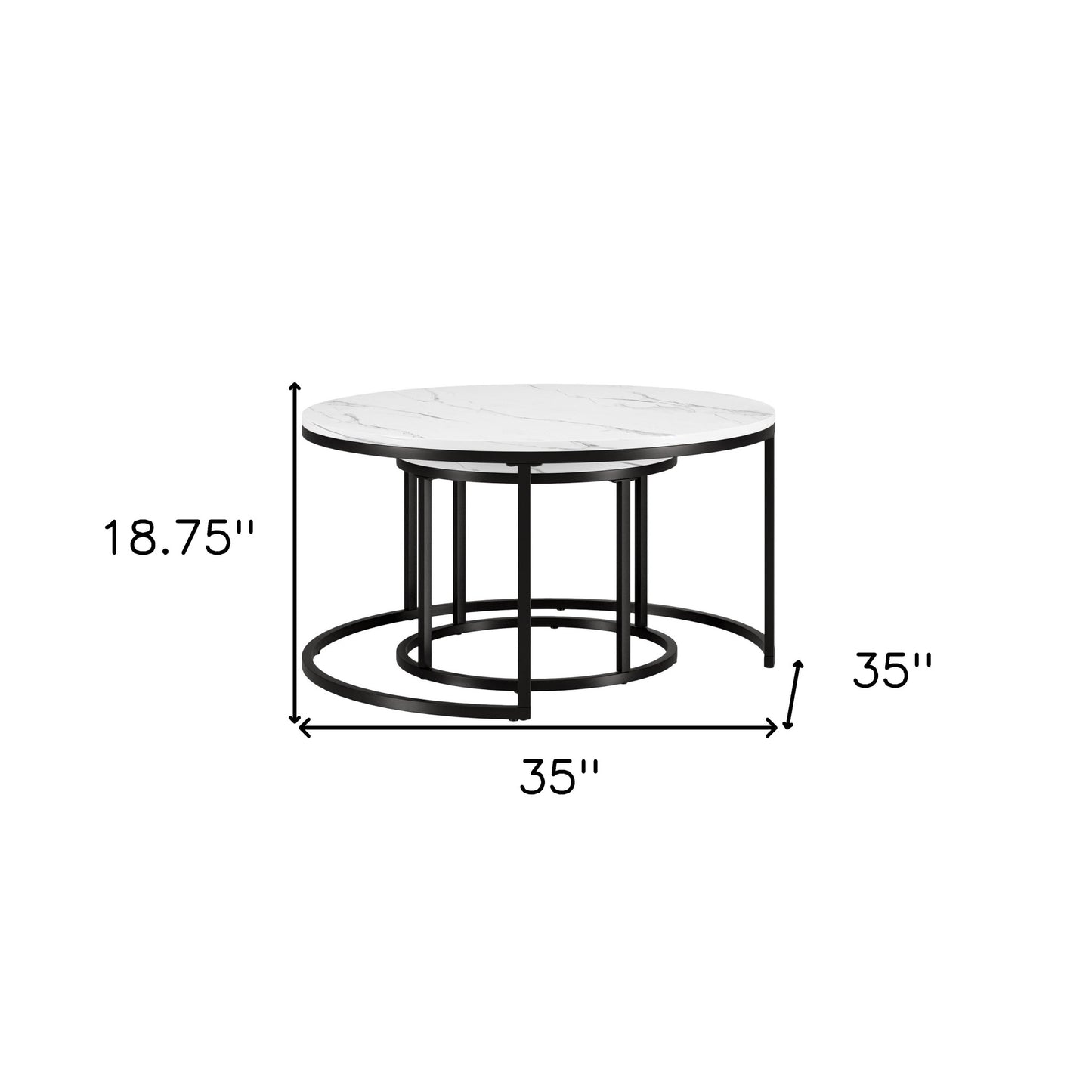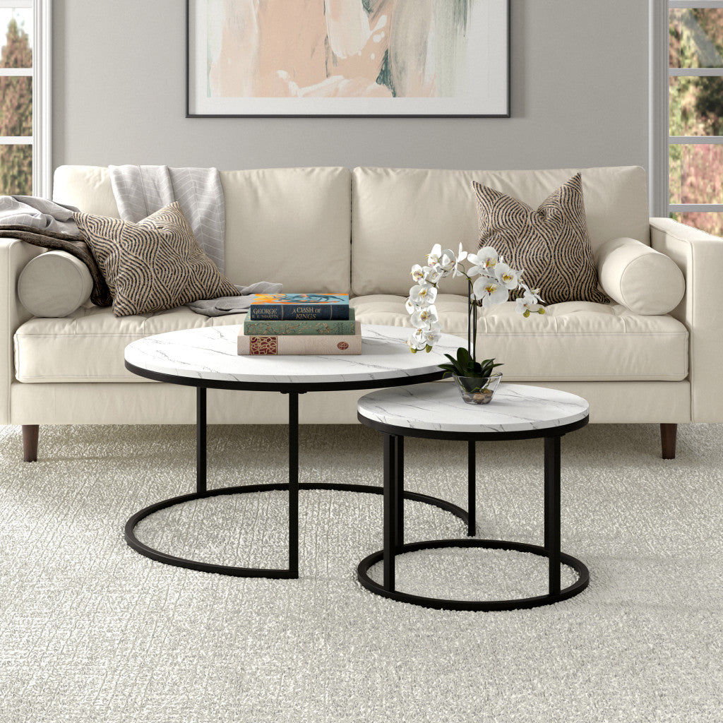 Show off your exquisite taste with this set of two 35-inch white and black faux marble and steel round nested coffee tables. The nesting feature is a great space saver for when not in use. Quality construction from the black steel base combines with white faux marble of the top to give this table a fresh and updated look. This round table features a fresh and stylish shape to give your room a visually pleasing accent. If you're looking for something that can fit into a living area, bedroom, or office, this coffee table is for you. This coffee table is the sturdy, reliable and stylish answer to your living room needs. 18.75-inch H x 35-inch W x 35-inch D
